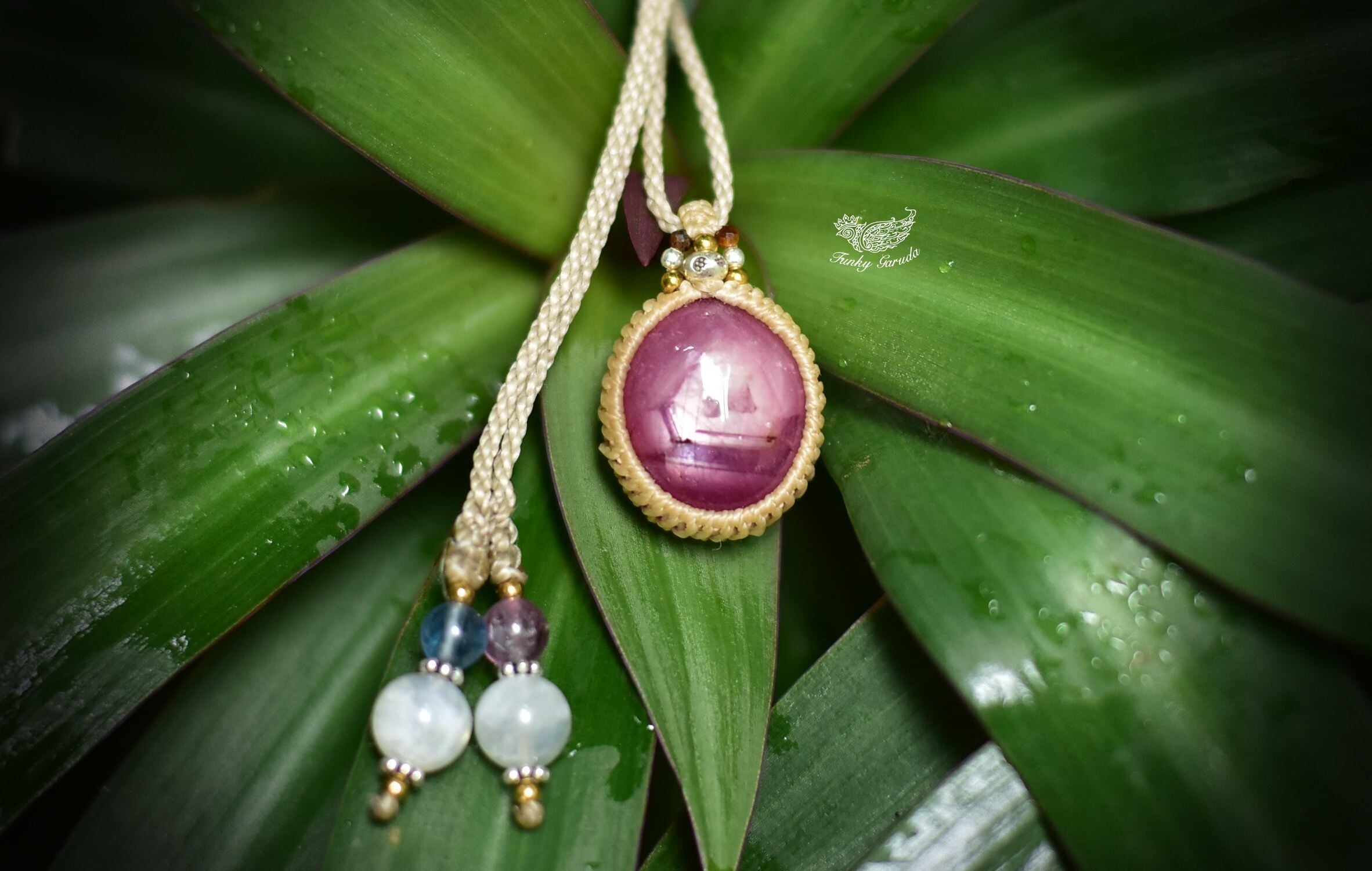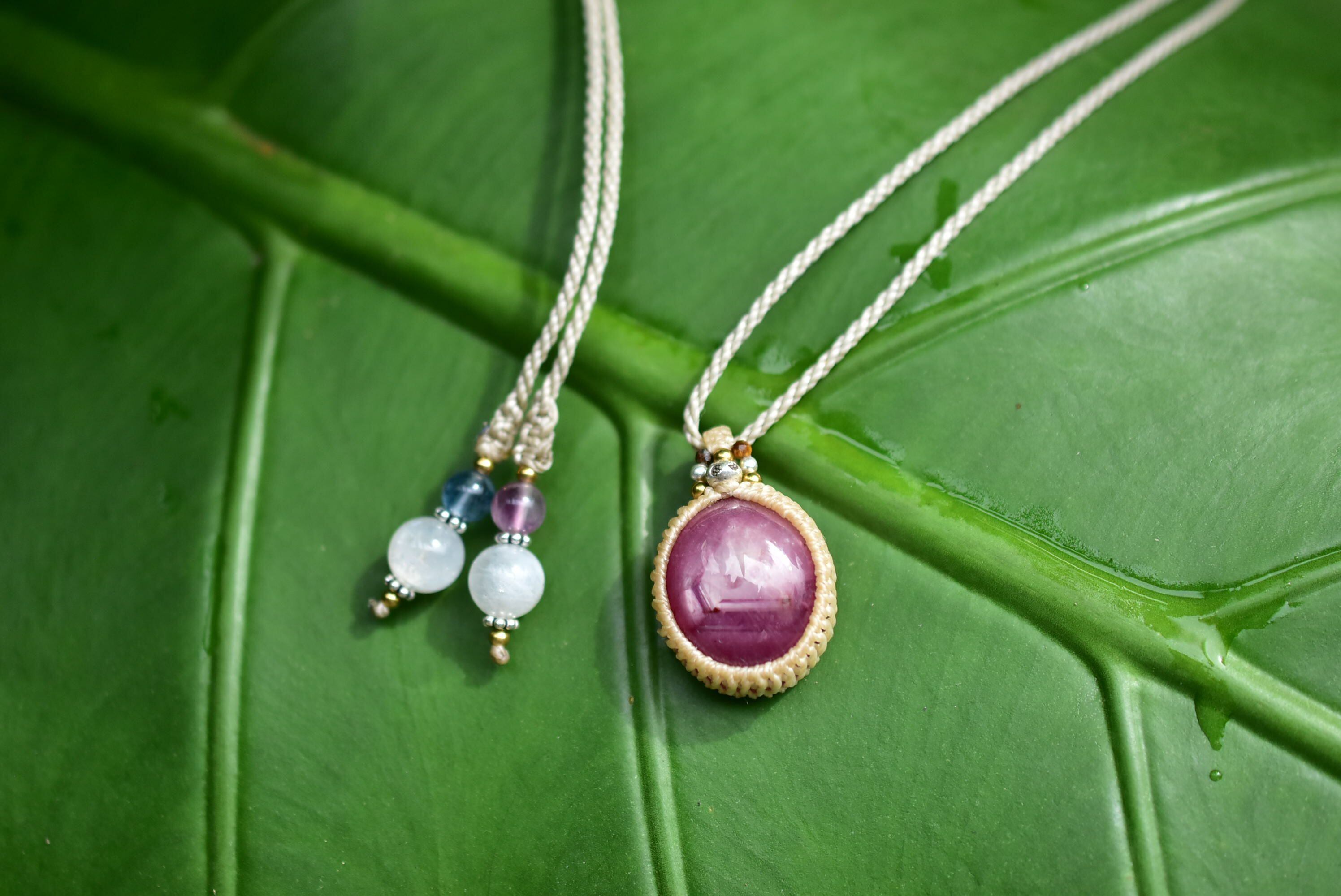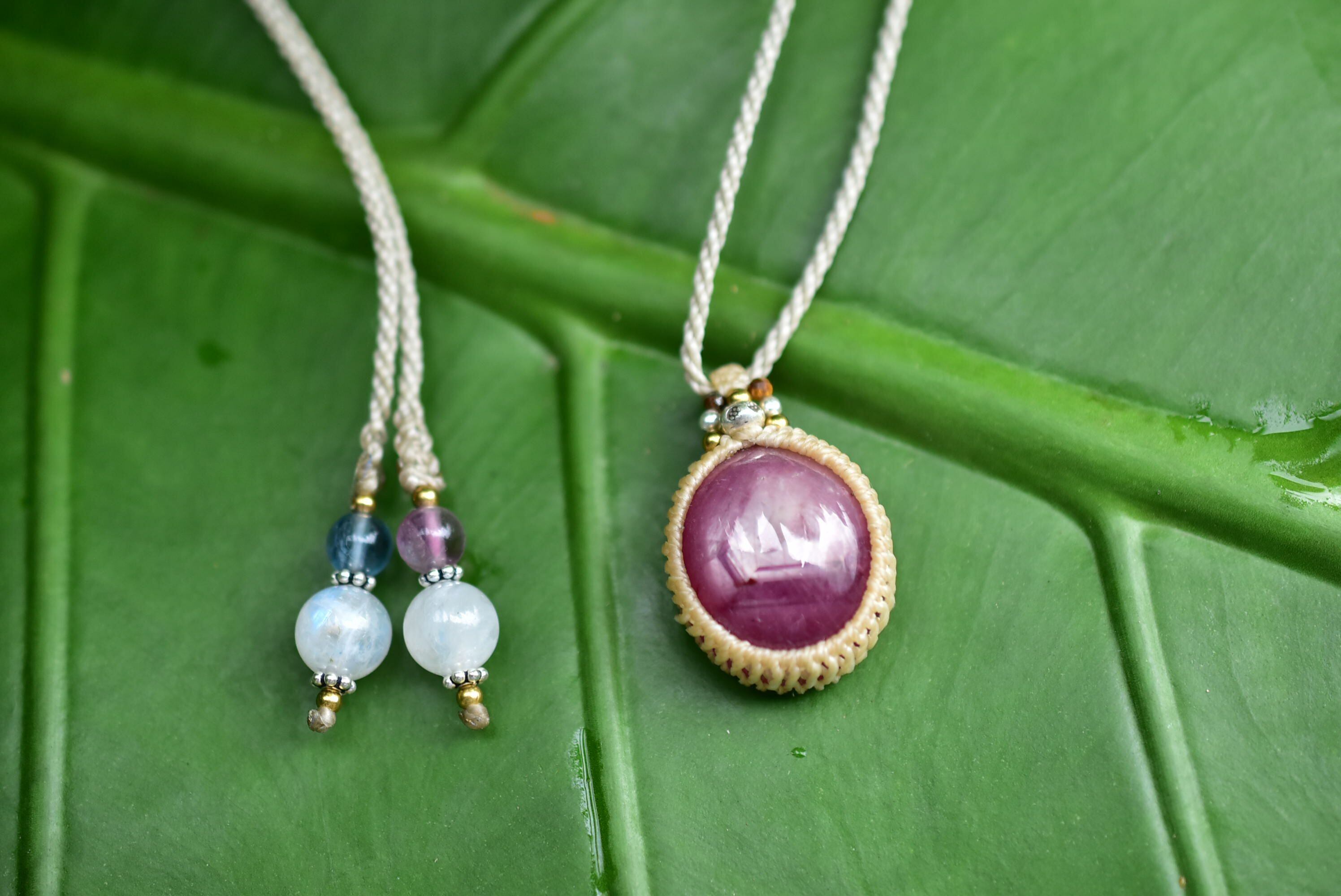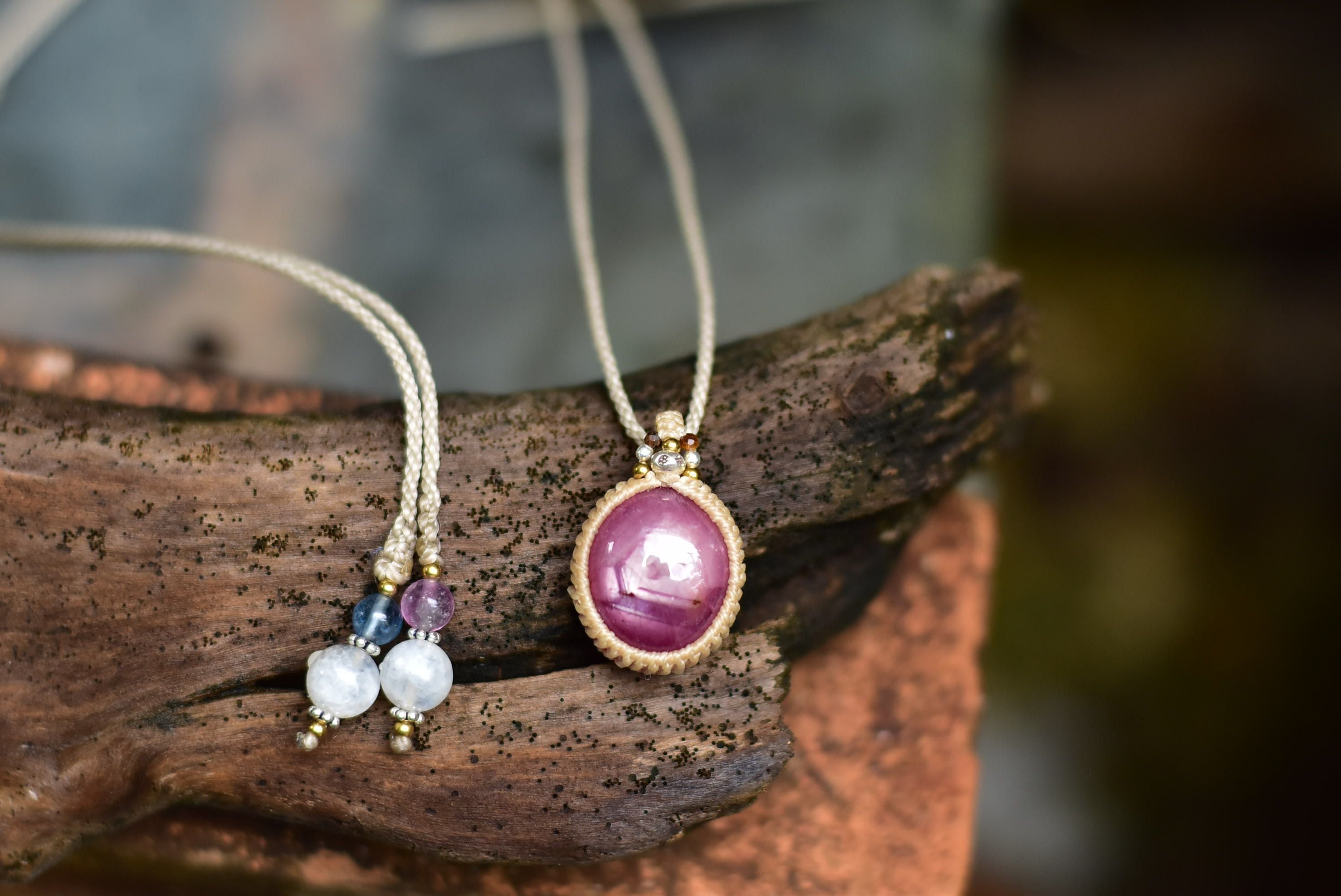 個性的な表情を持つルビーを、シンプルにマクラメ編みにて仕上げました。