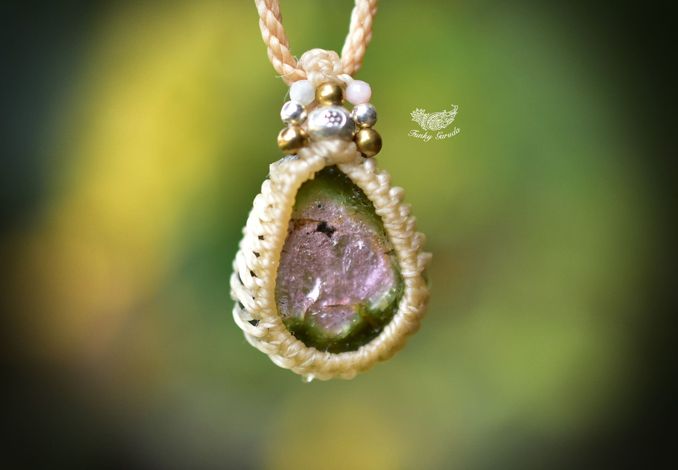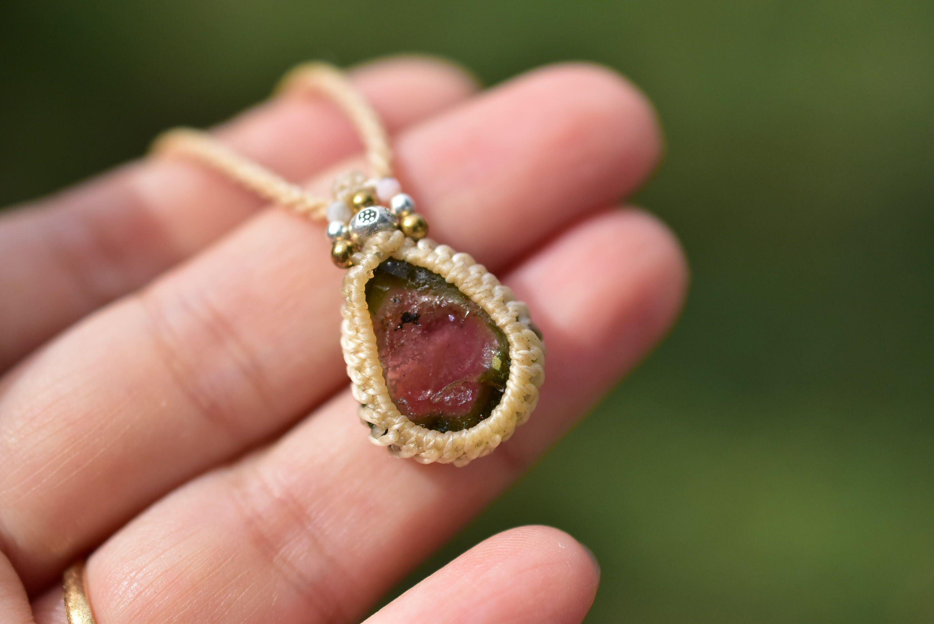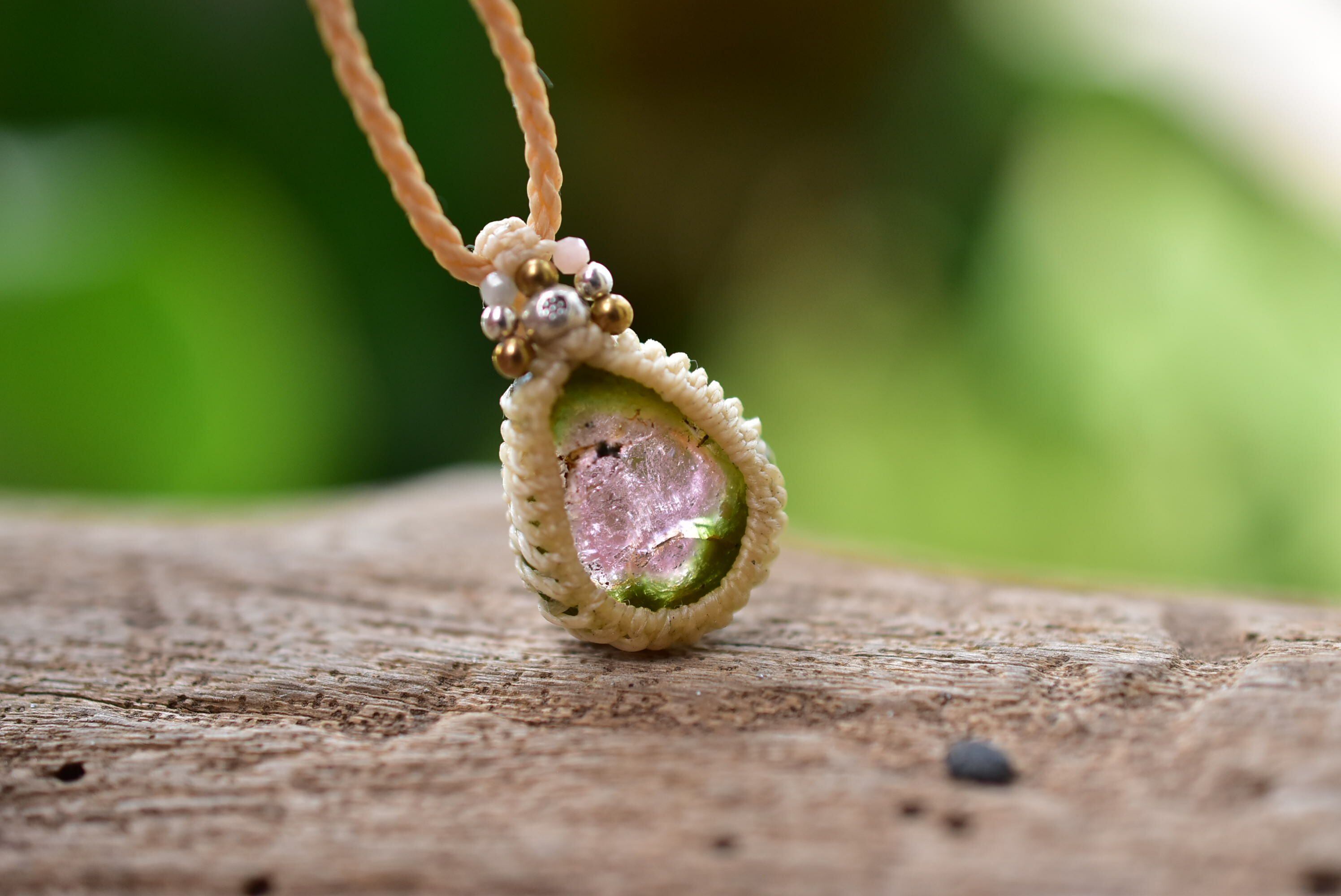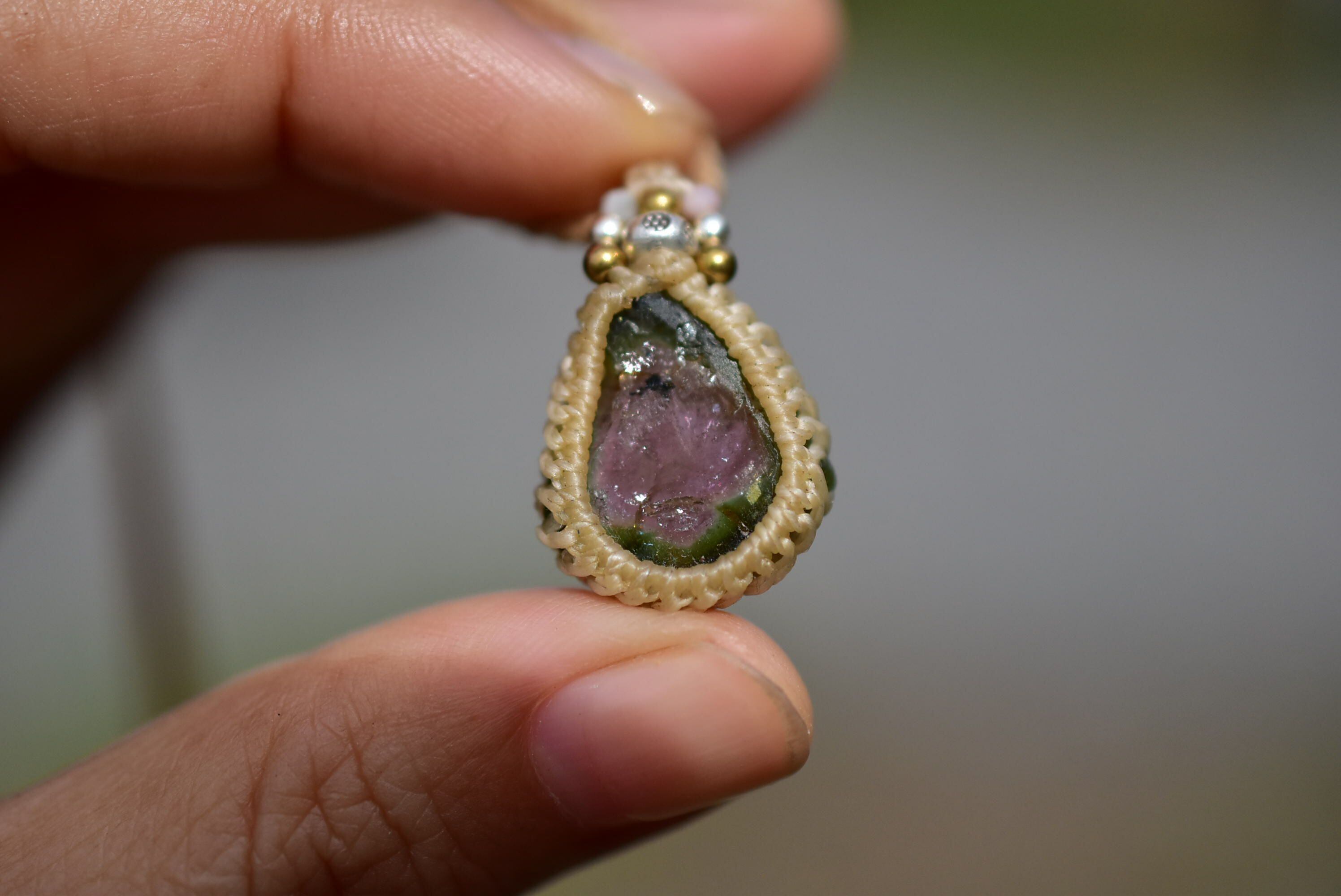 このたびは初めて、ウォーターメロントルマリンをマクラメ編みペンダントに仕上げています。