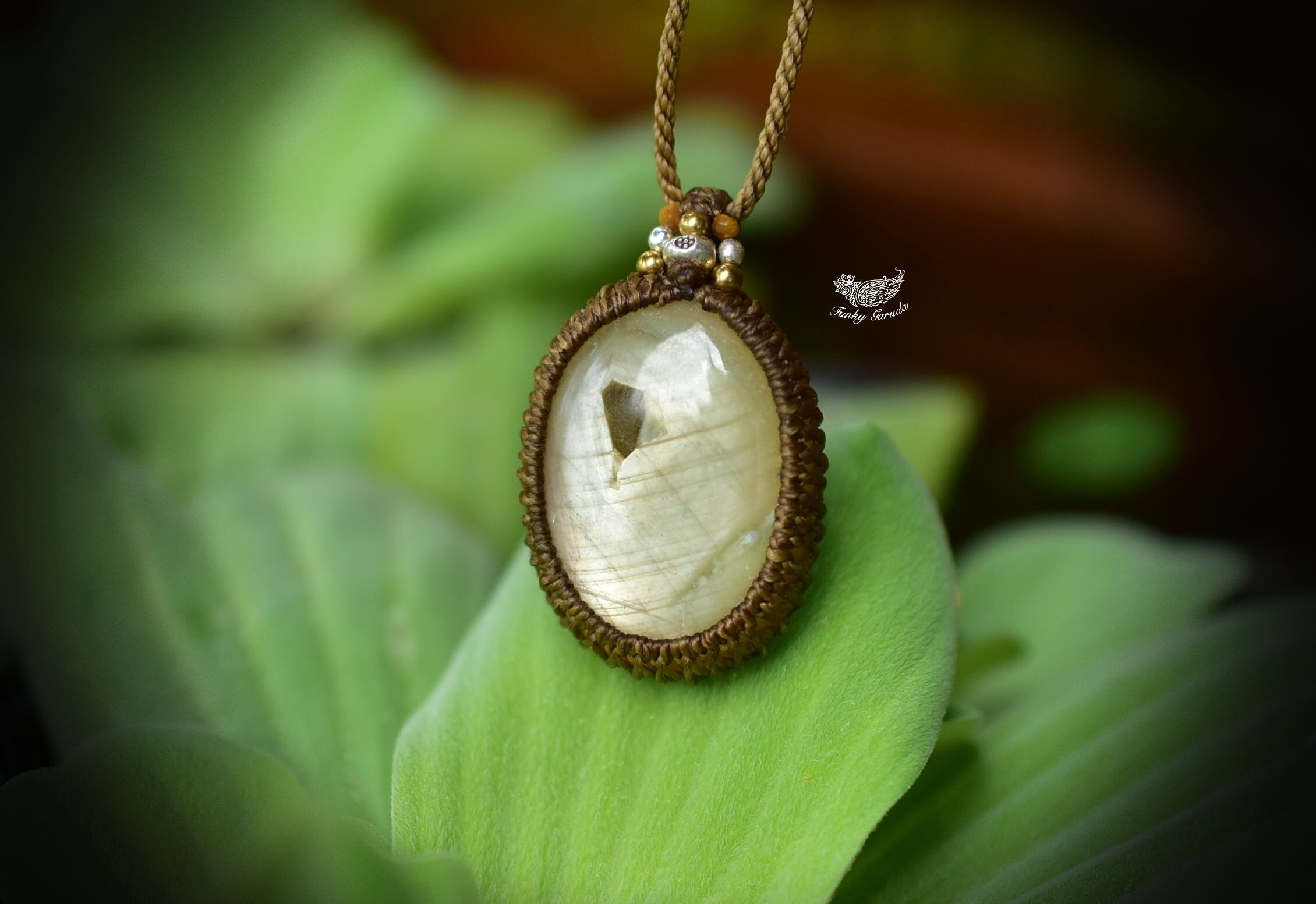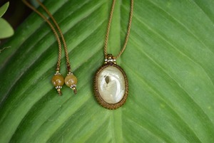 ◆このたびはゴールドブラウン色の蝋引き糸を使用しマクラメ編み装飾を施しました。