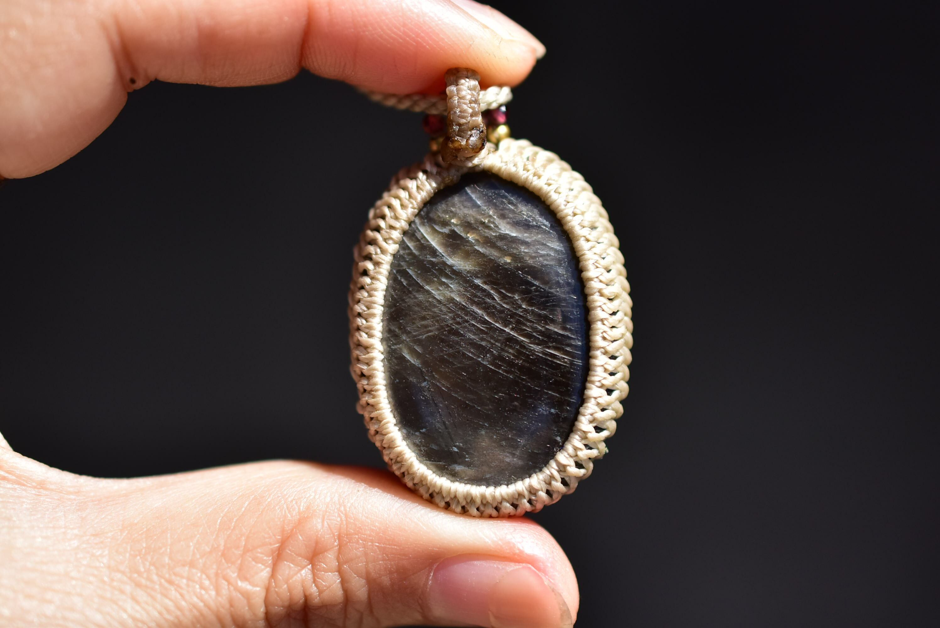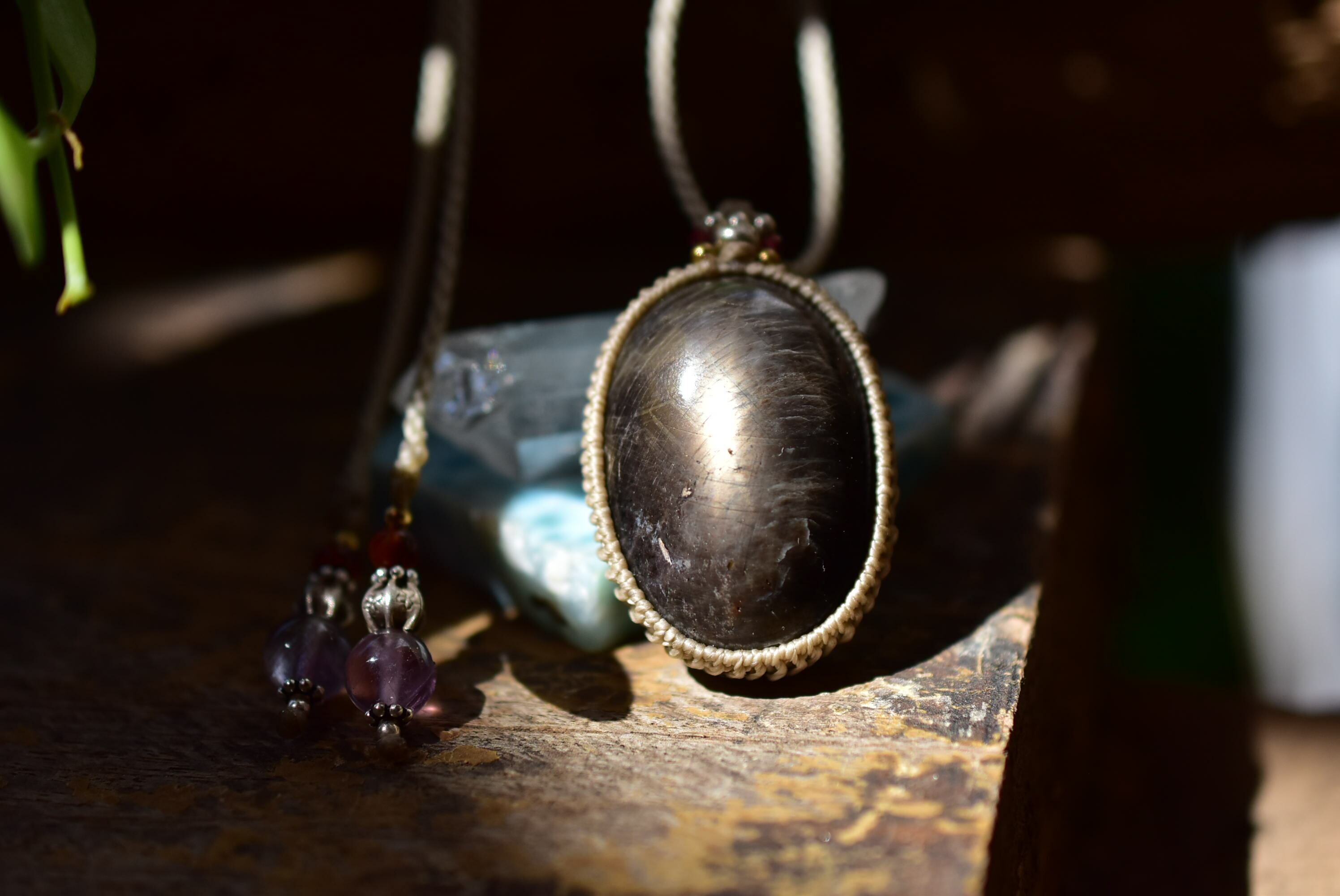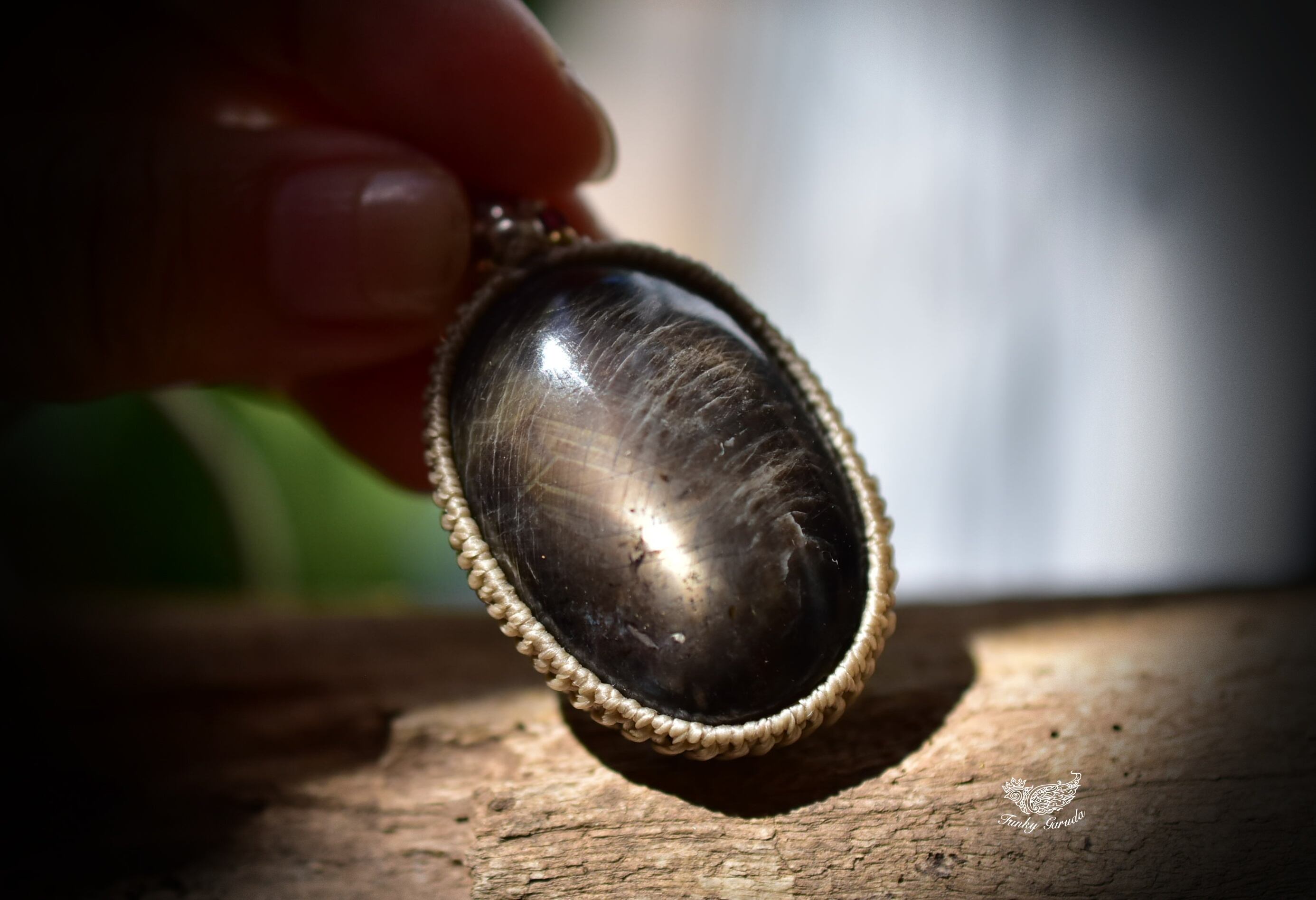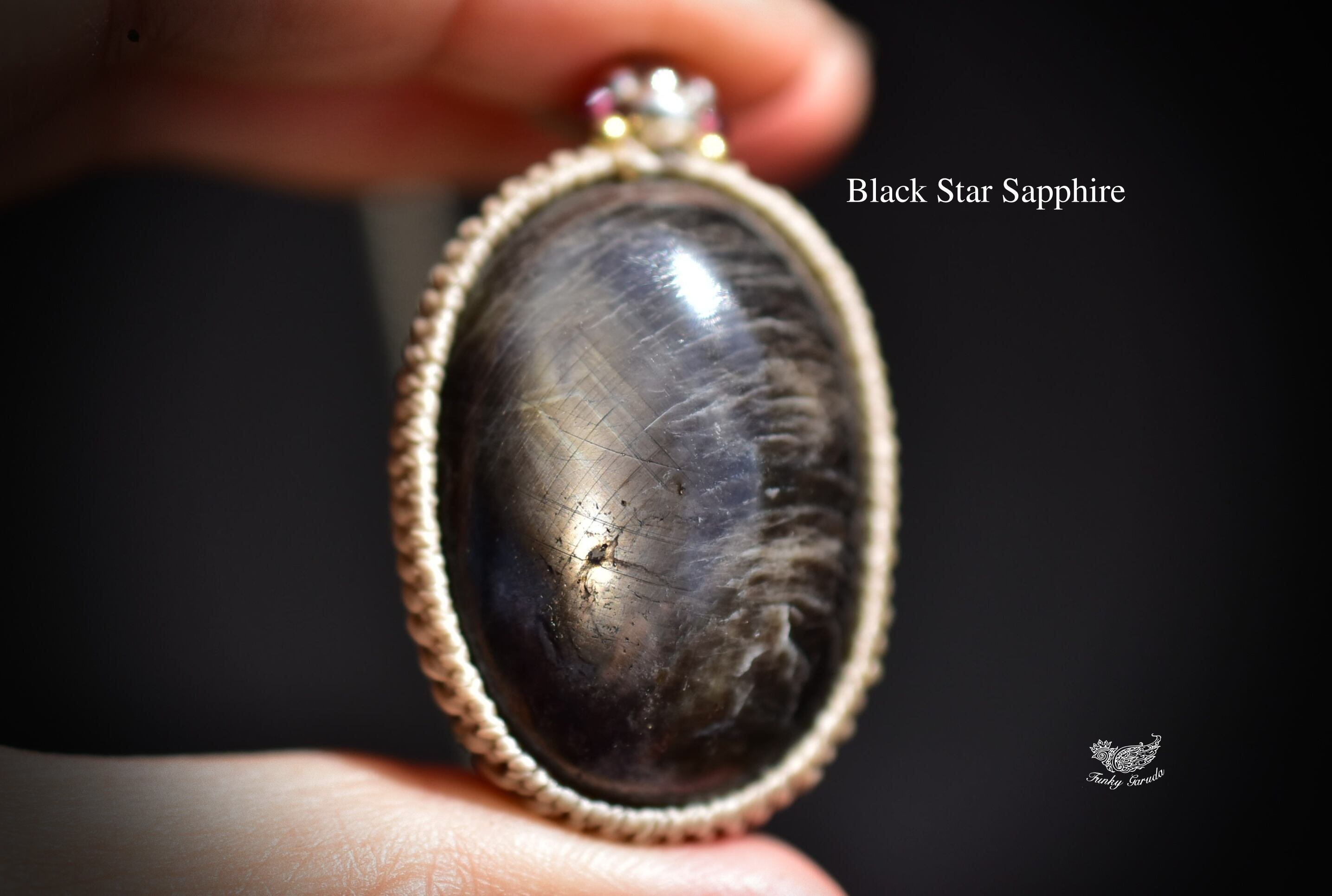 光る存在感★135ct★ブラックスターサファイア マクラメペンダント61