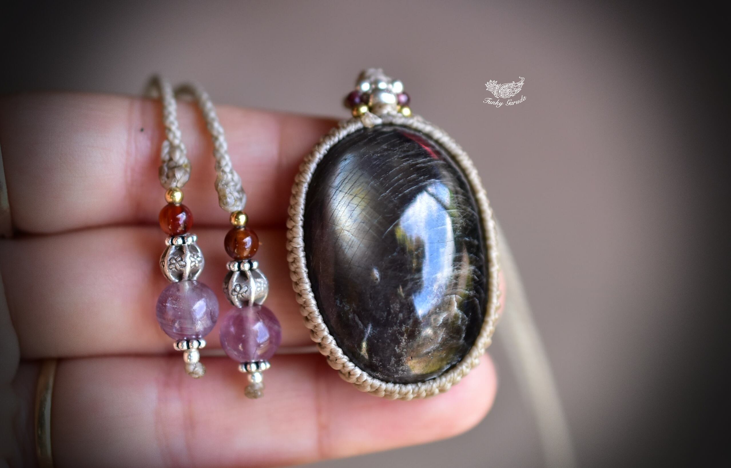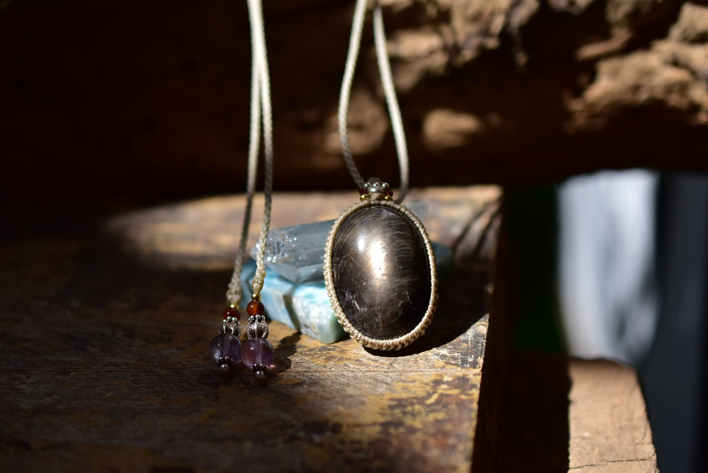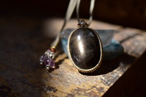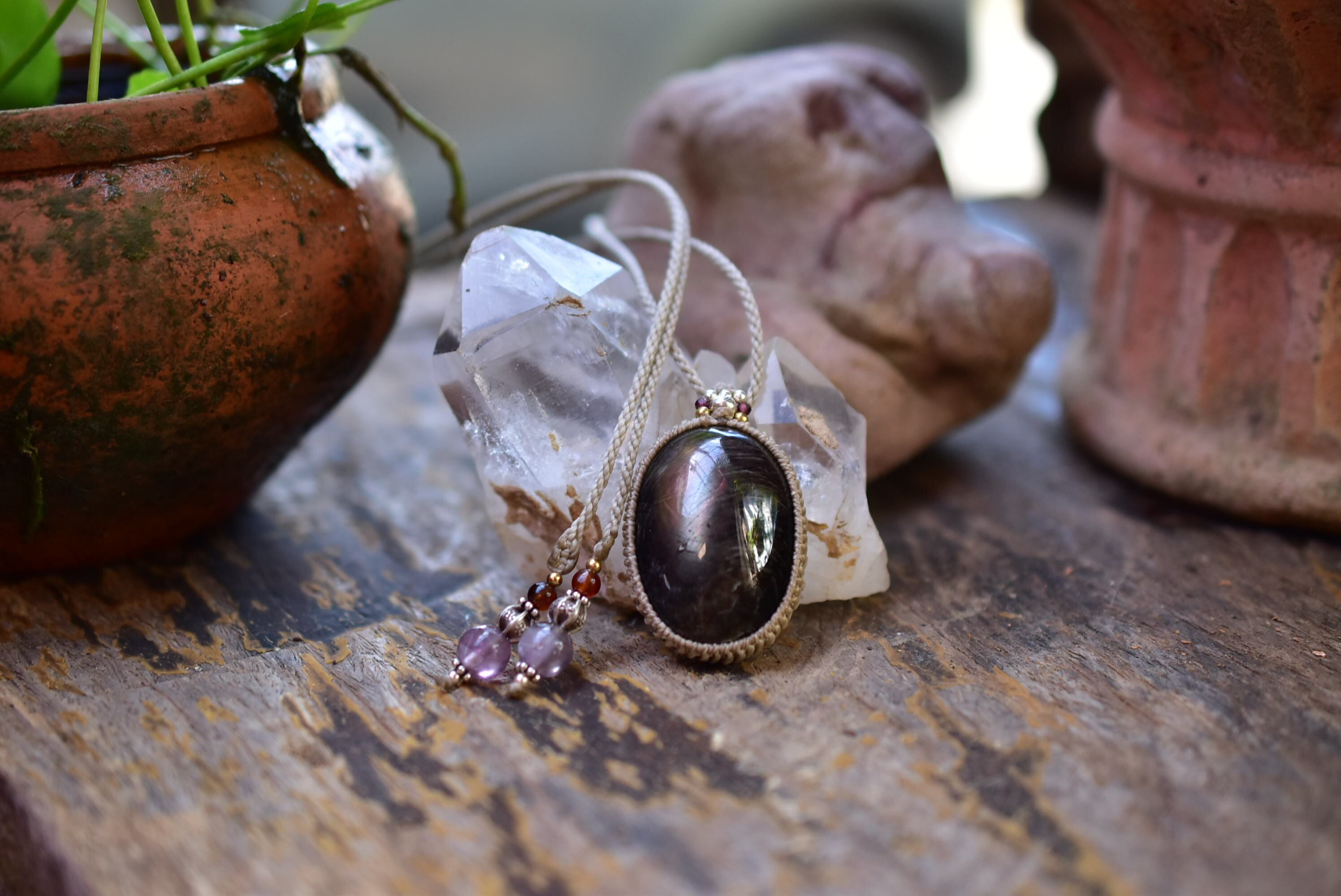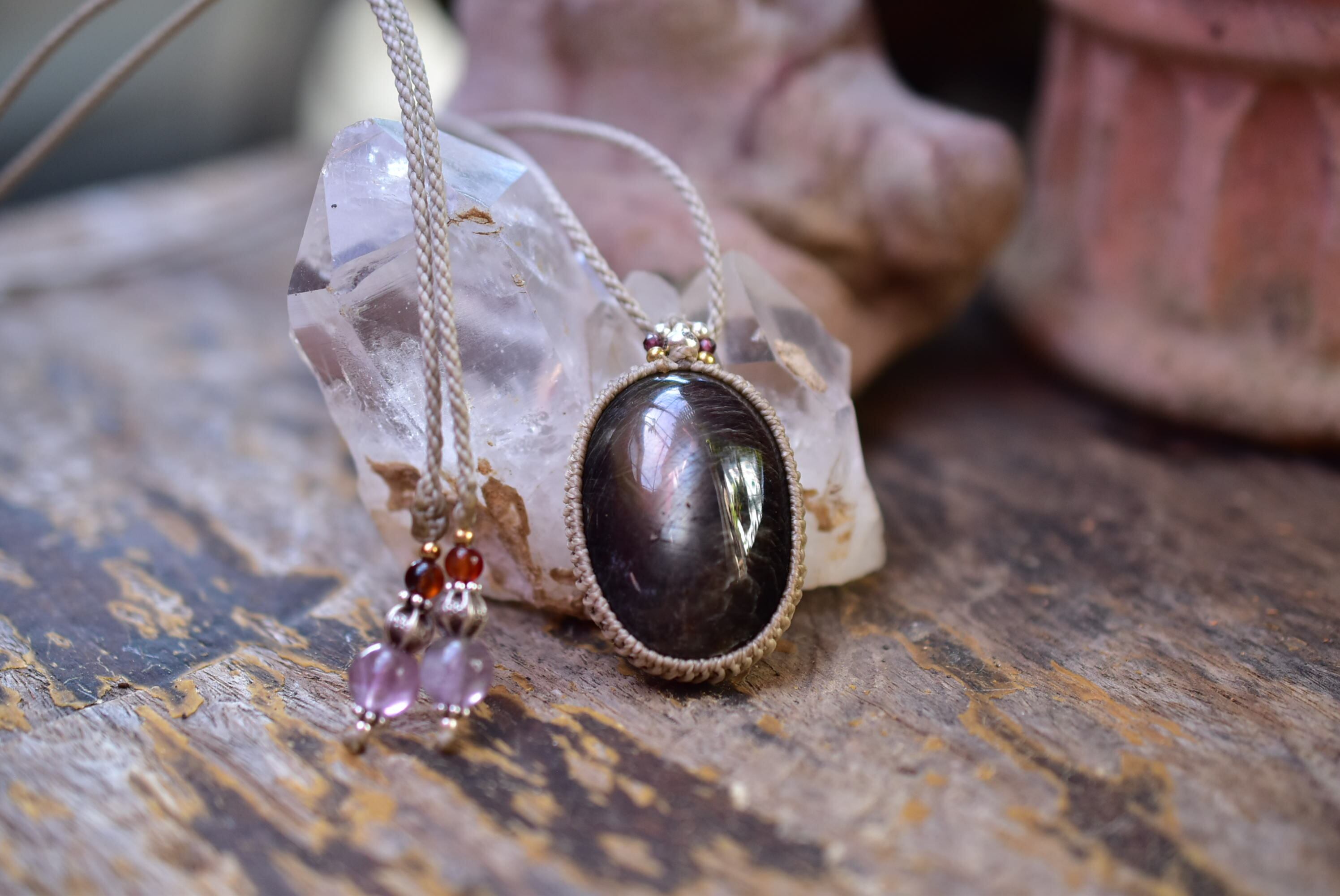 光る存在感★135ct★ブラックスターサファイア マクラメペンダント61