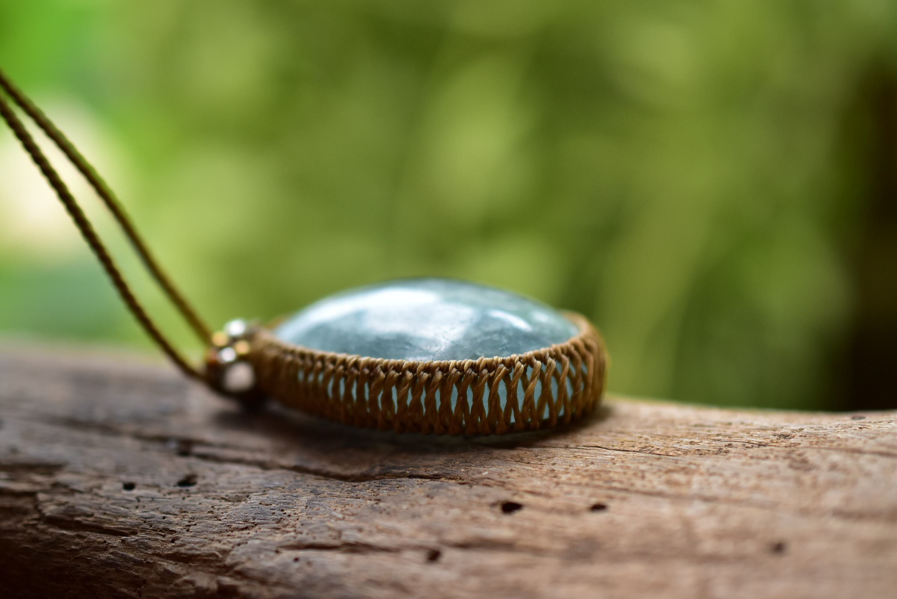 ◆このたびはゴールドブラウン色の蝋引き糸を使用しマクラメ編み装飾を施しました。