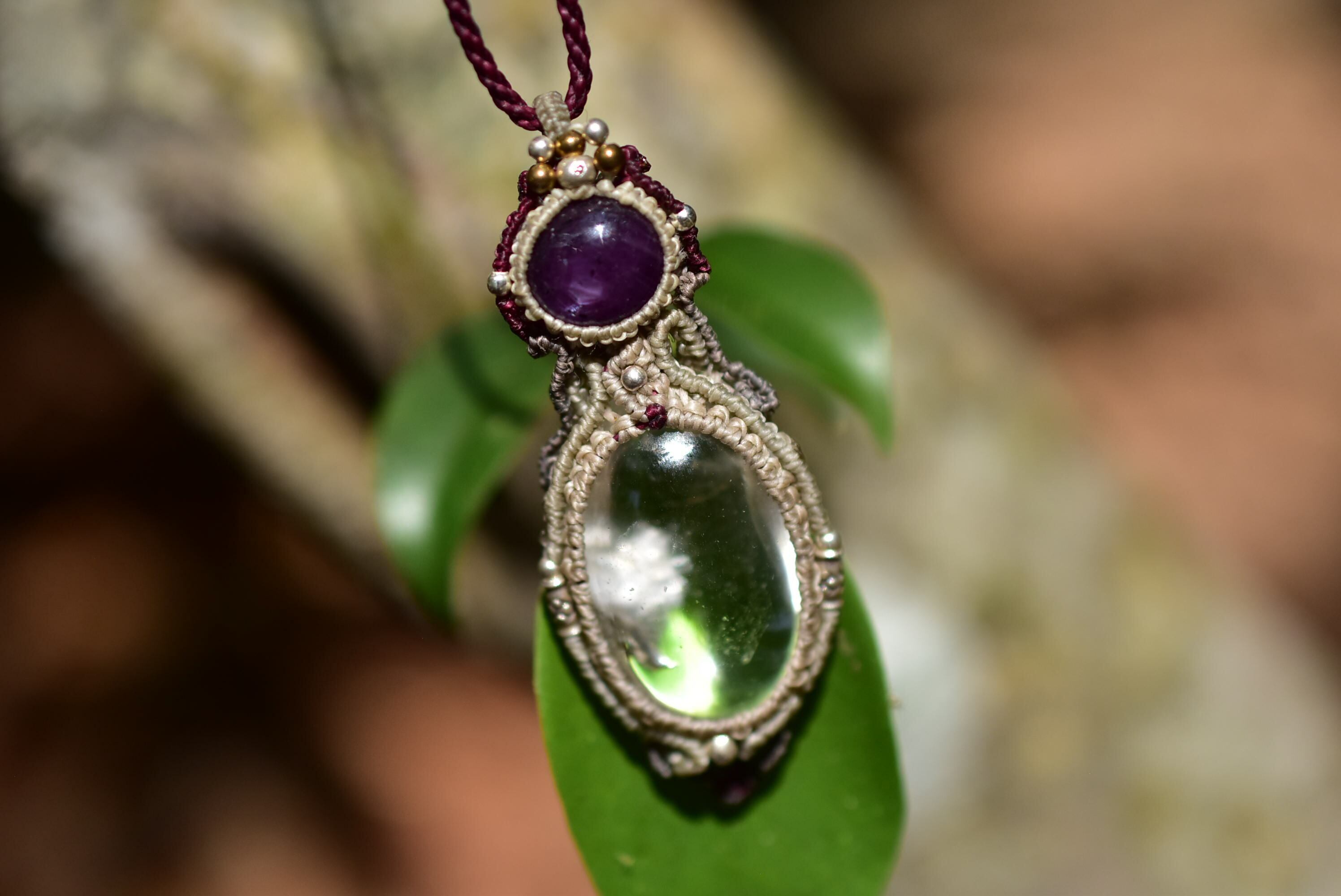 ◆このたびはボルドー、リネン、カフェオレ、ダブグレイ色の蝋引き糸を使用しマクラメ編み装飾を施しました。