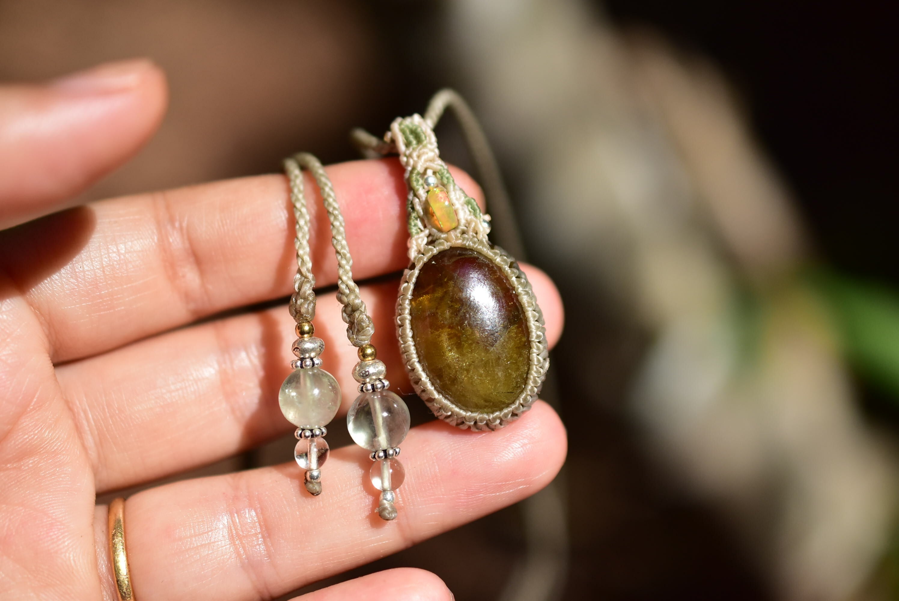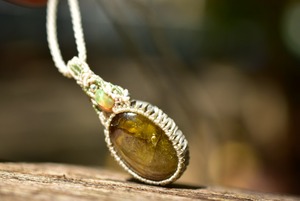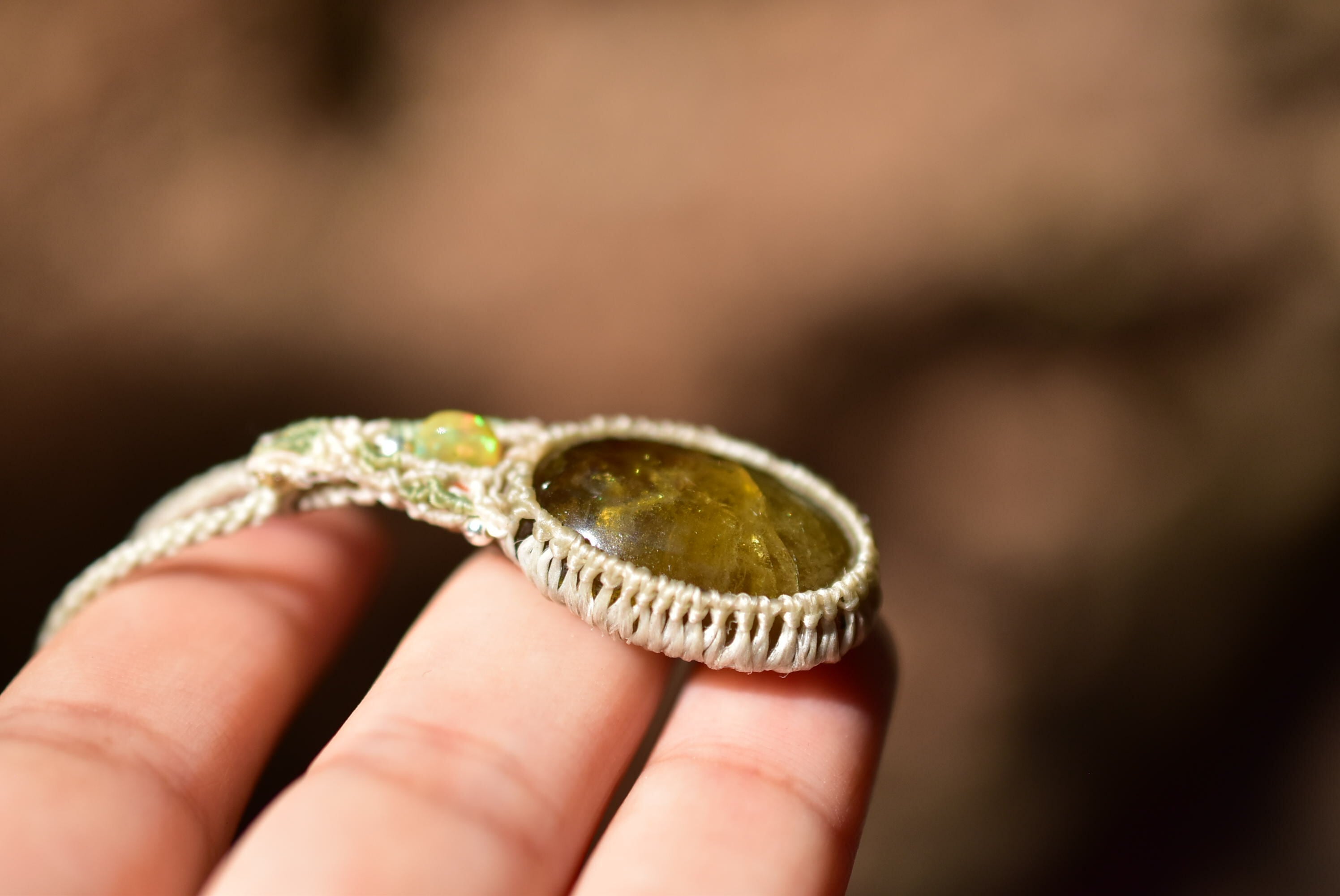 ◆このたびはヘンプ、ピーコックグリーン色の蝋引き糸を使用しマクラメ編み装飾を施しました。