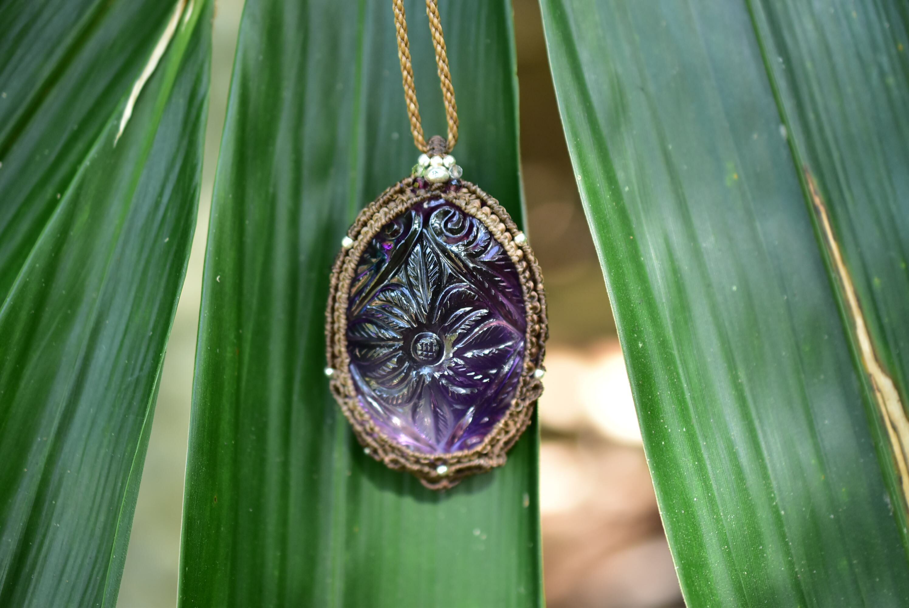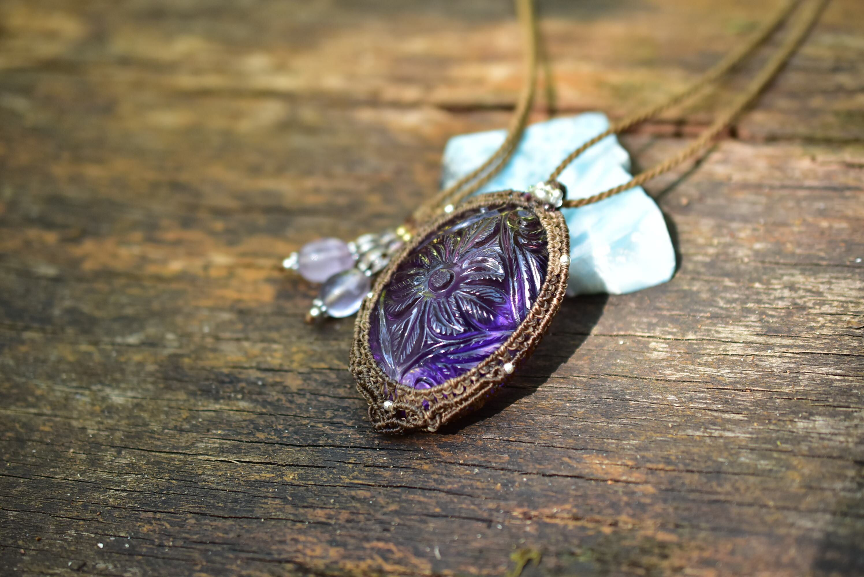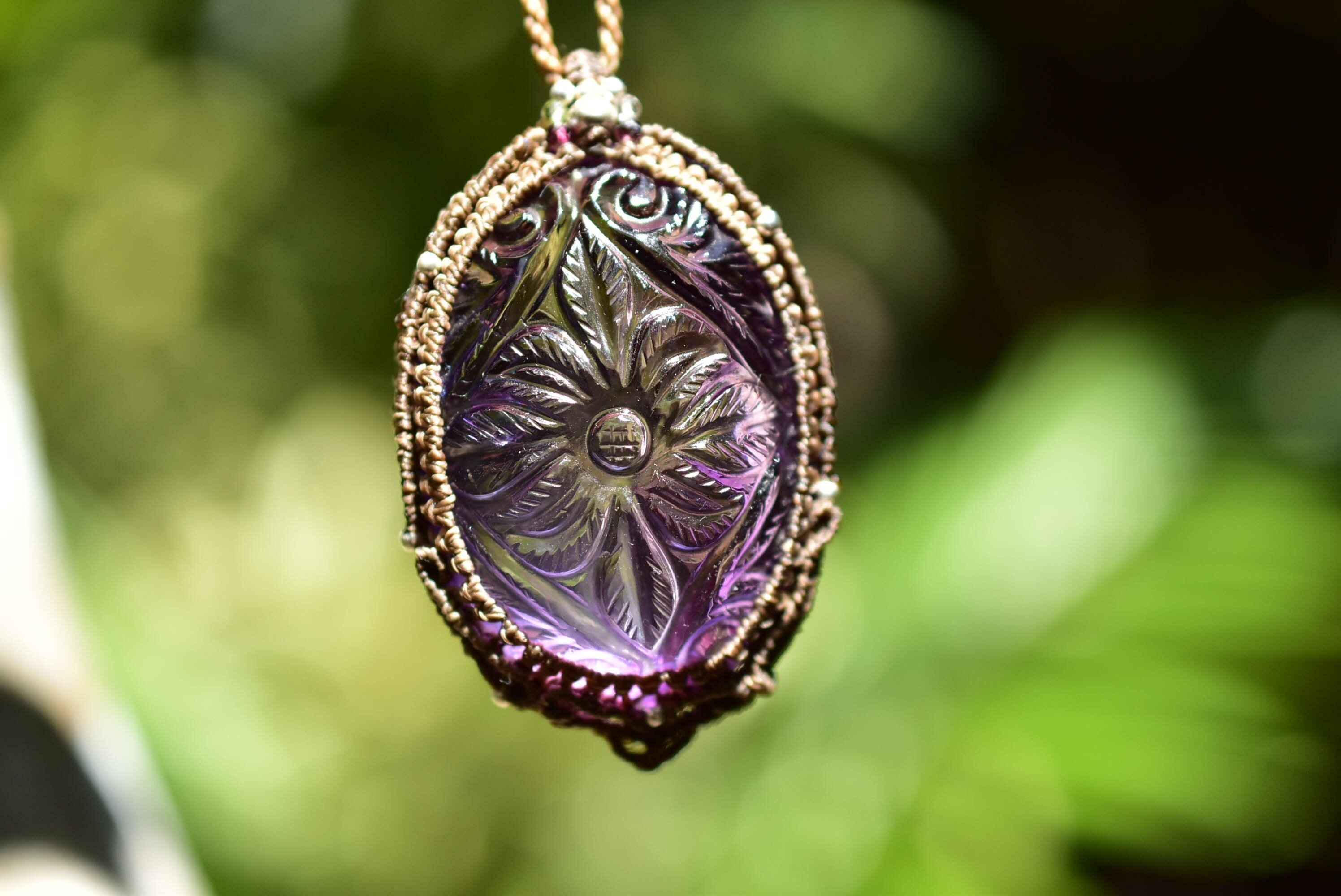 大粒★虹入り★カービング★アメジストマクラメペンダント84