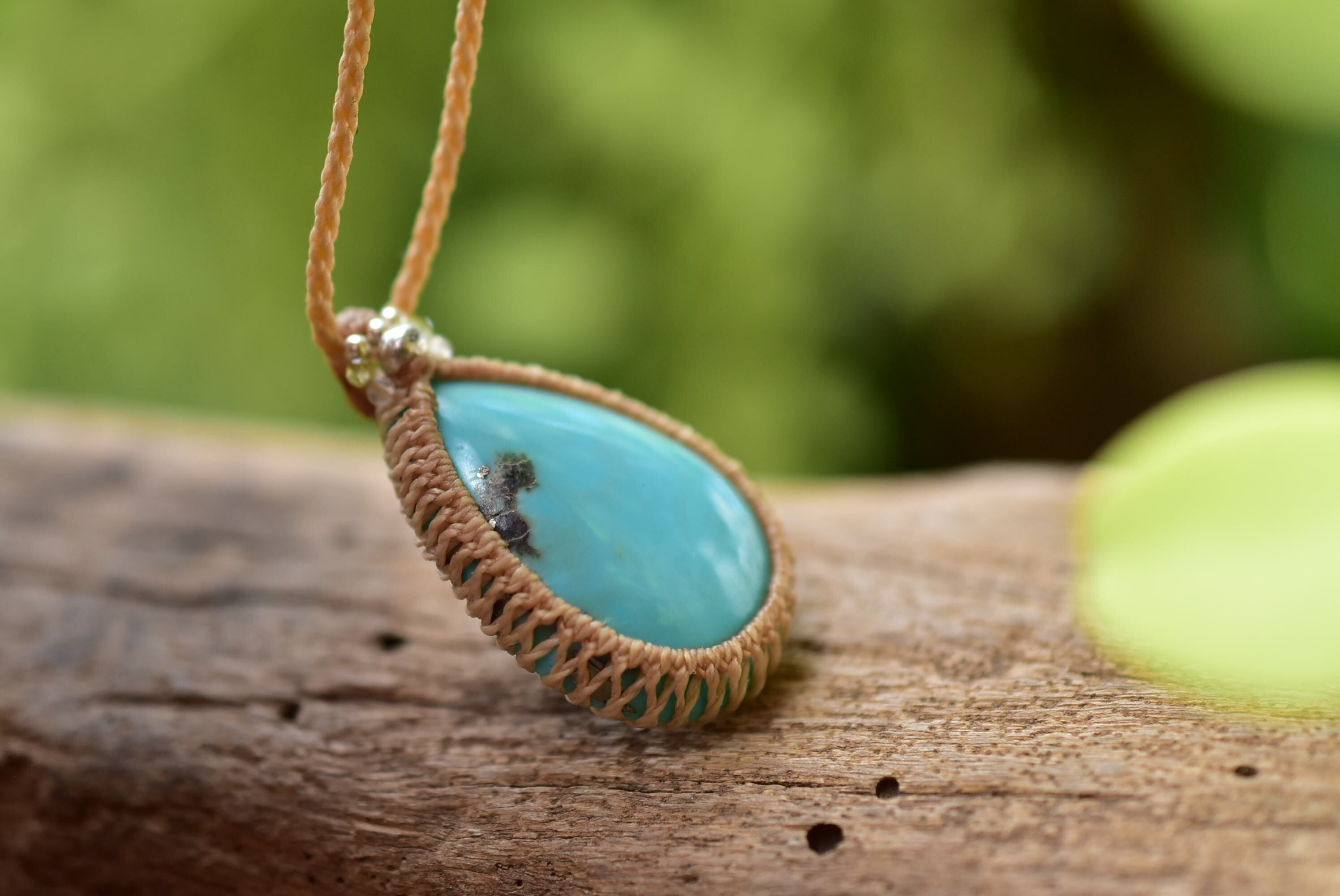 ◆このたびはキャラメル色の蝋引き糸を使用しマクラメ編み装飾を施しました。