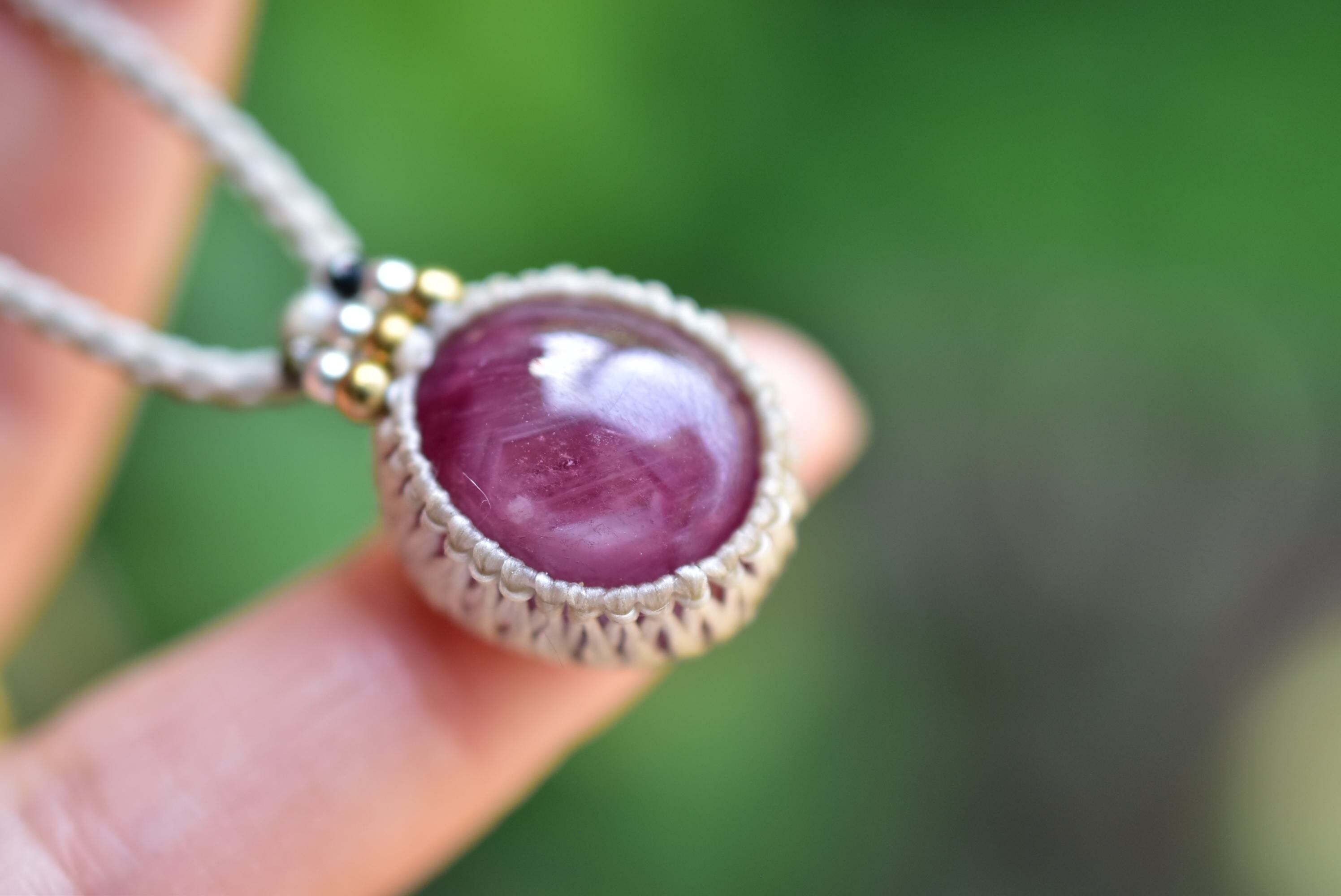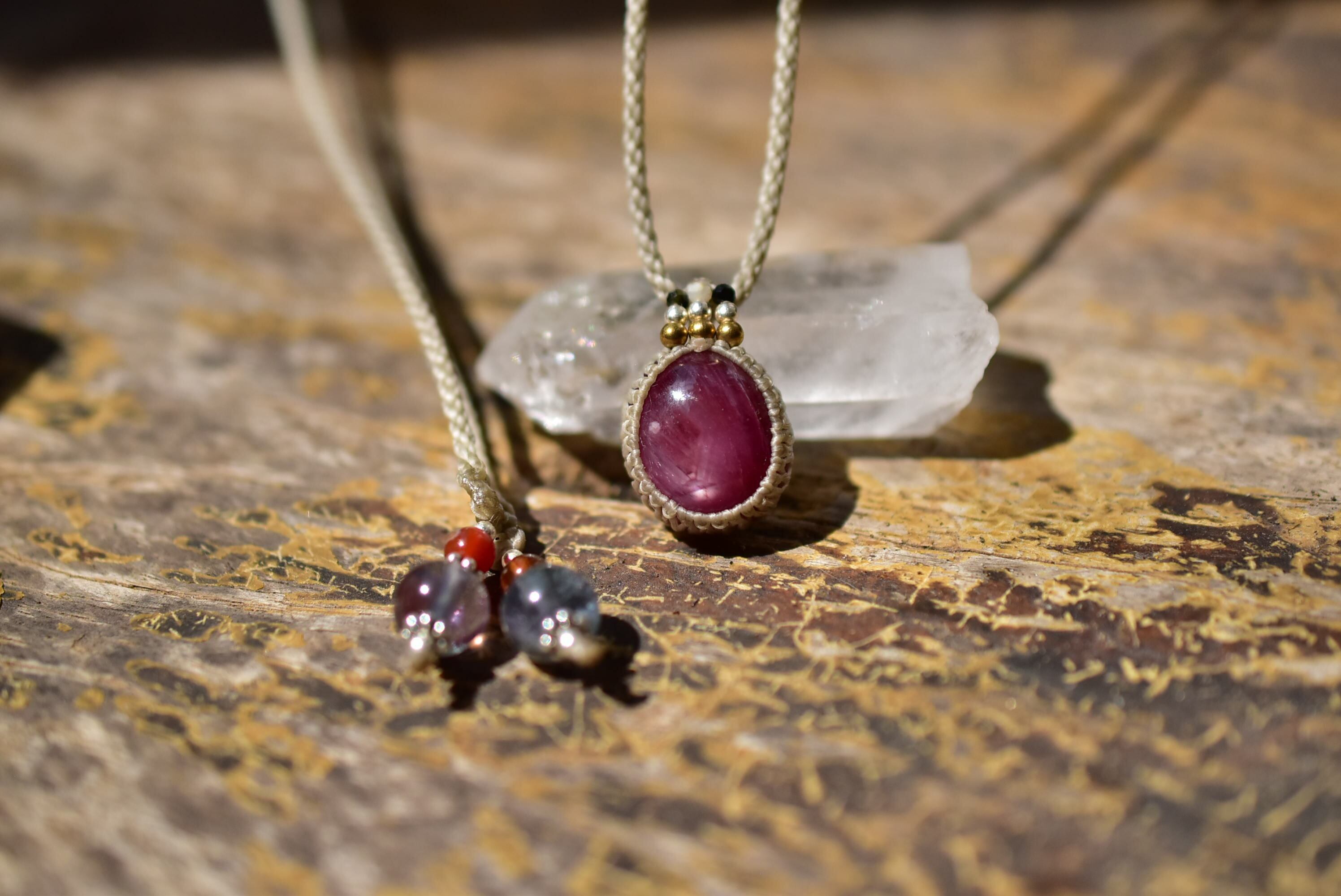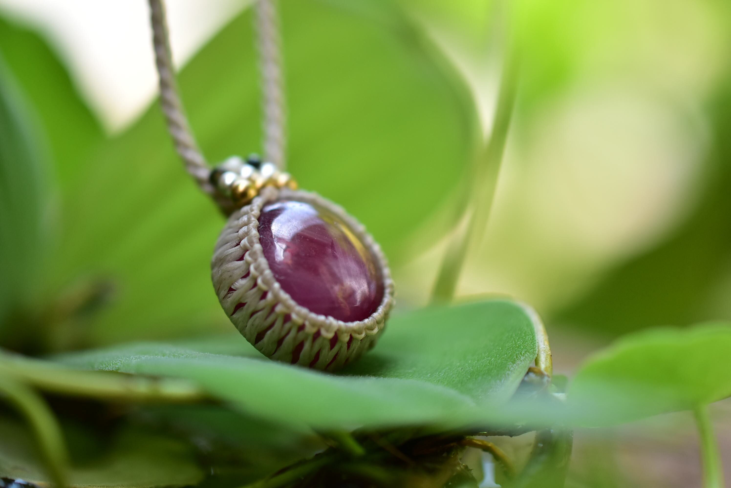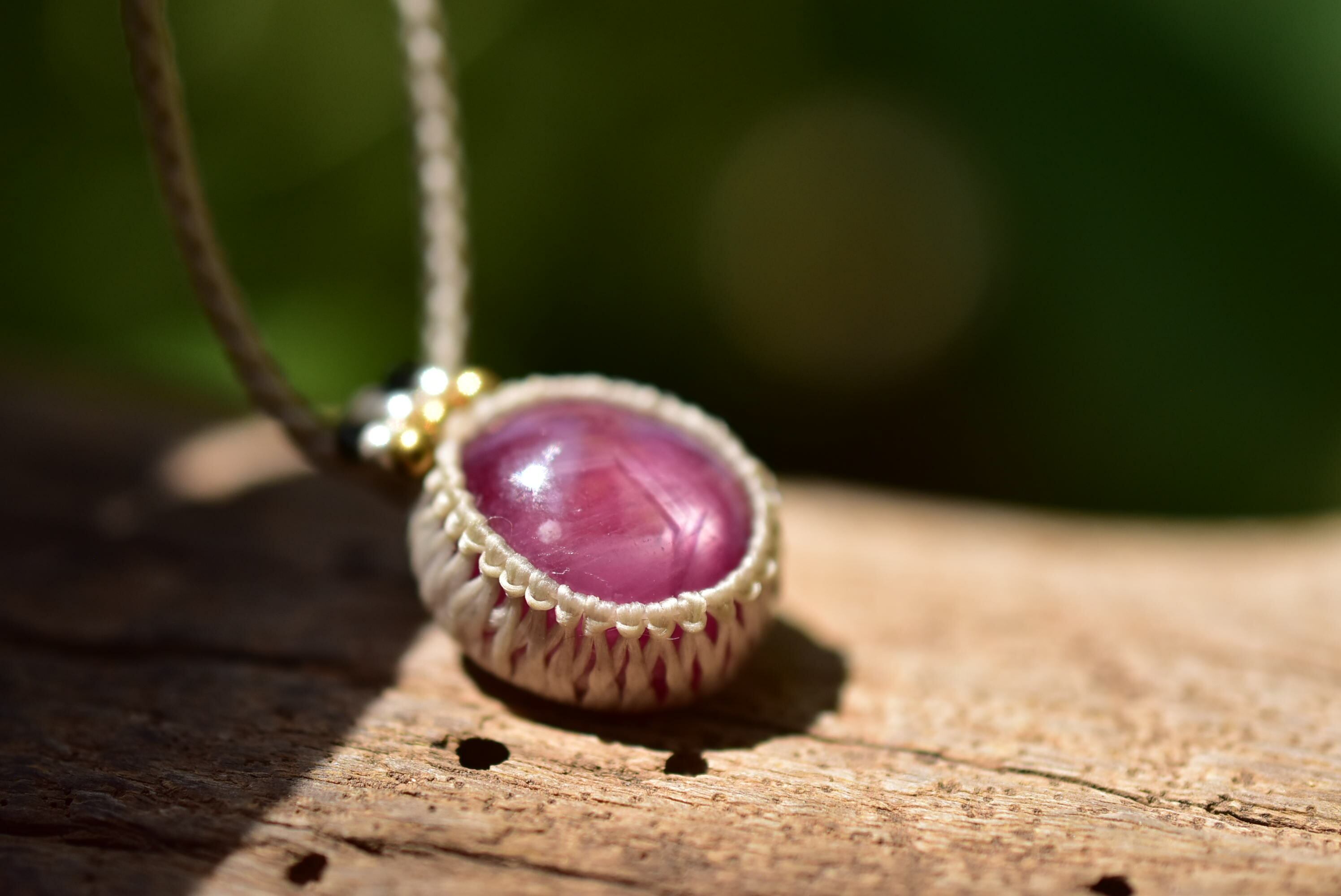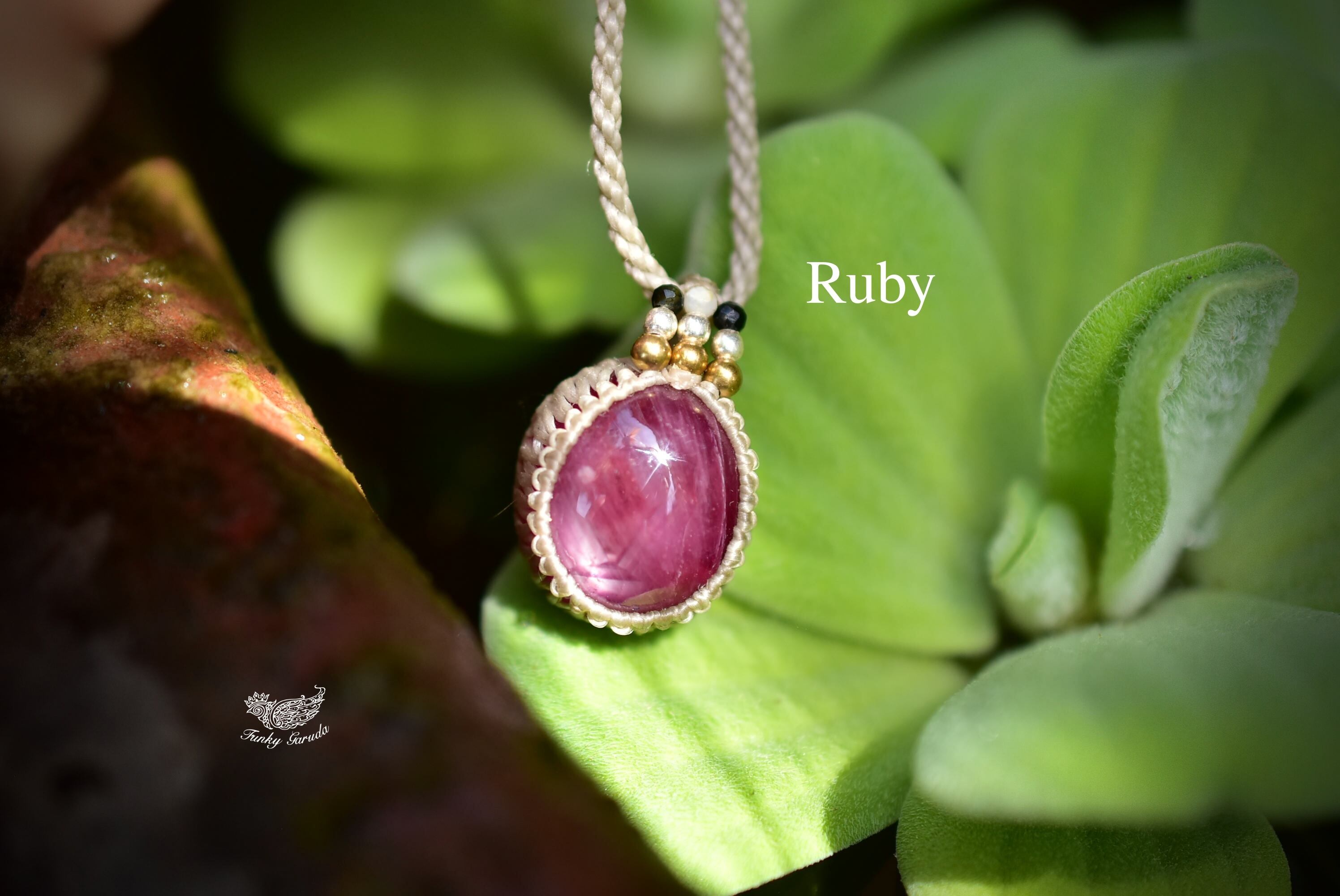 良質なルビーを、シンプルにマクラメ編みにて仕上げました。