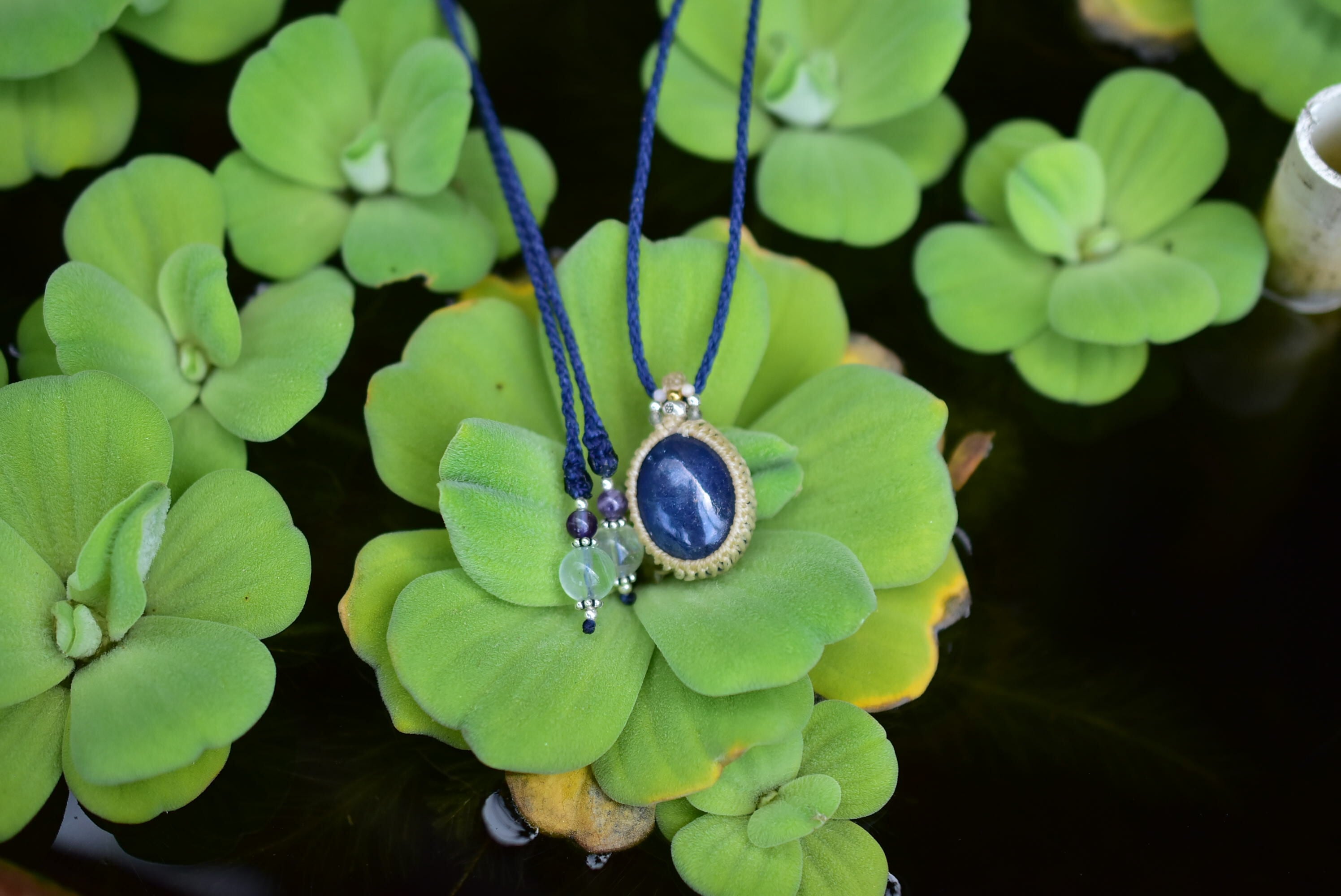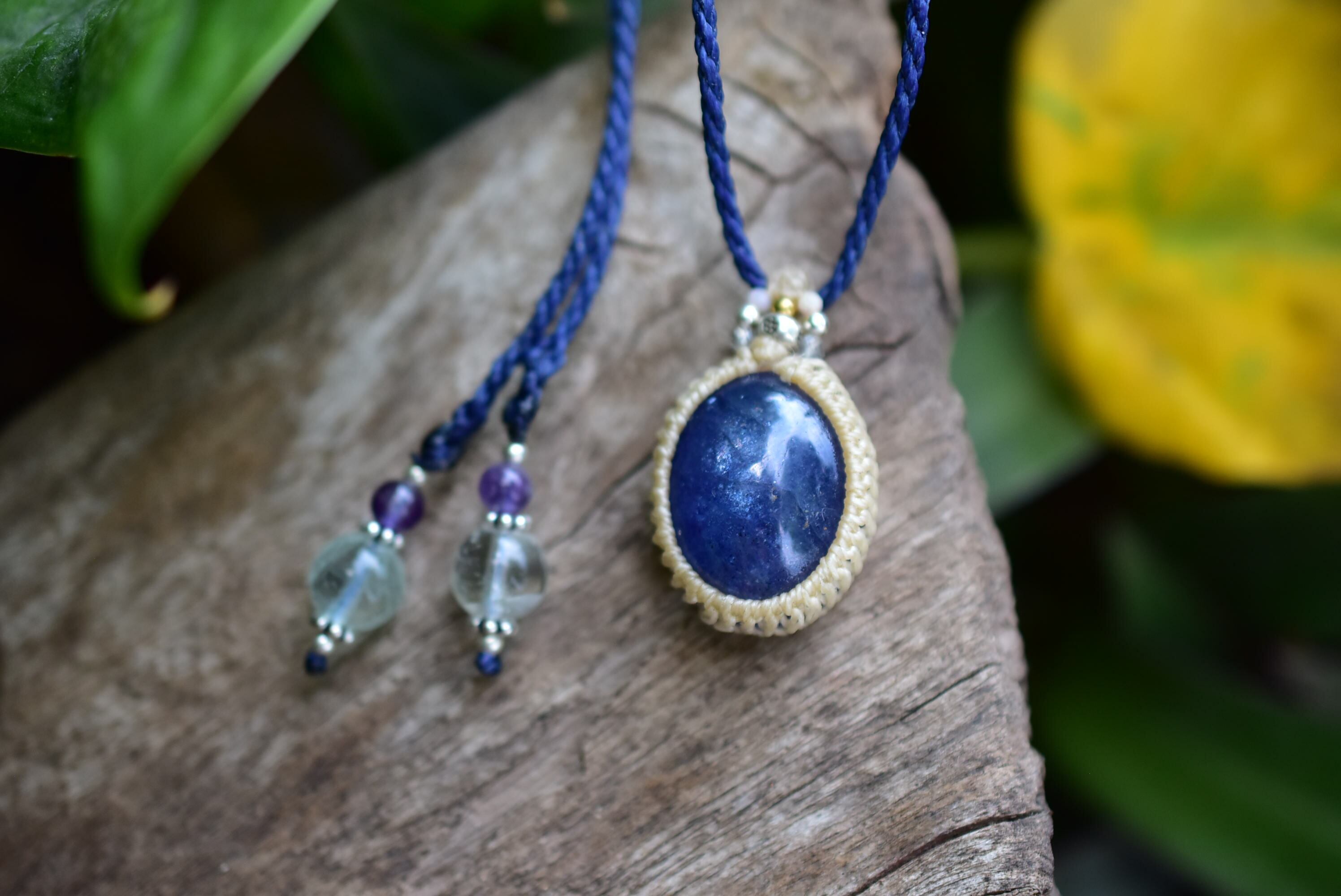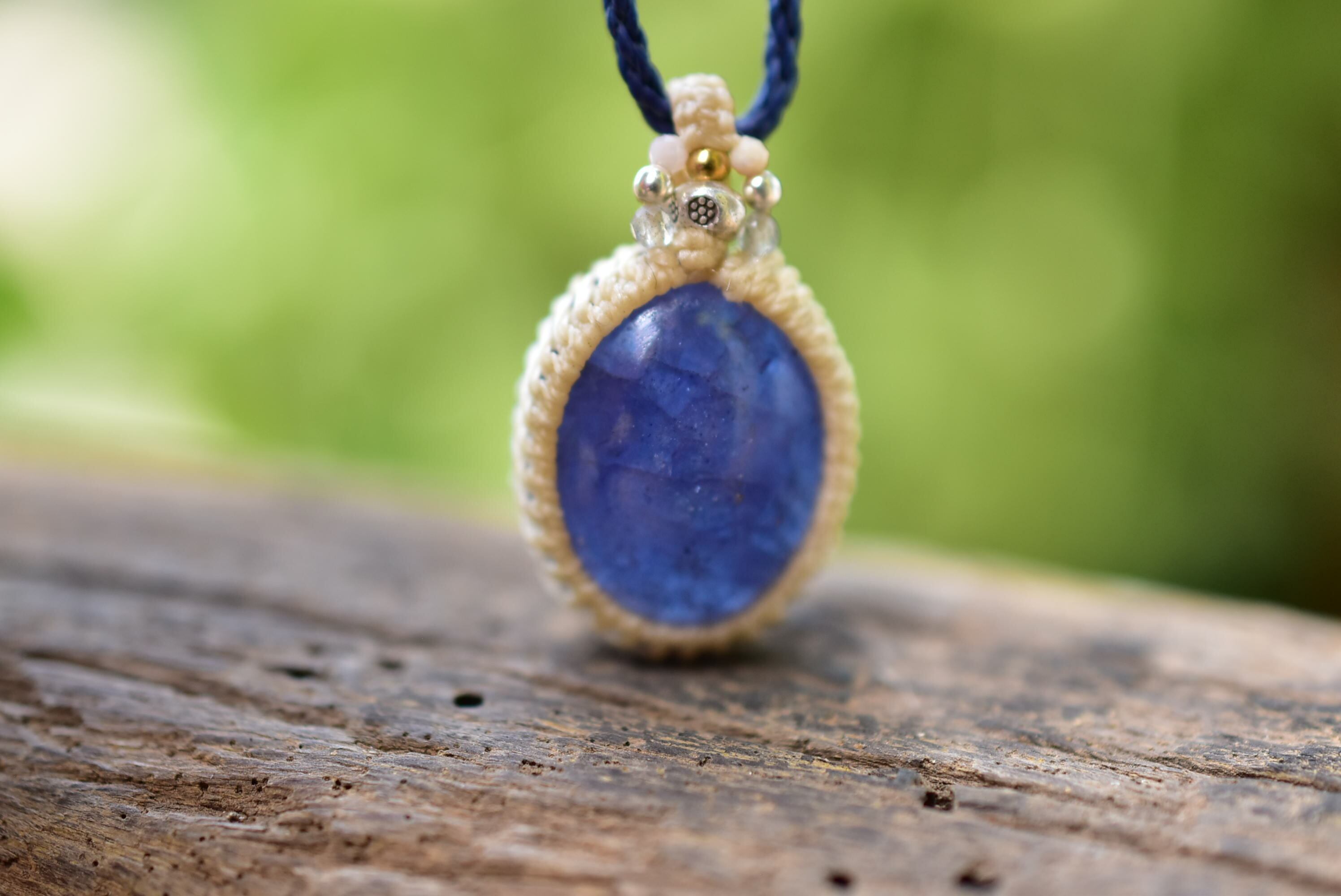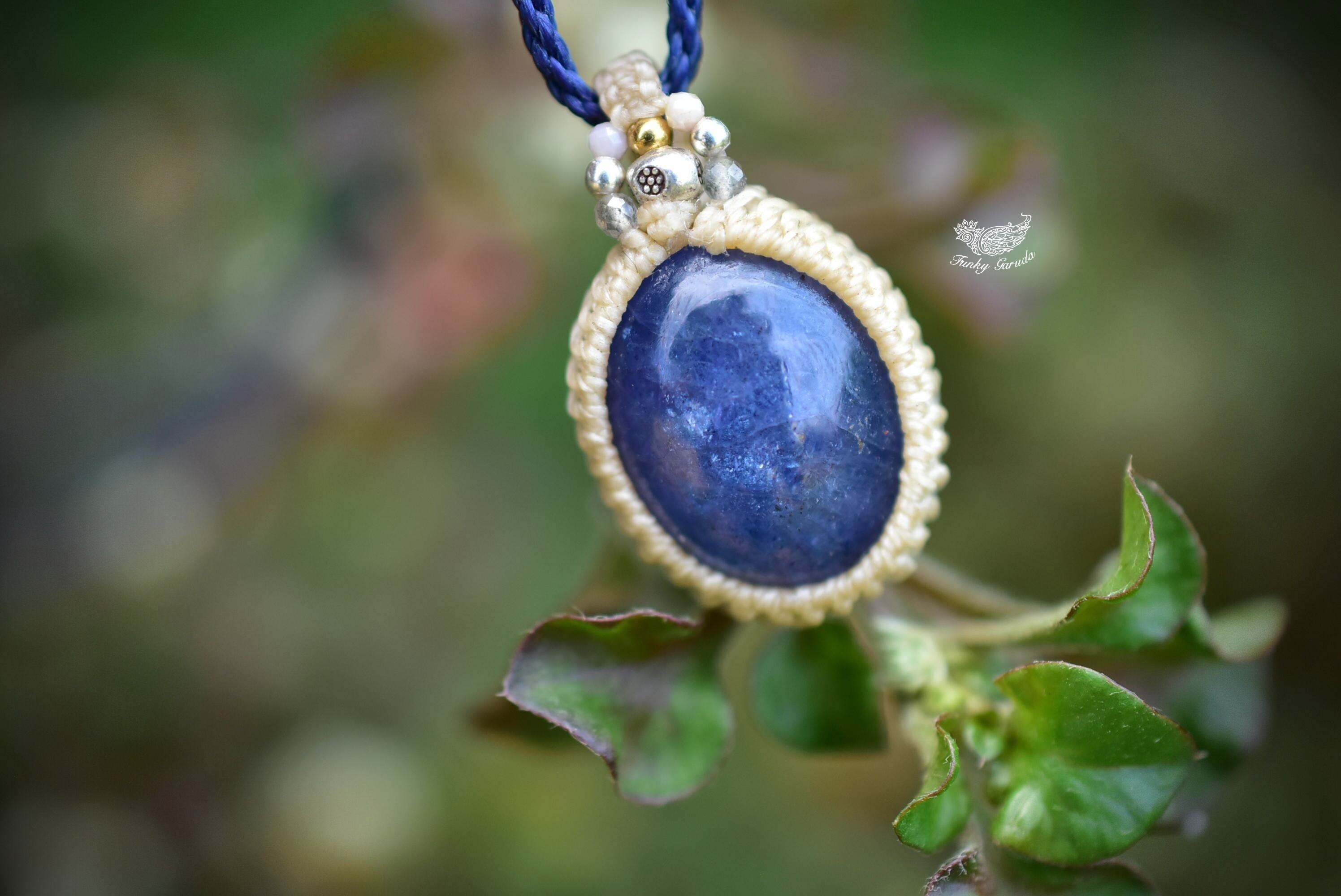 ◆このたびはキャラメル、ブルー色の蝋引き糸を使用しマクラメ編み装飾を施しました。