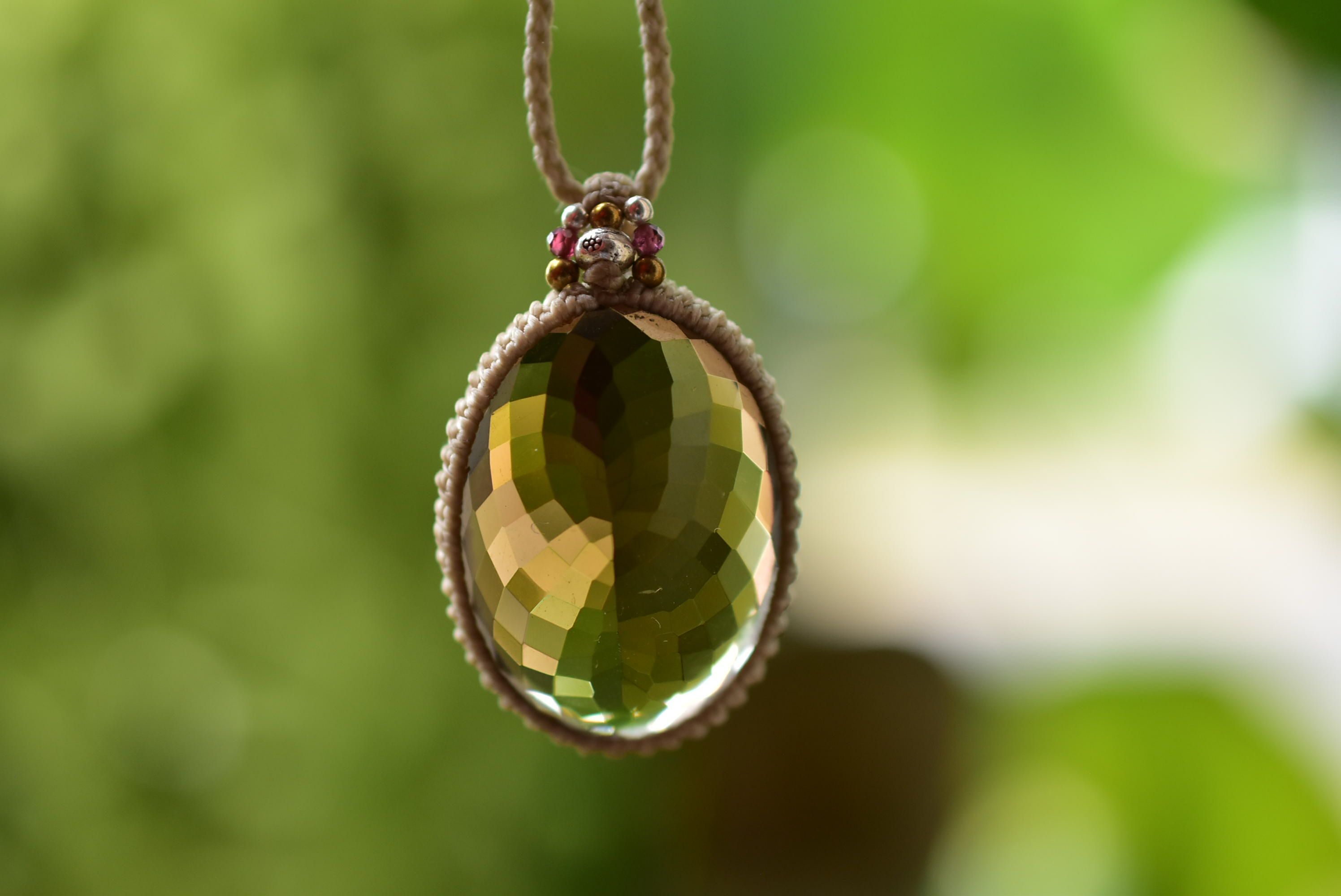 上質な輝きを放つピースをシンプルなマクラメペンダントに仕上げました。