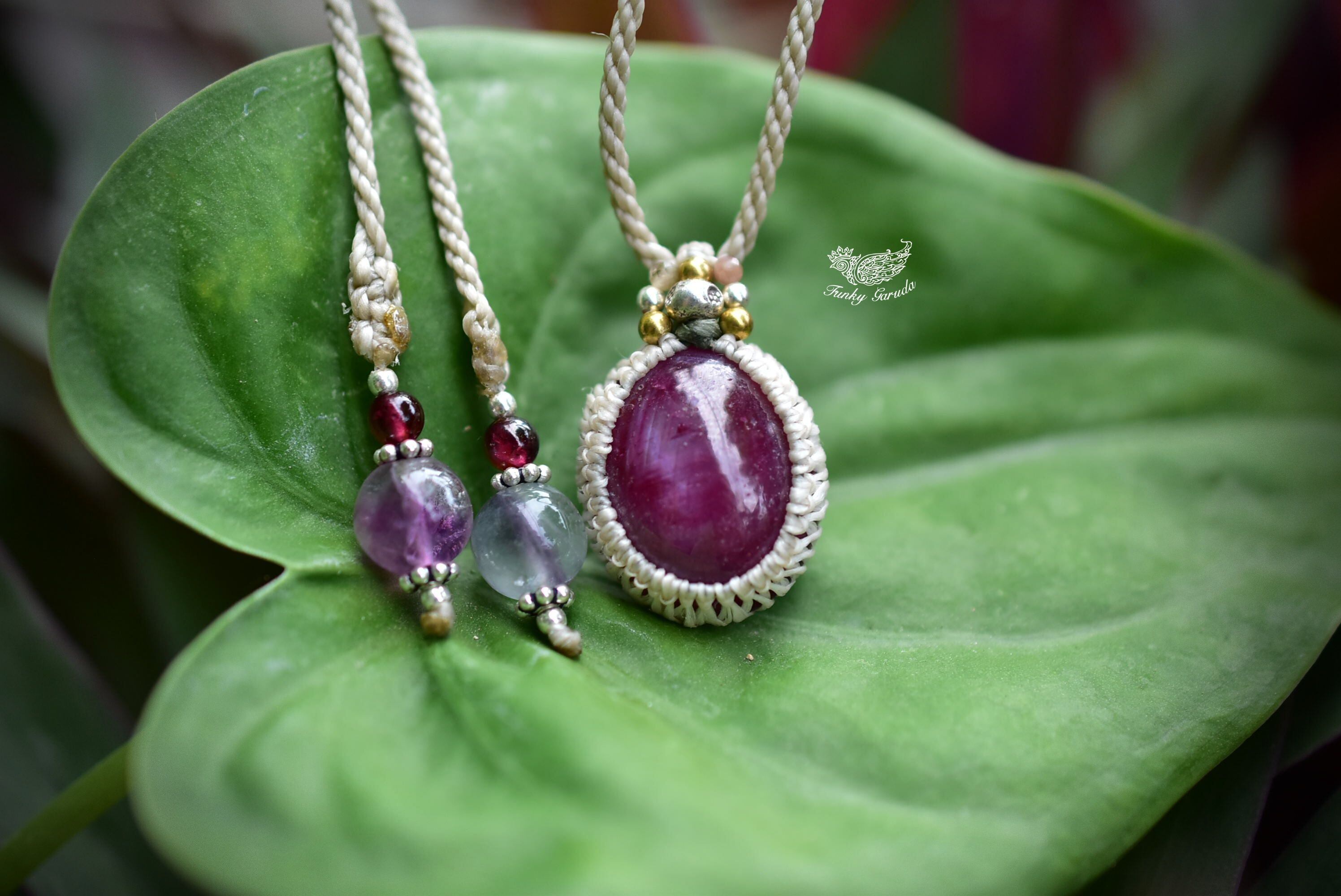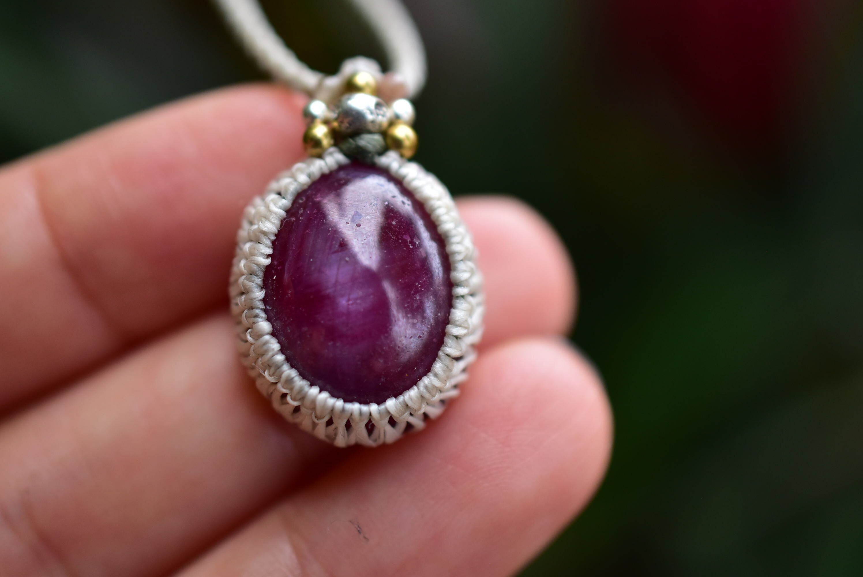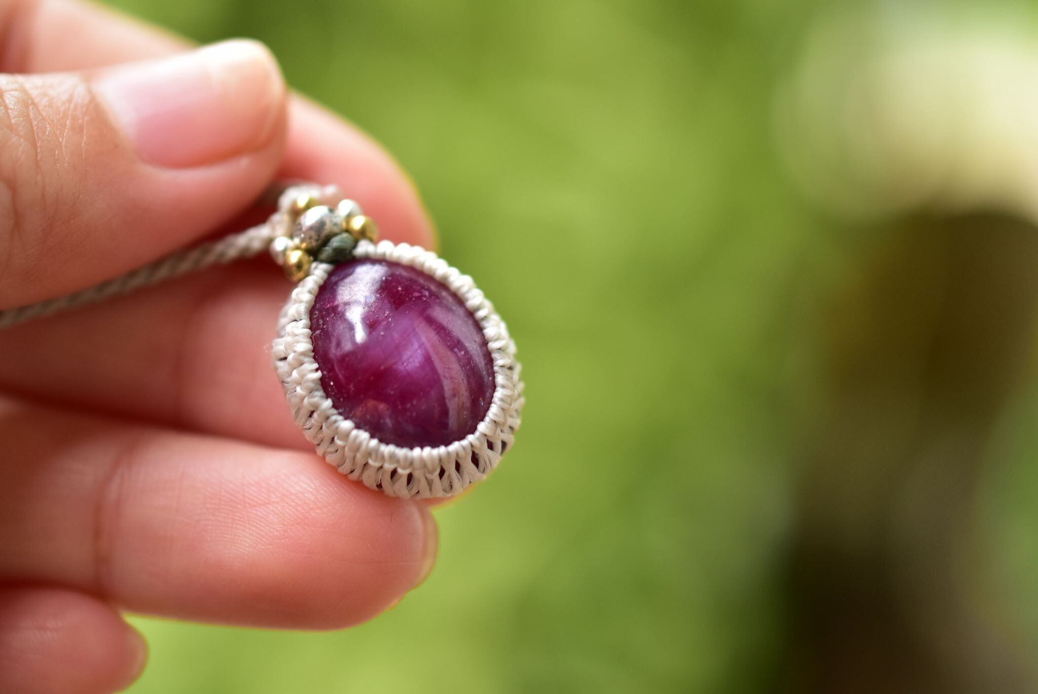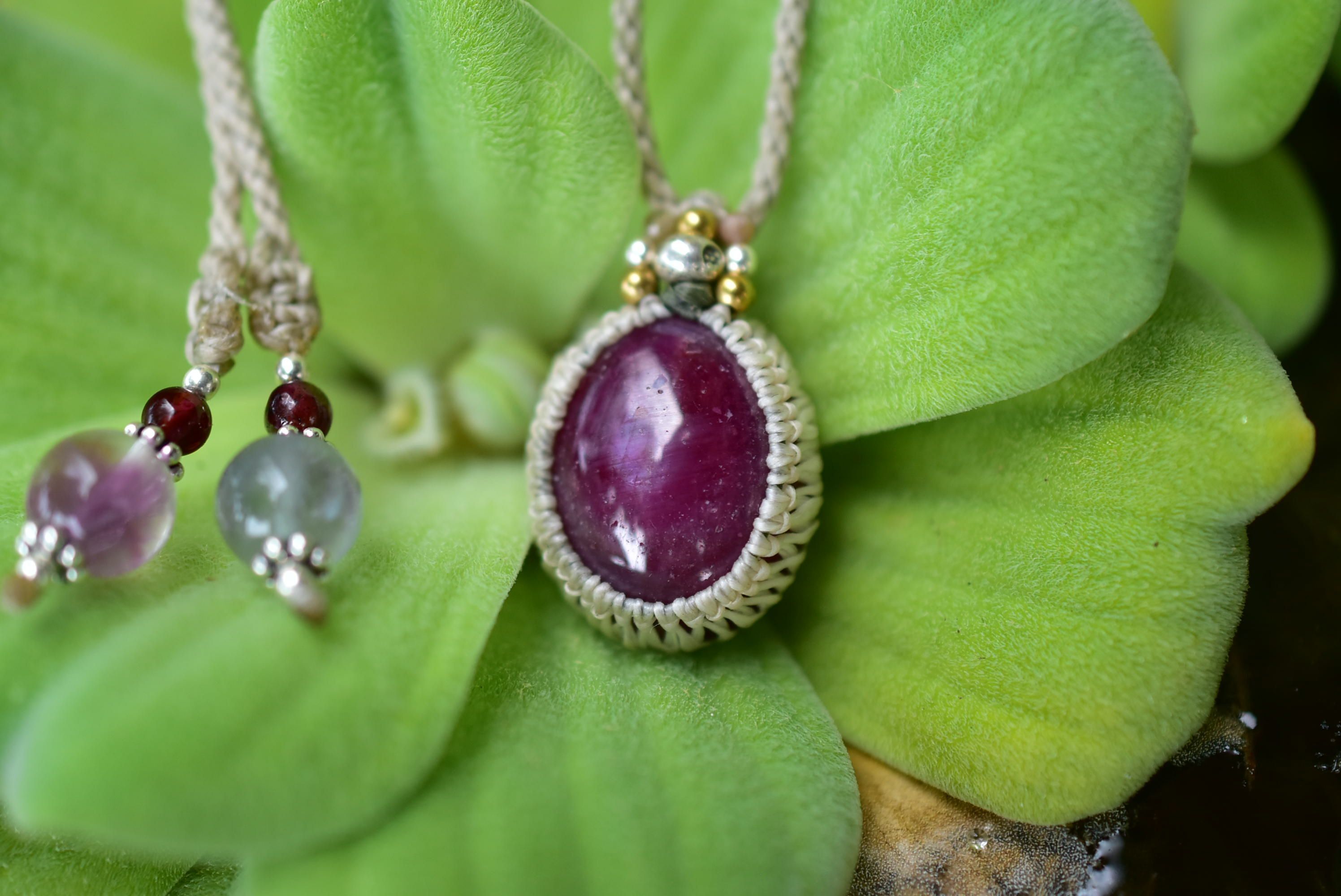 良質なルビーを、シンプルなマクラメ編みにて仕上げました。