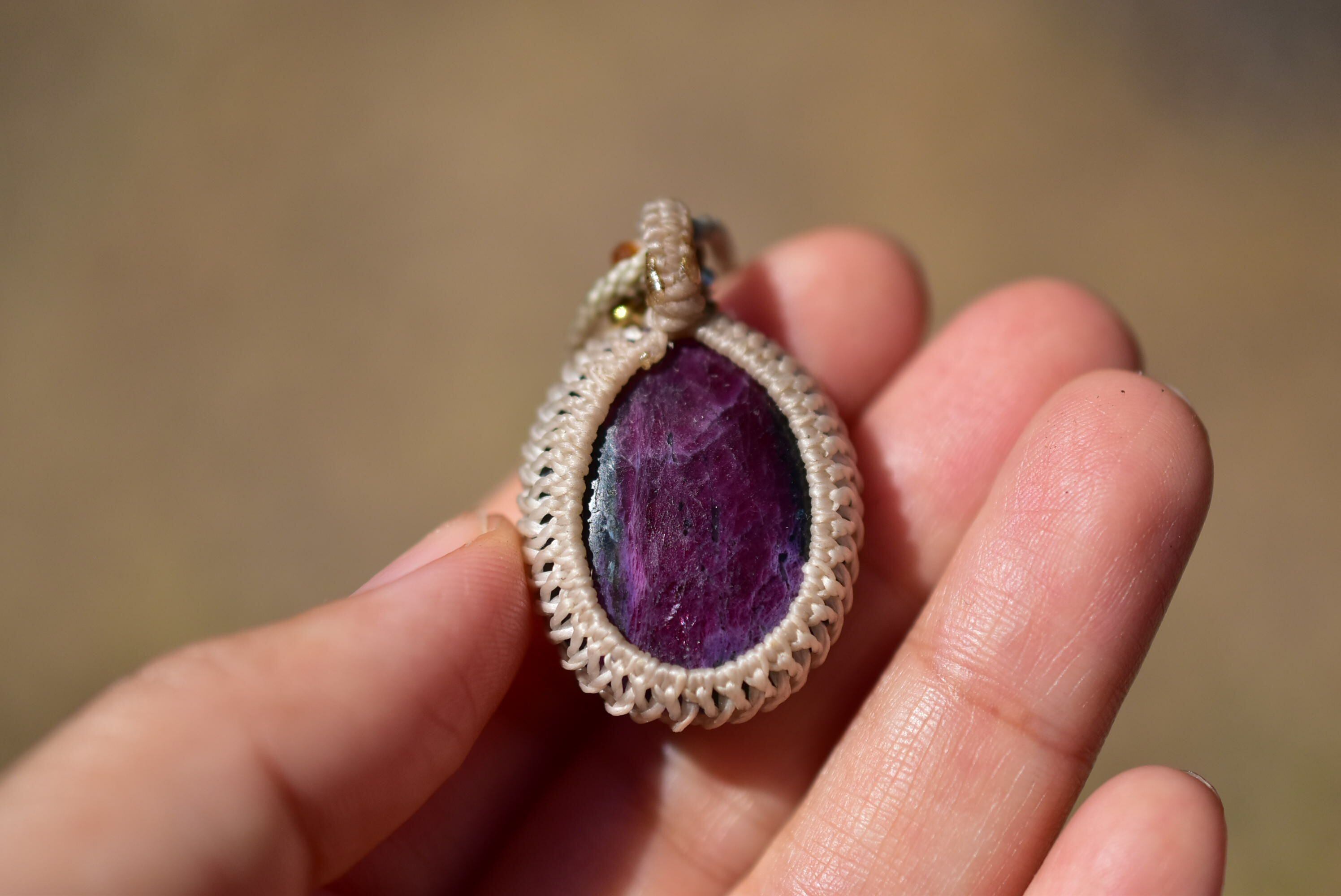 ◆このたびはヘンプ色の蝋引き糸を使用しマクラメ編み装飾を施しました。