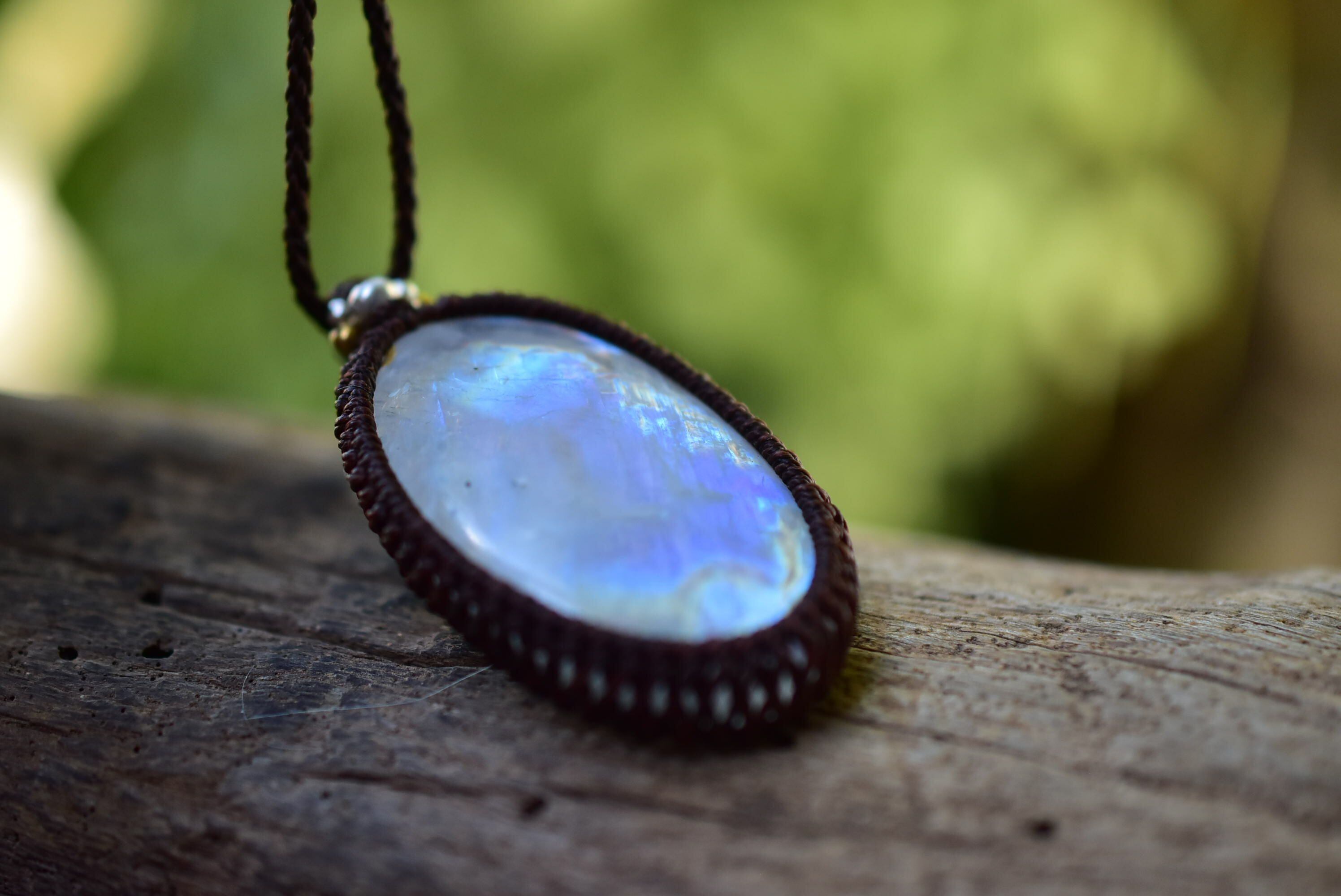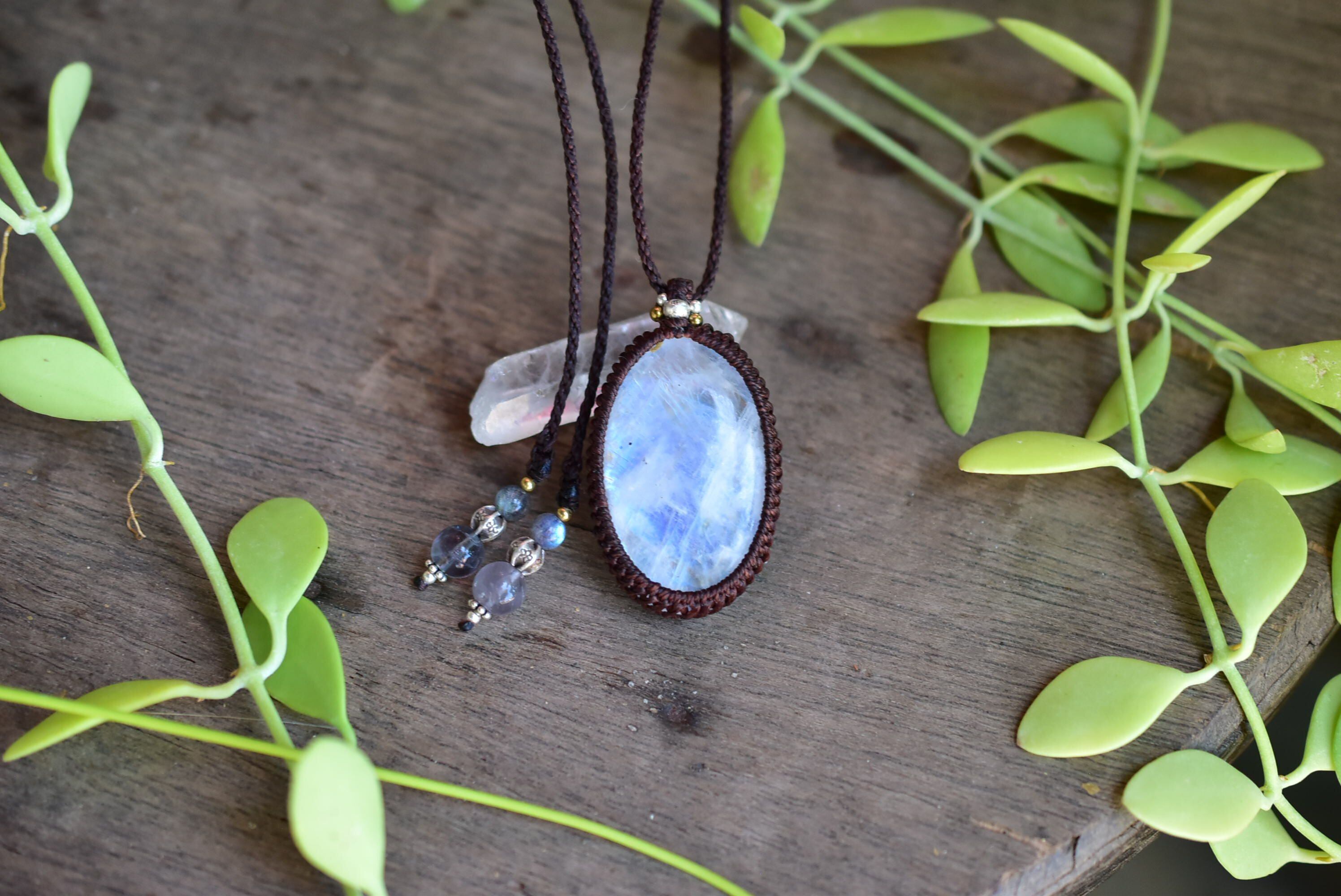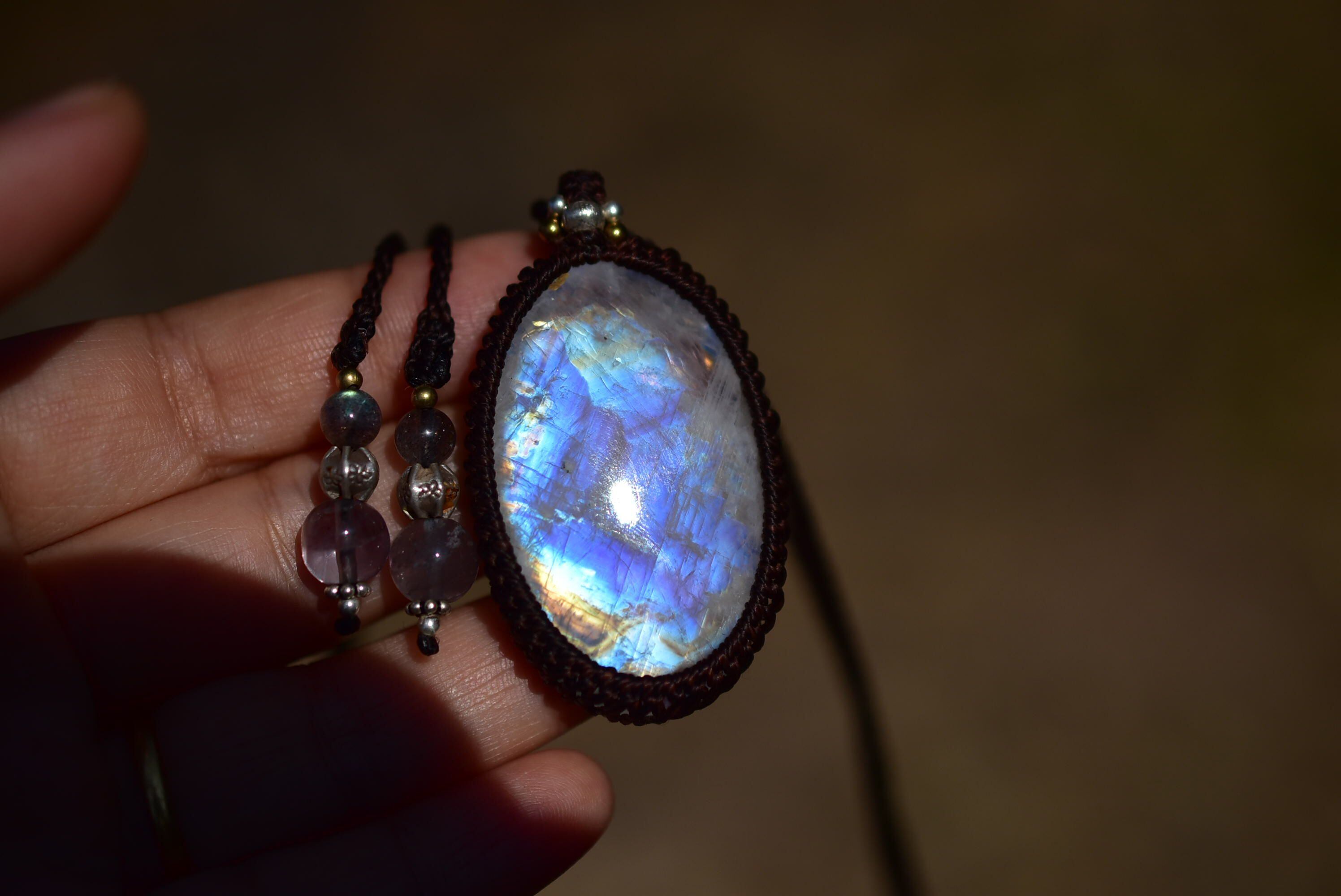 高品質★満ちる輝き★レインボームーンストーン シンプルマクラメペンダント134
