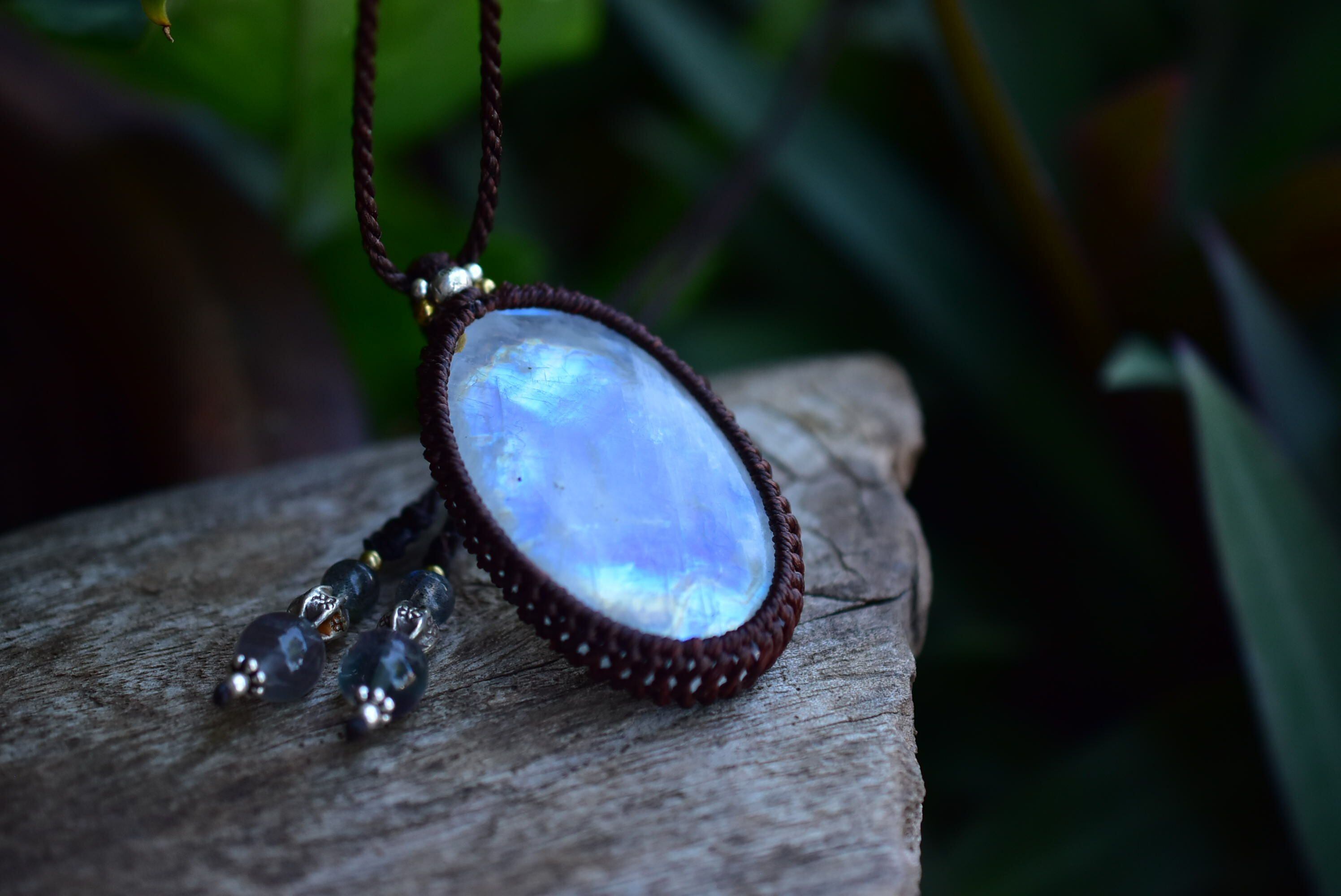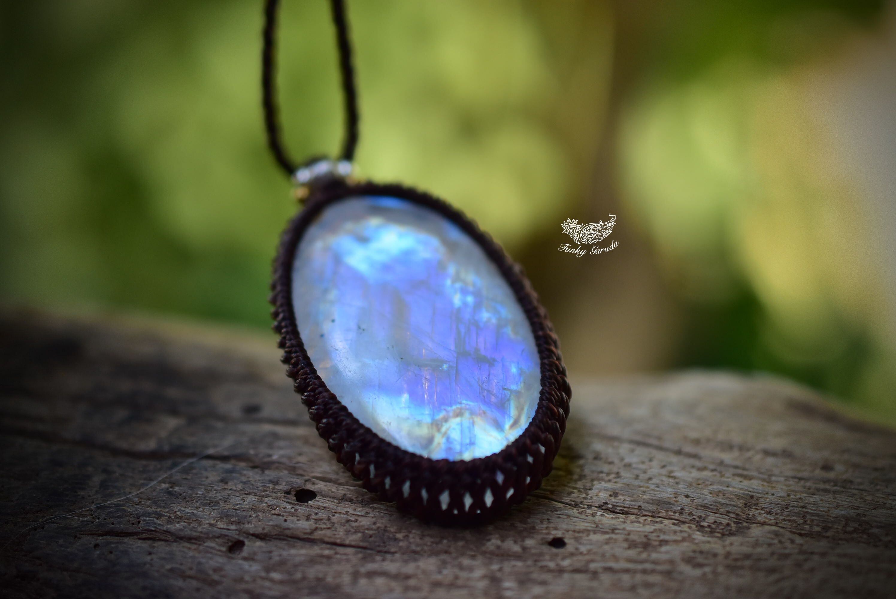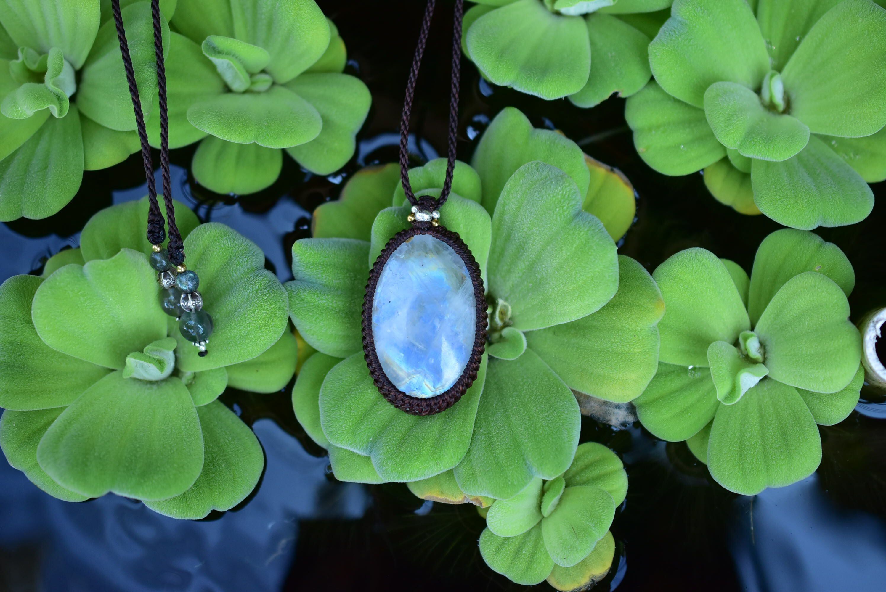 高品質★満ちる輝き★レインボームーンストーン シンプルマクラメペンダント134