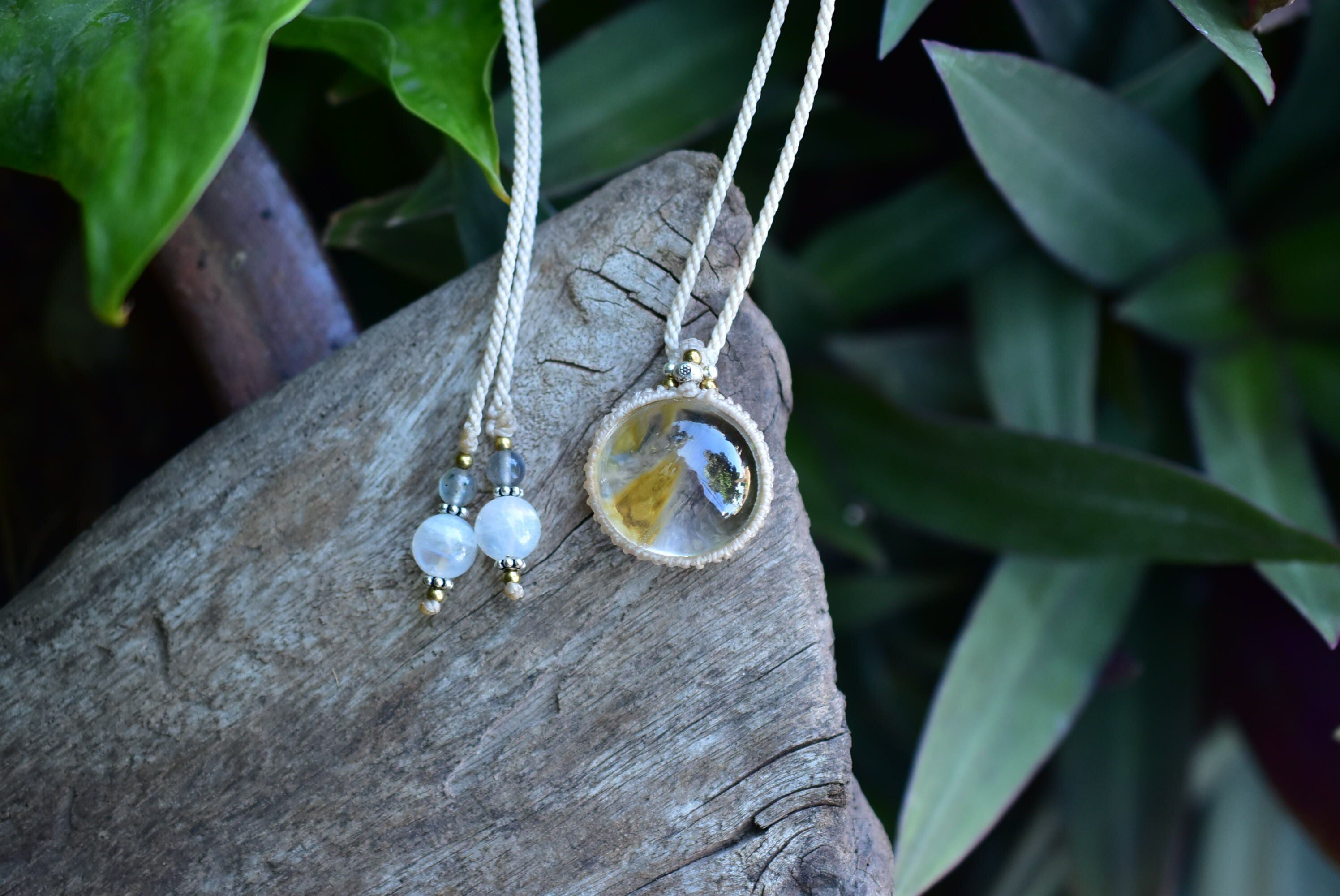 ◆このたびはナチュラルホワイト色の蝋引き糸を使用しマクラメ編み装飾を施しました。