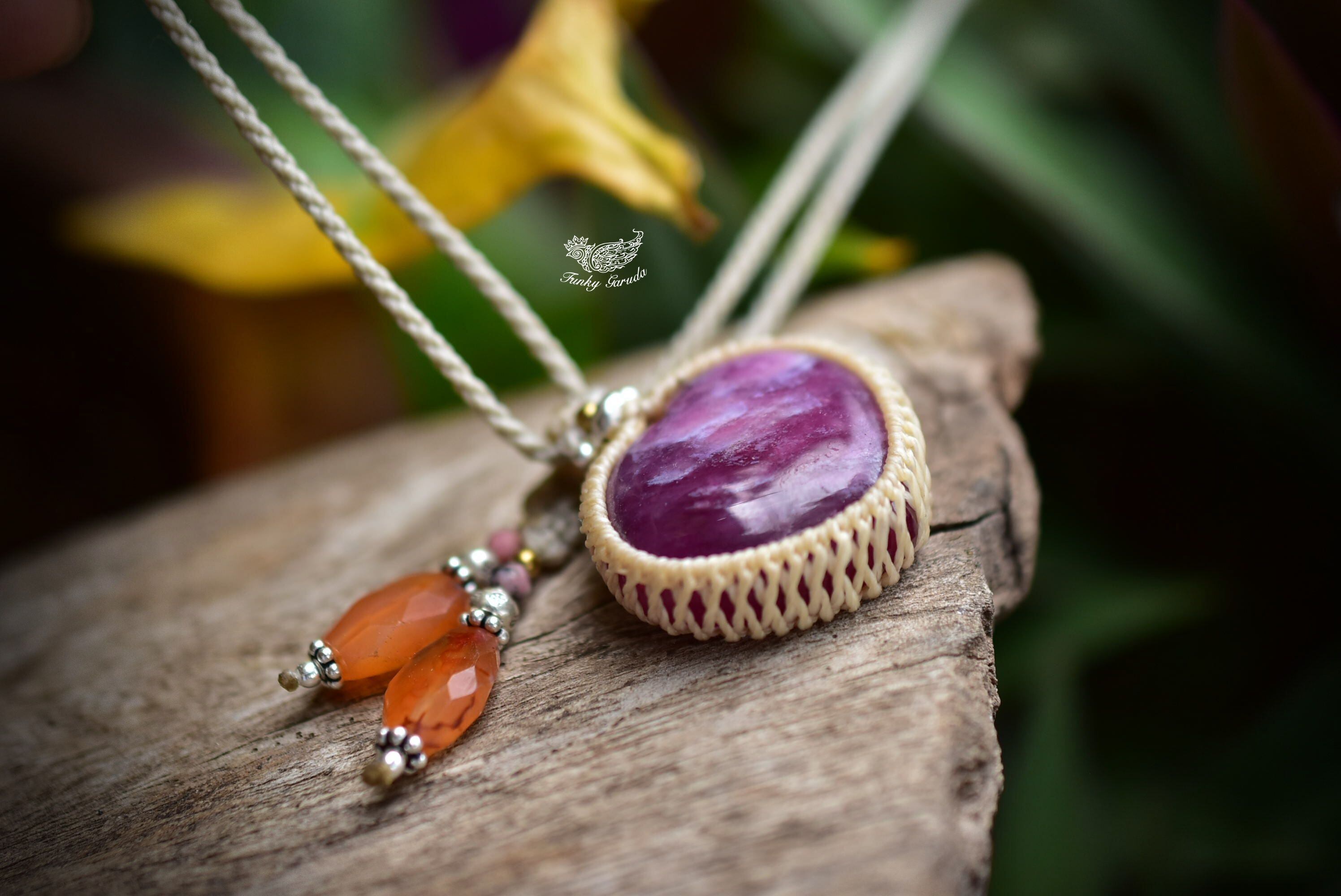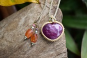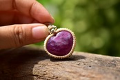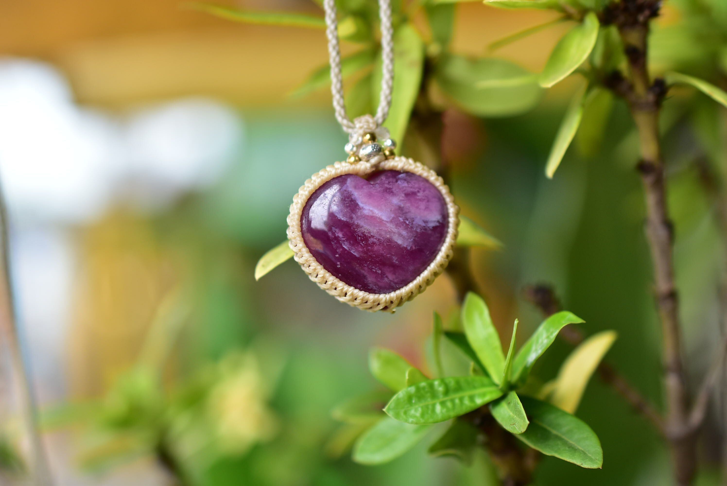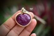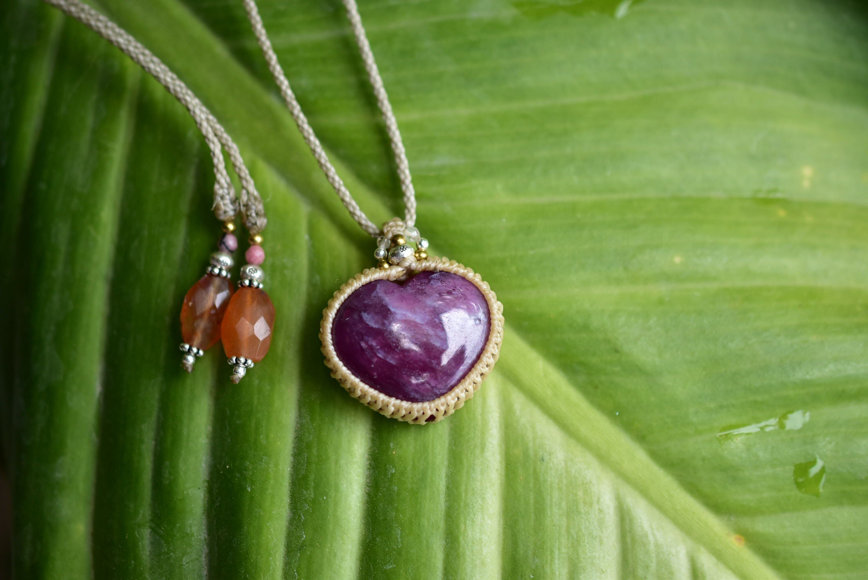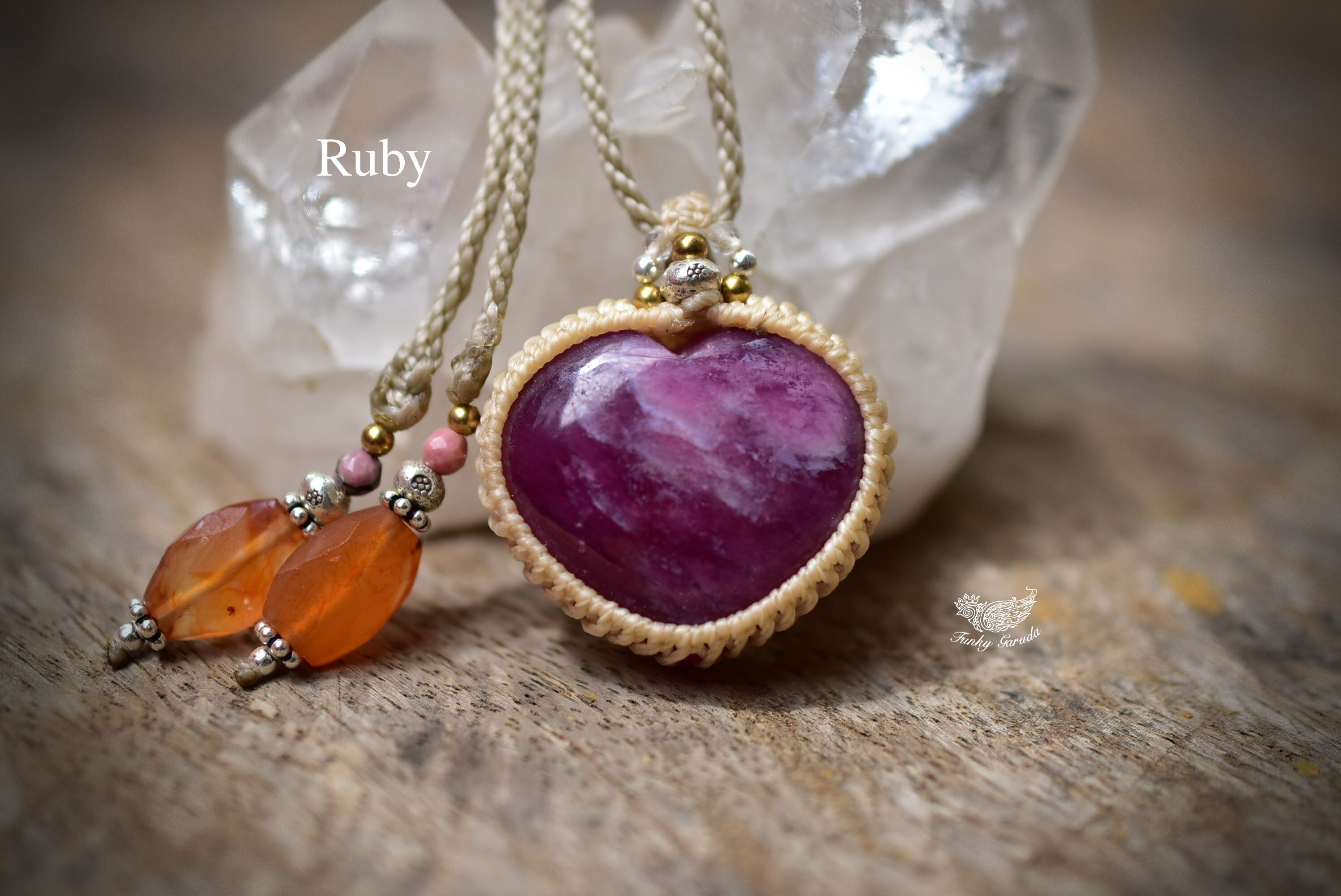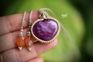 ハートシェイプに研磨が施された良質ルビーを、シンプルなマクラメ編みに仕上げました。