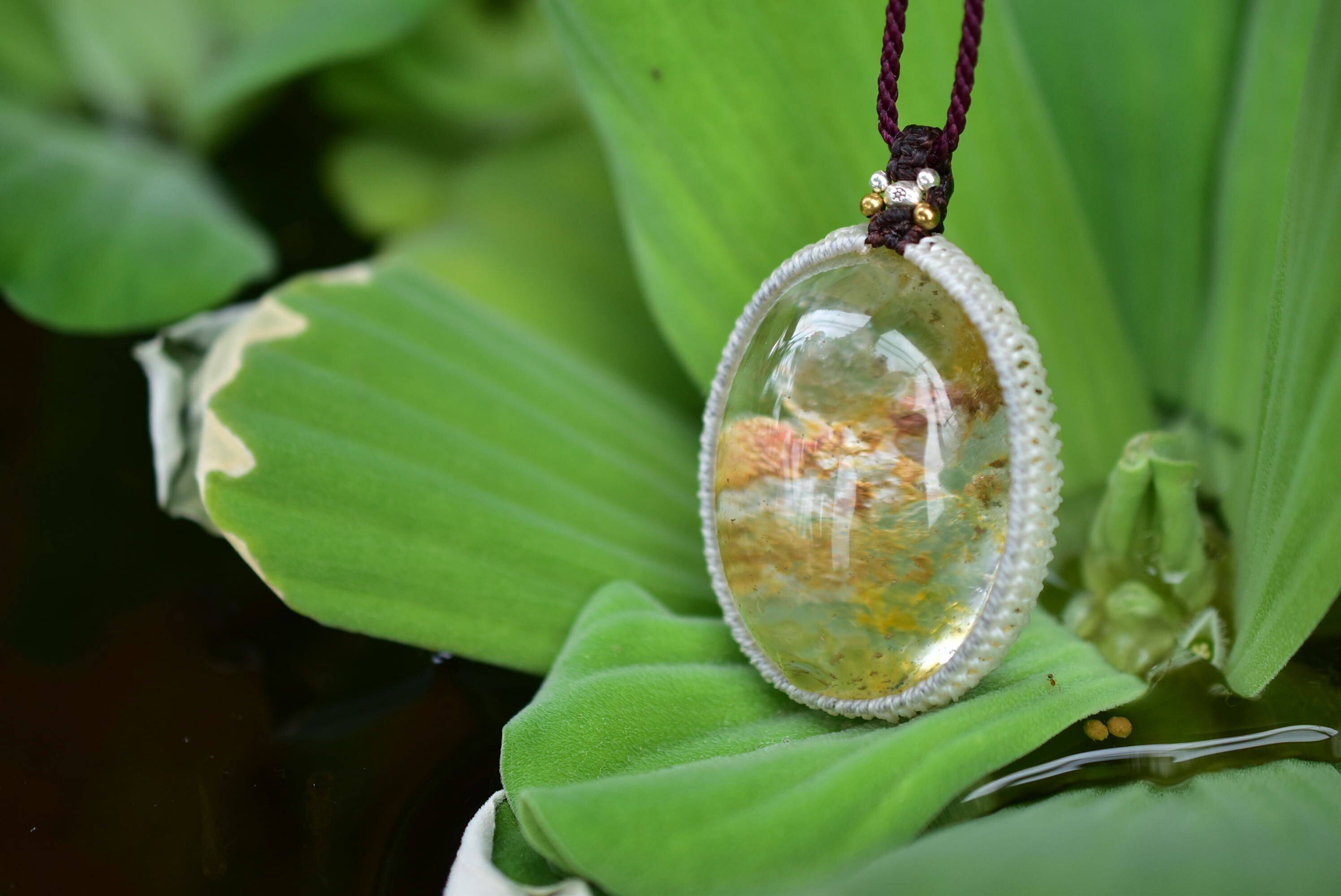 黄色や茶色のリモナイトとも呼べる内包物が閉じ込められたガーデンクォーツ