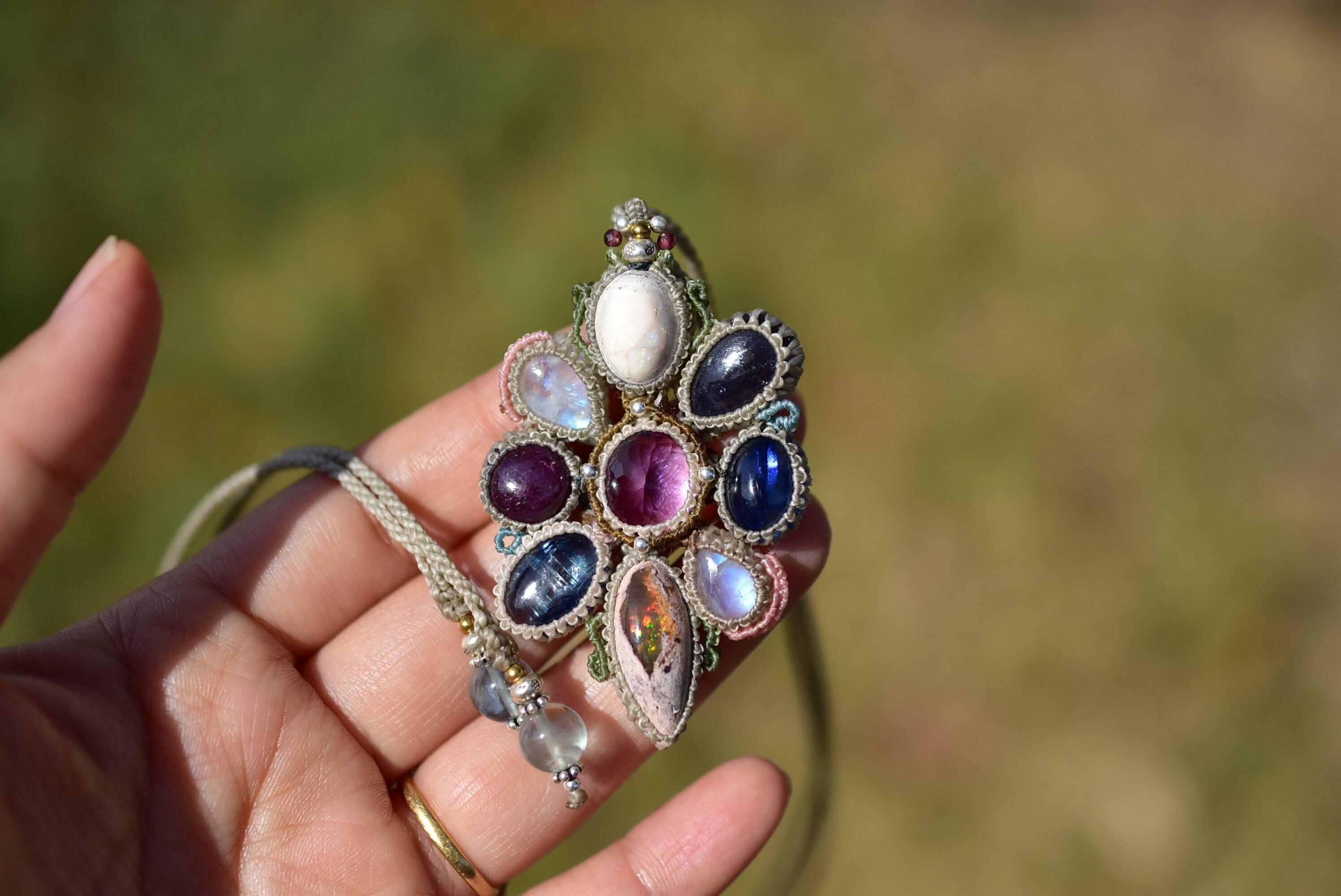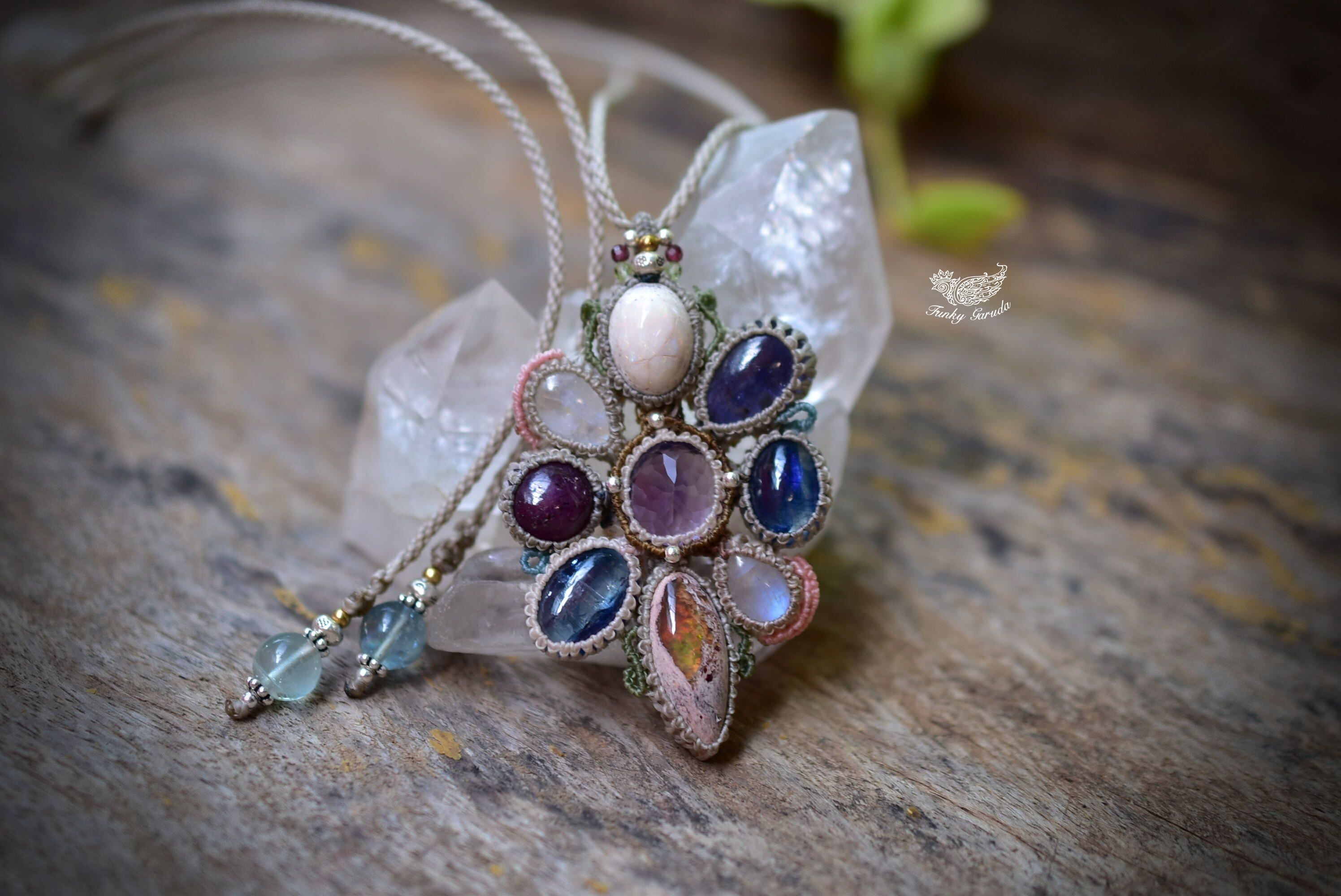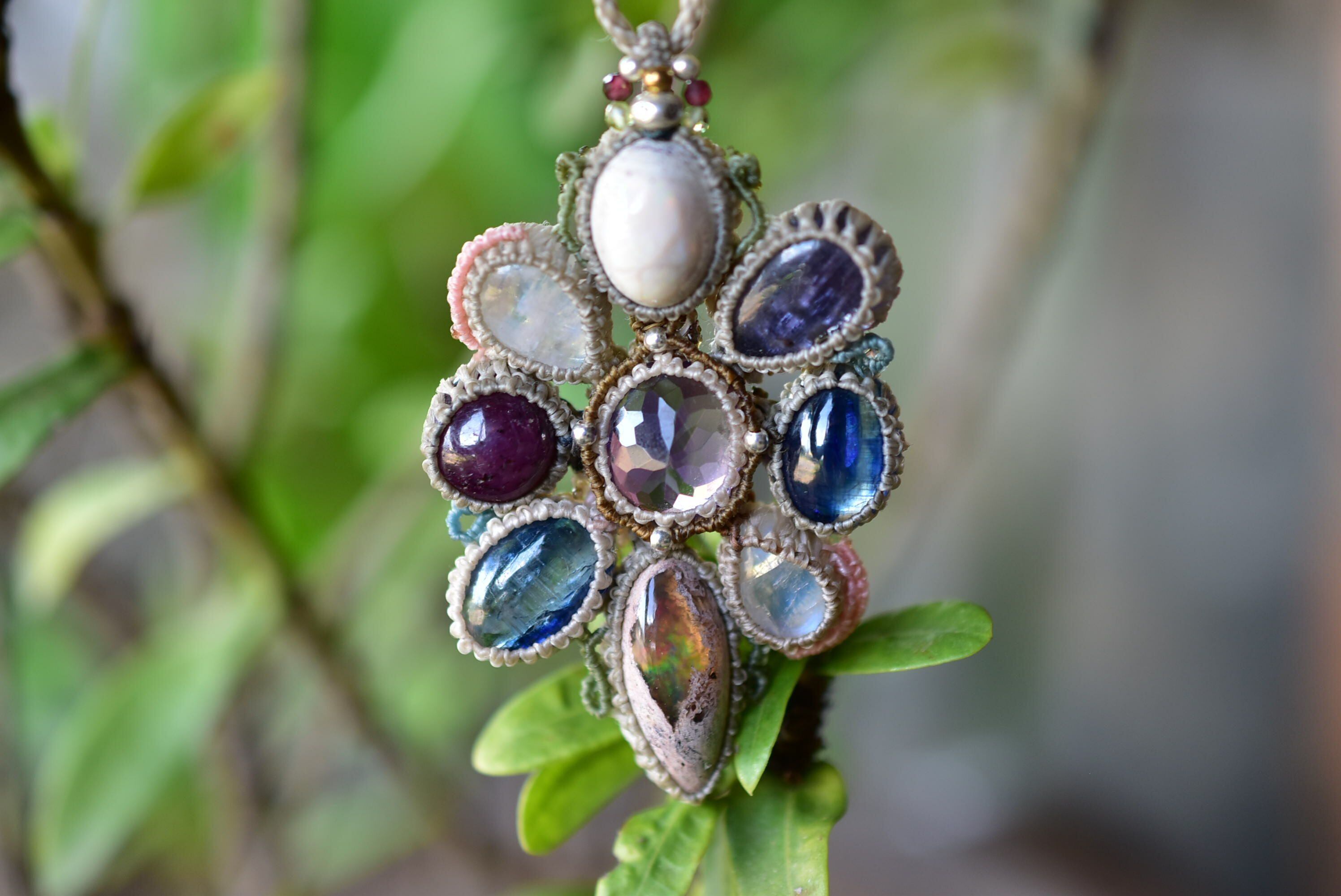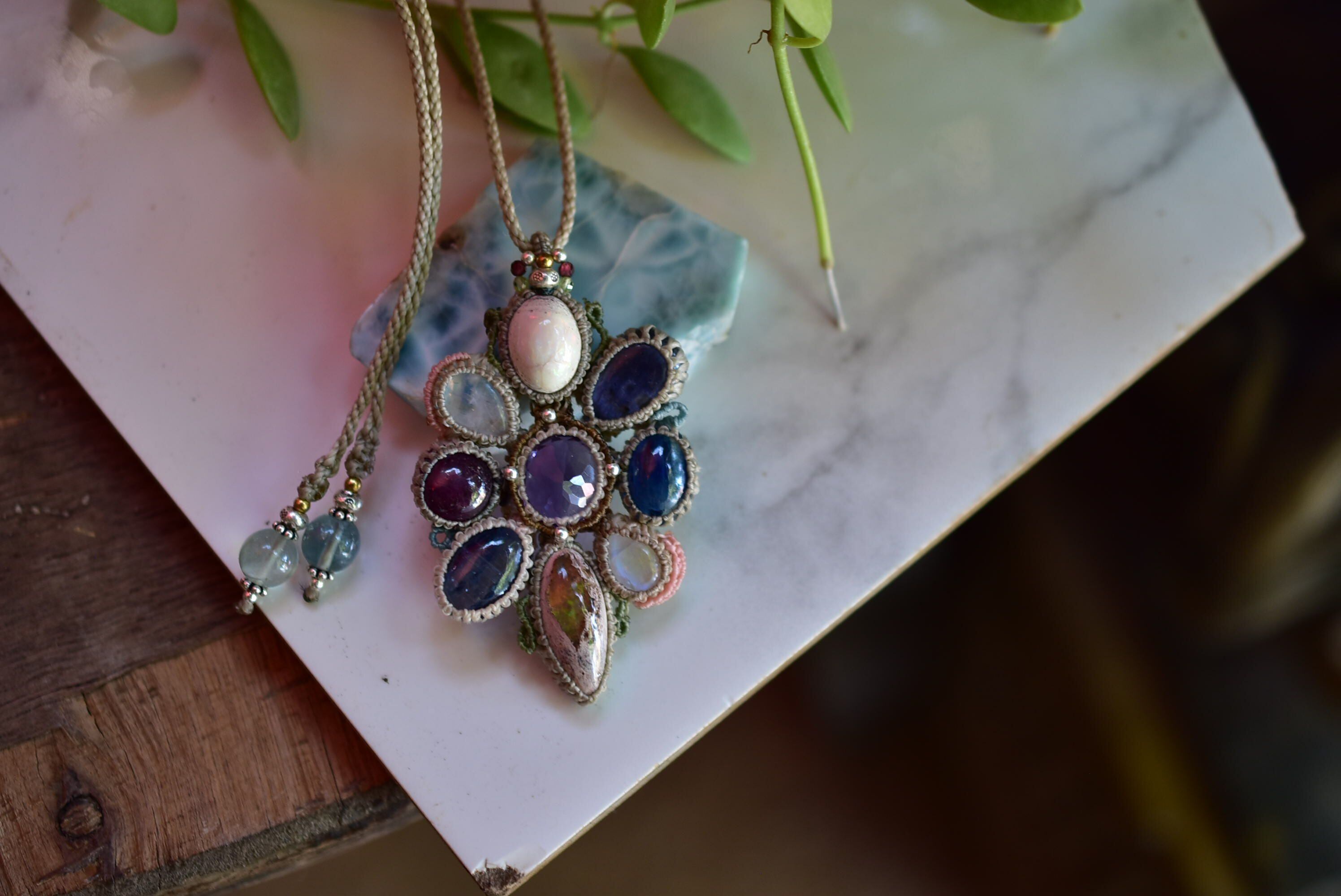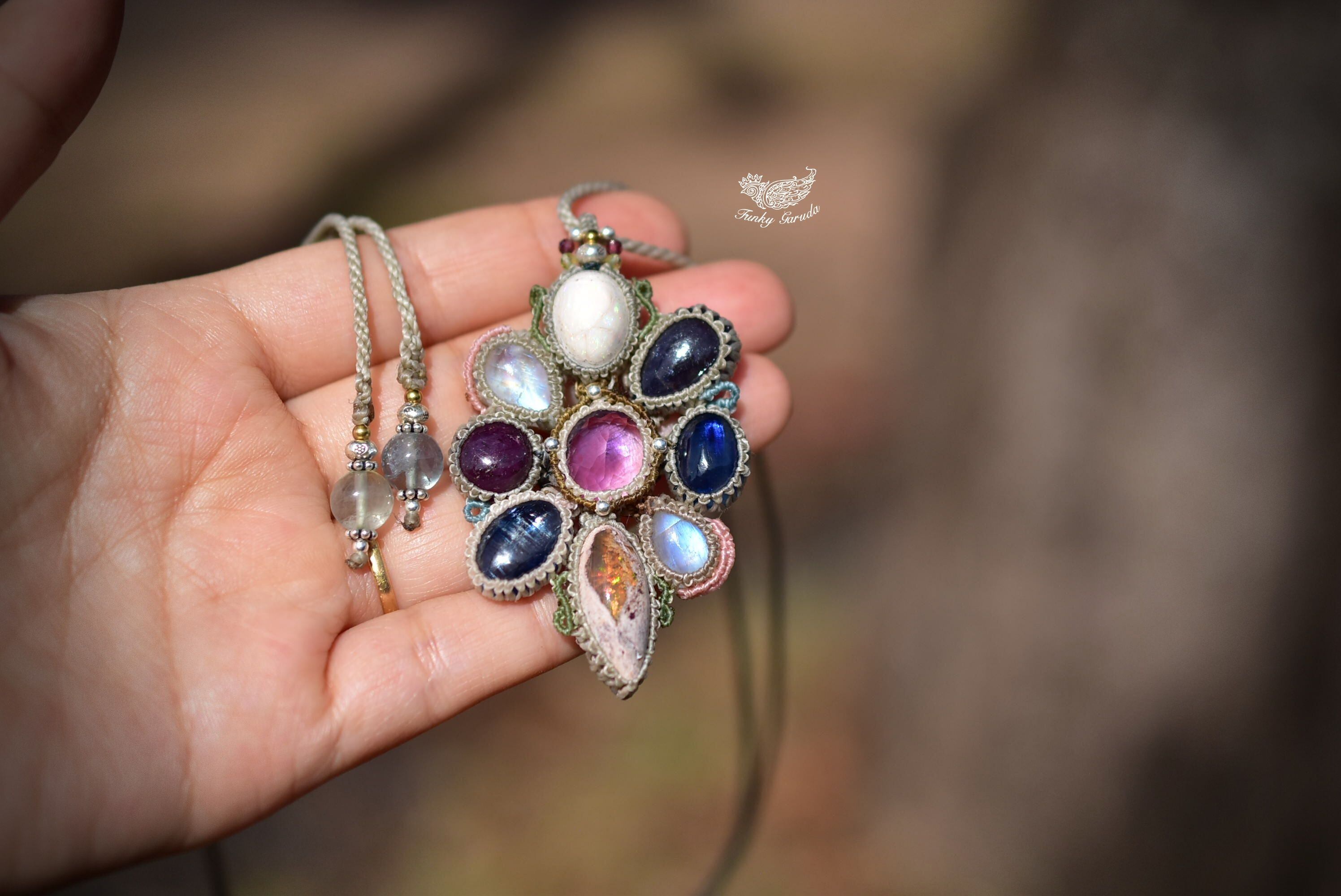 ◆このたびはカフェオレ、ヘンプ、ナチュラルホワイト、ゴールドブラウン、ピンク、ブルー、ピーコックグリーン色の蝋引き糸を使用しマクラメ編み装飾を施しました。