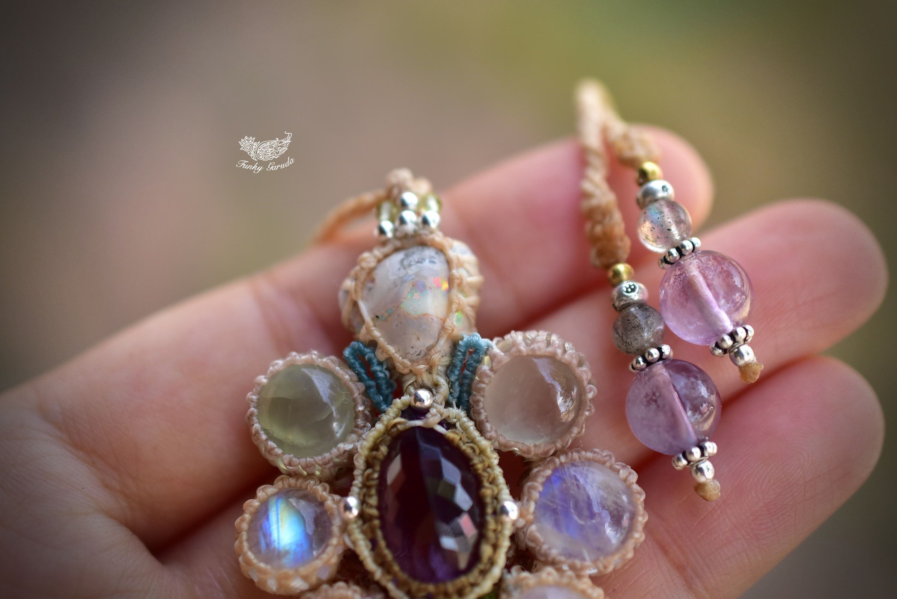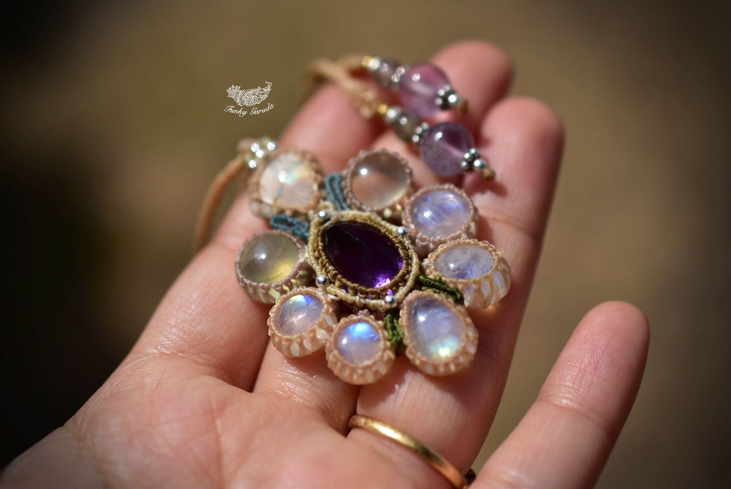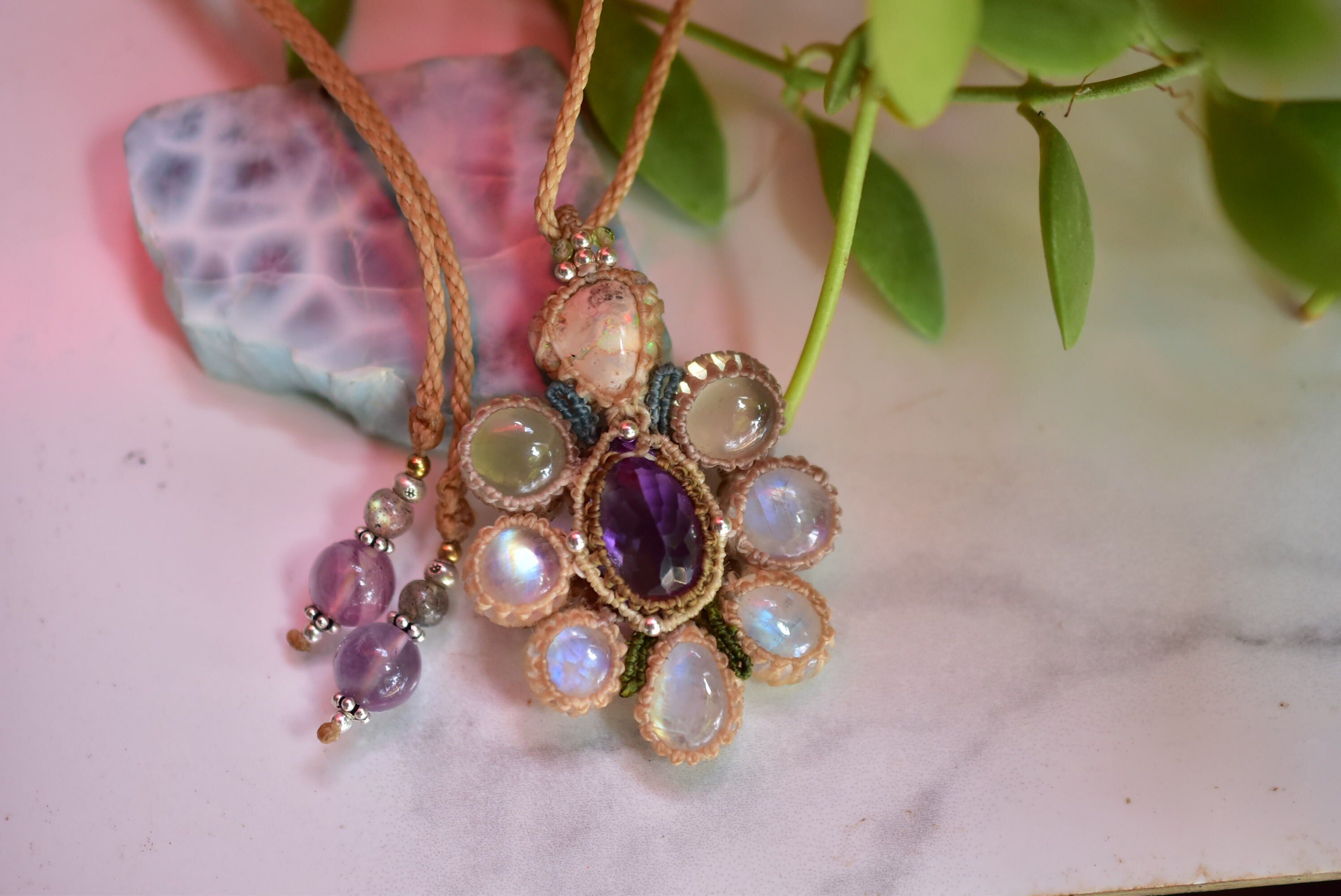 春色お花★アメジスト ムーンストーン プレナイト マクラメペンダント175