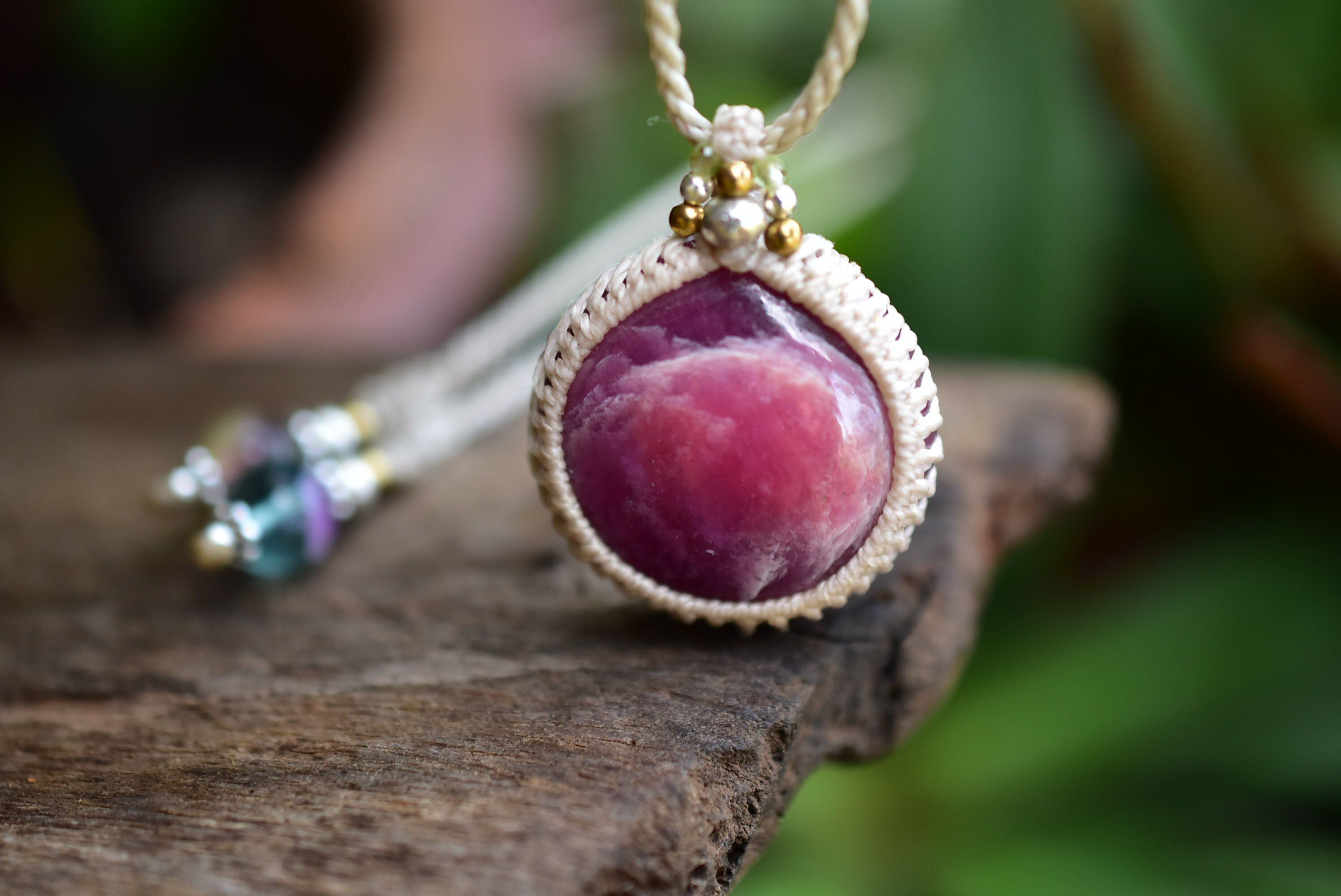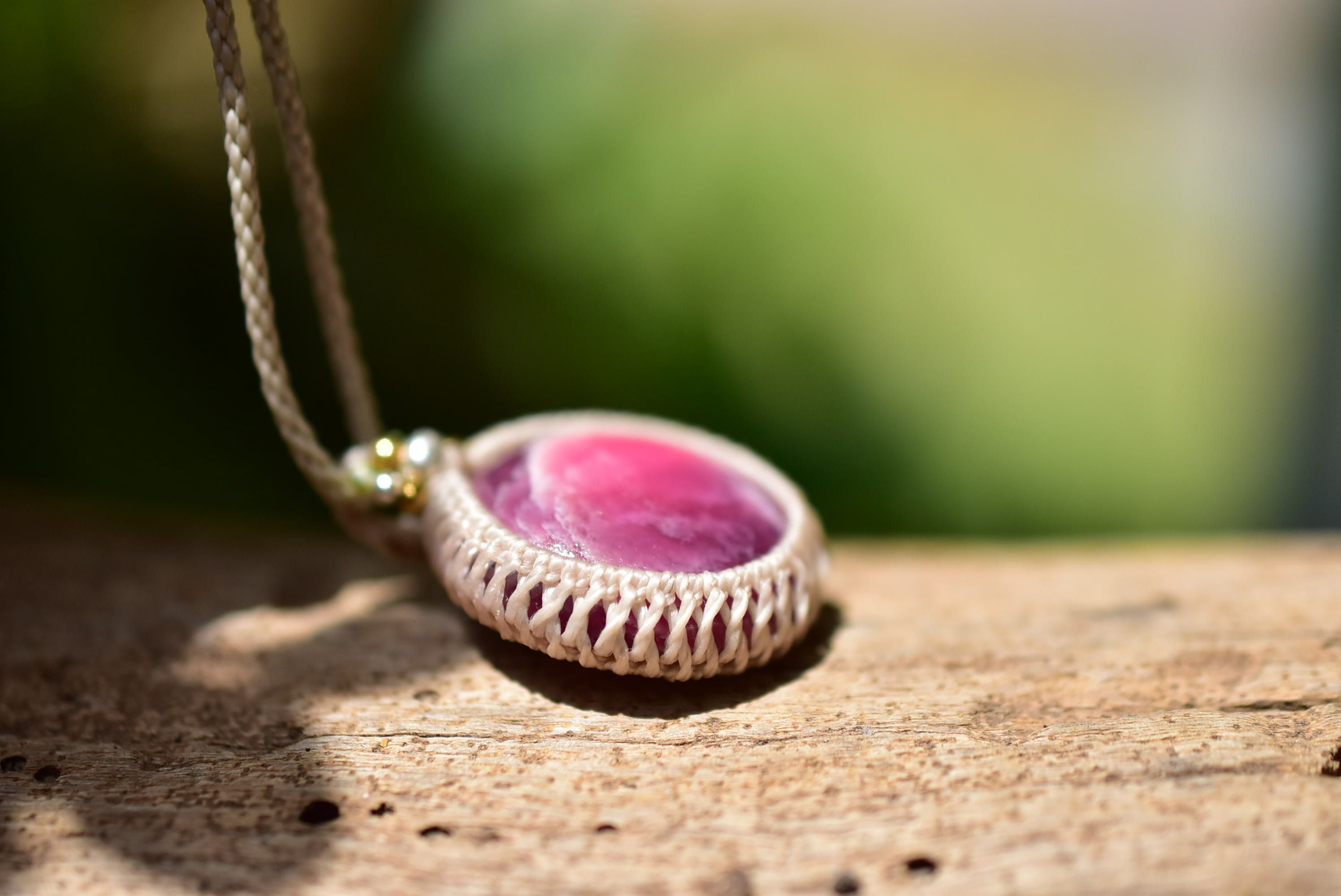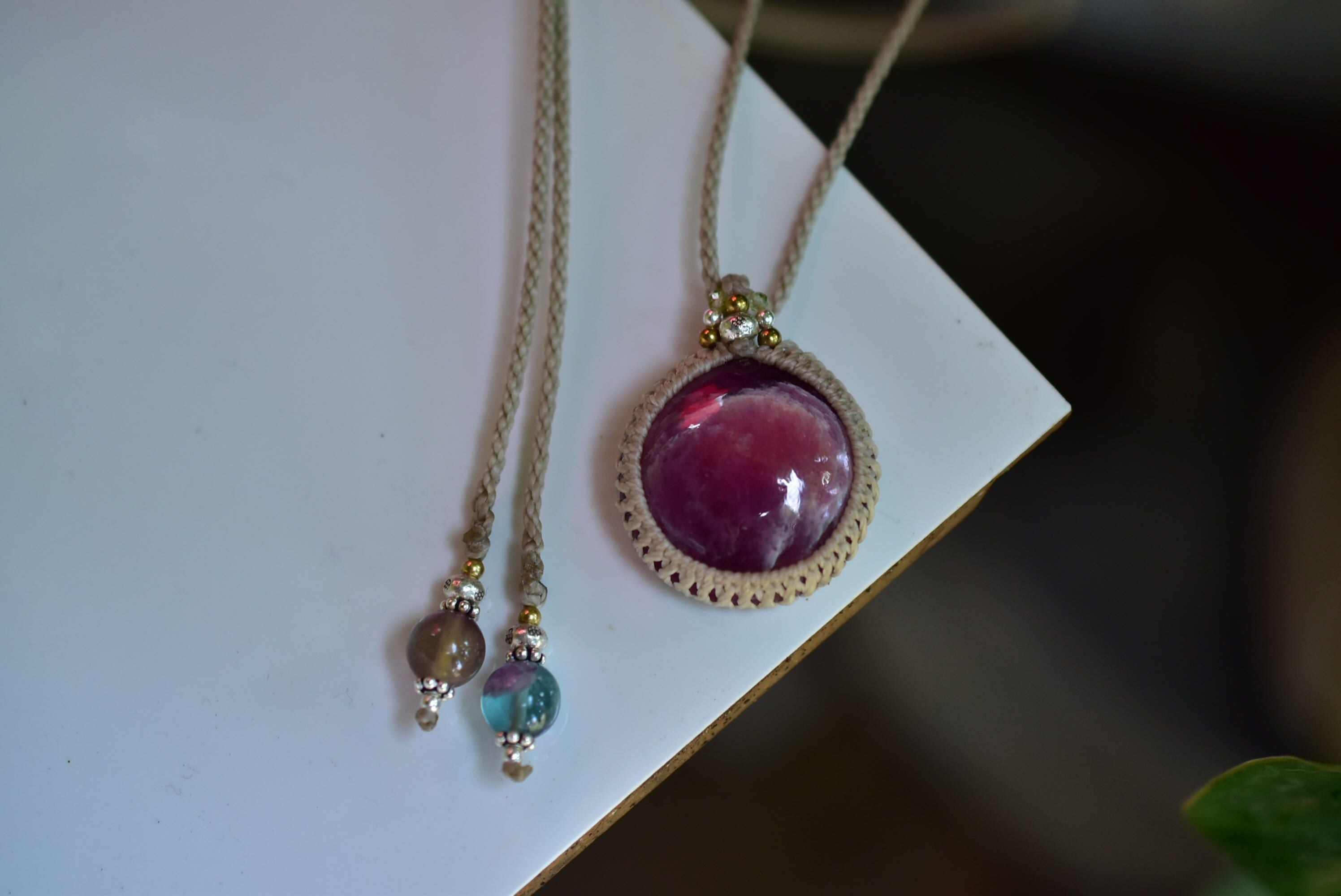 ◆このたびはヘンプ色の蝋引き糸を使用しマクラメ編み装飾を施しました。