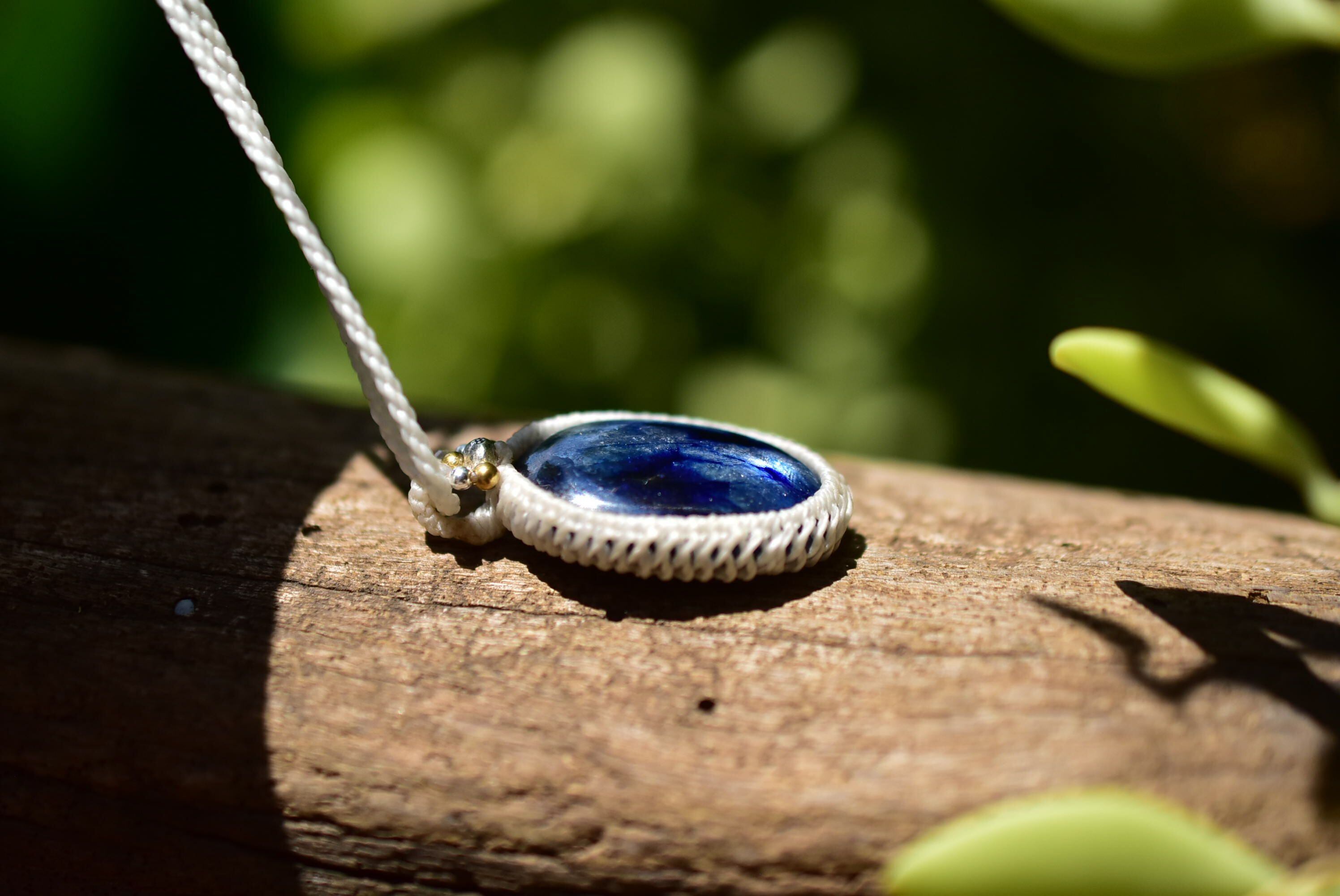 ◆このたびはホワイト色の蝋引き糸を使用しマクラメ編み装飾を施しました。