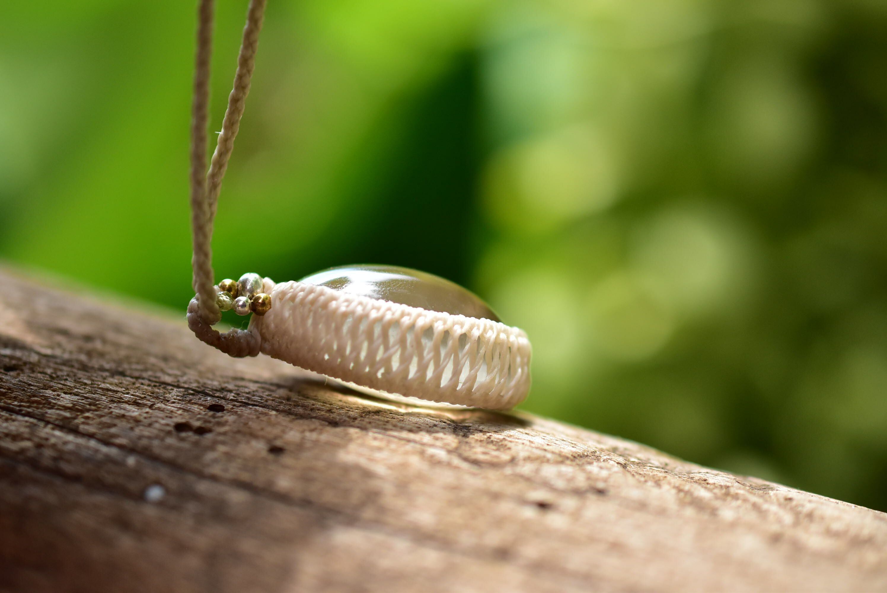 ◆このたびはキャラメル色の蝋引き糸を使用しマクラメ編み装飾を施しました。