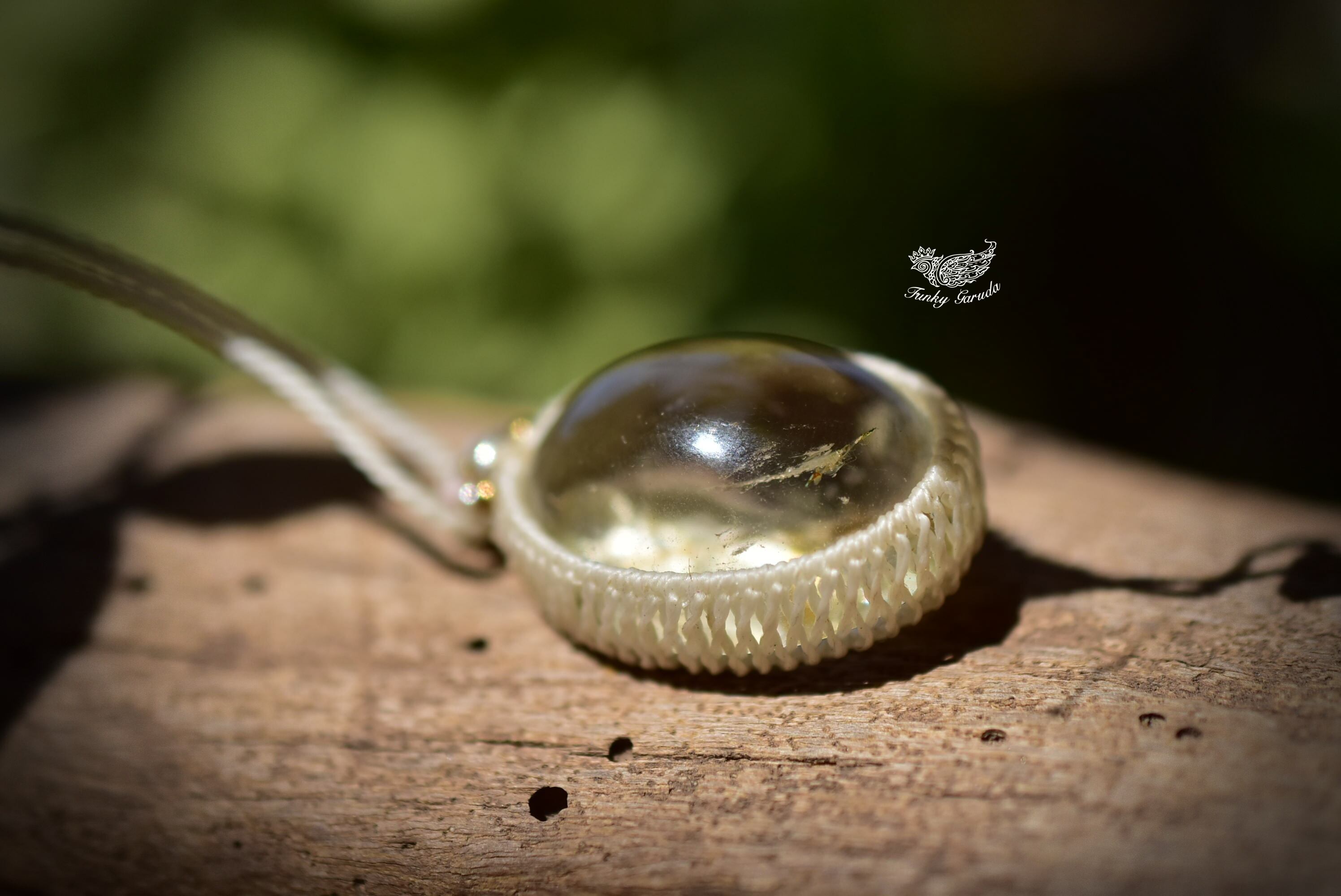 ◆このたびはホワイト色の蝋引き糸を使用しマクラメ編み装飾を施しました。