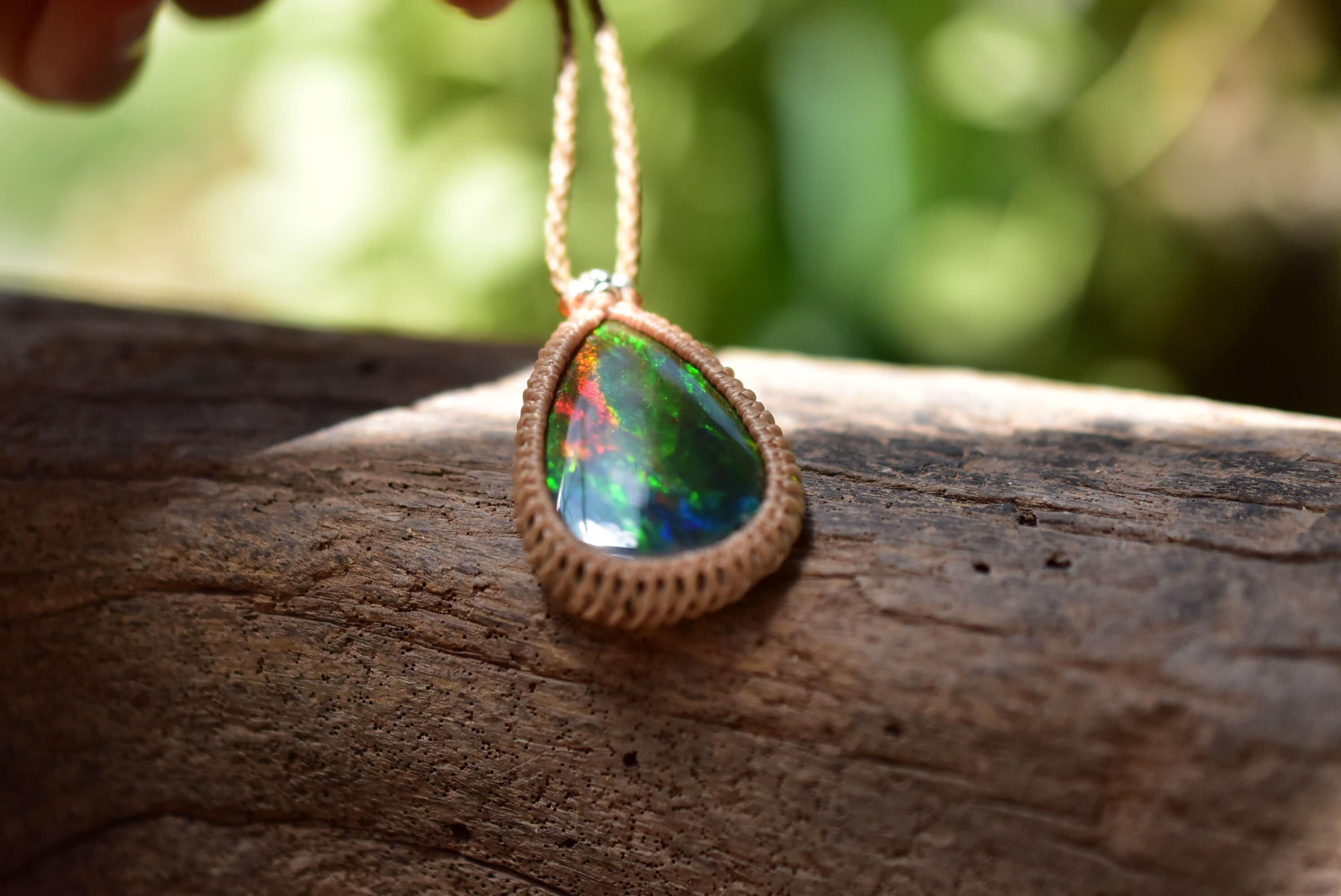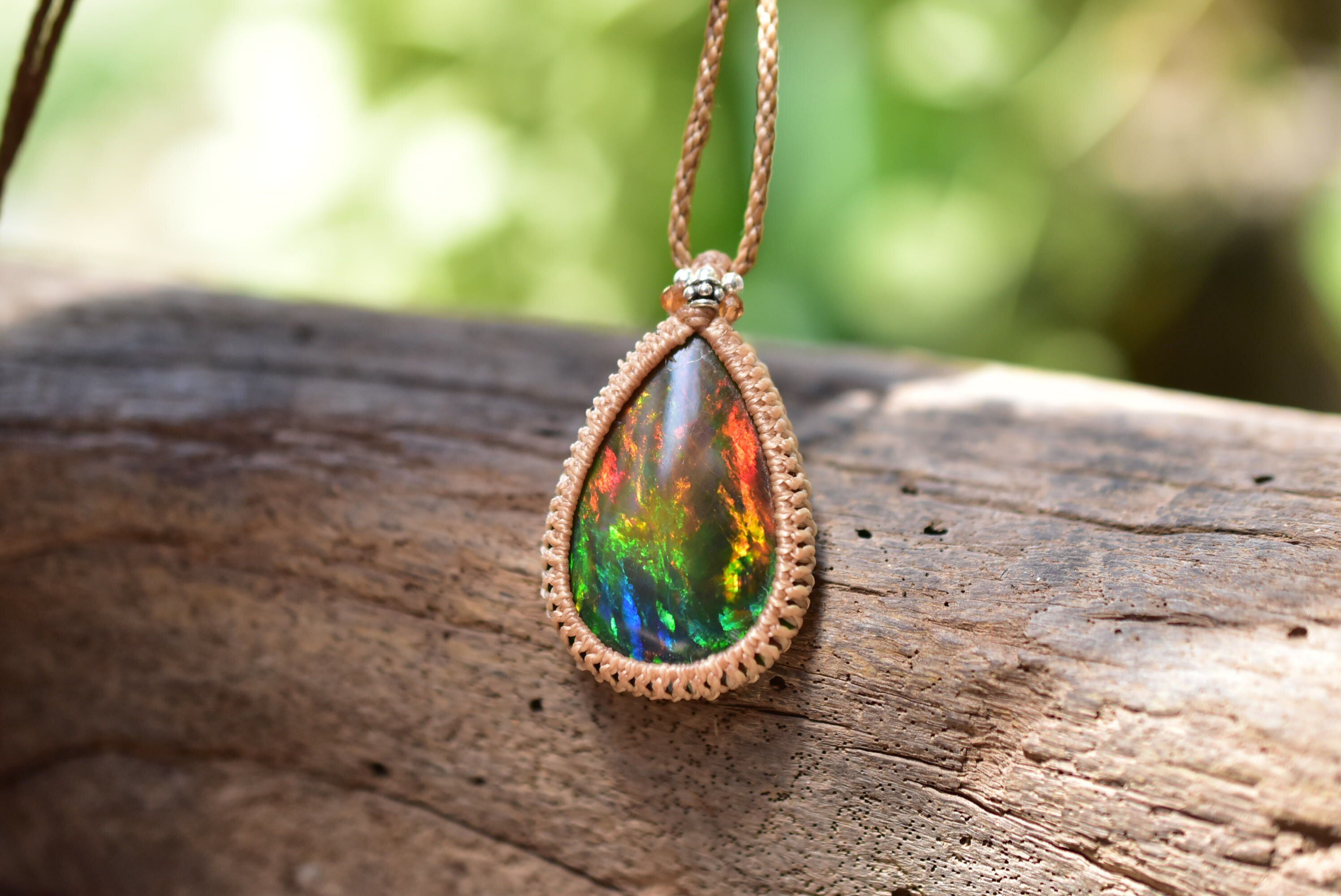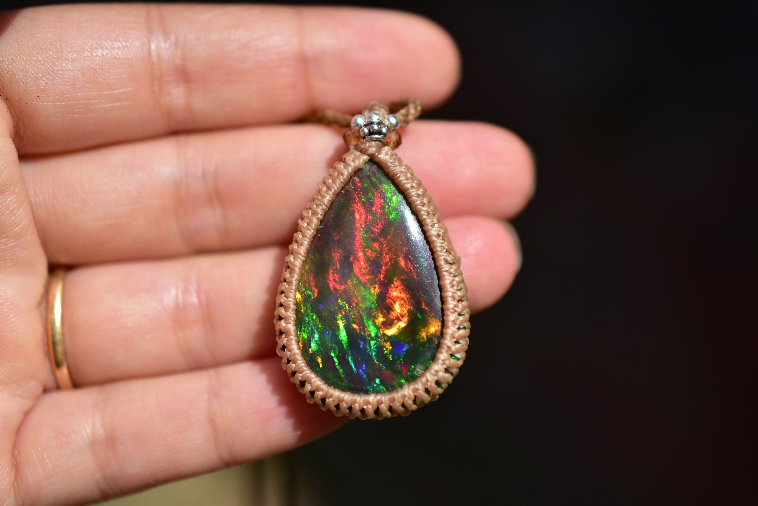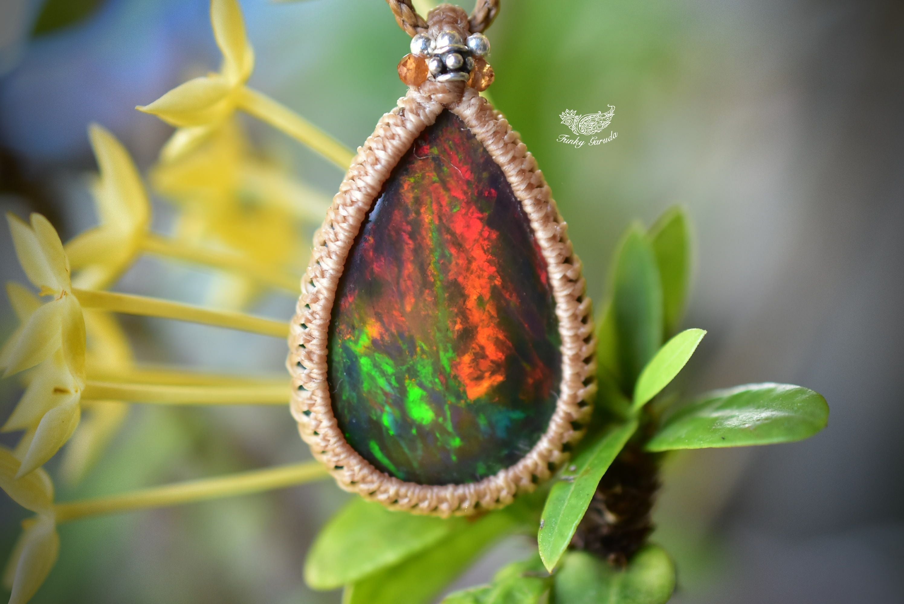 燃えさかる虹色★ブラックオパール マクラメペンダント206