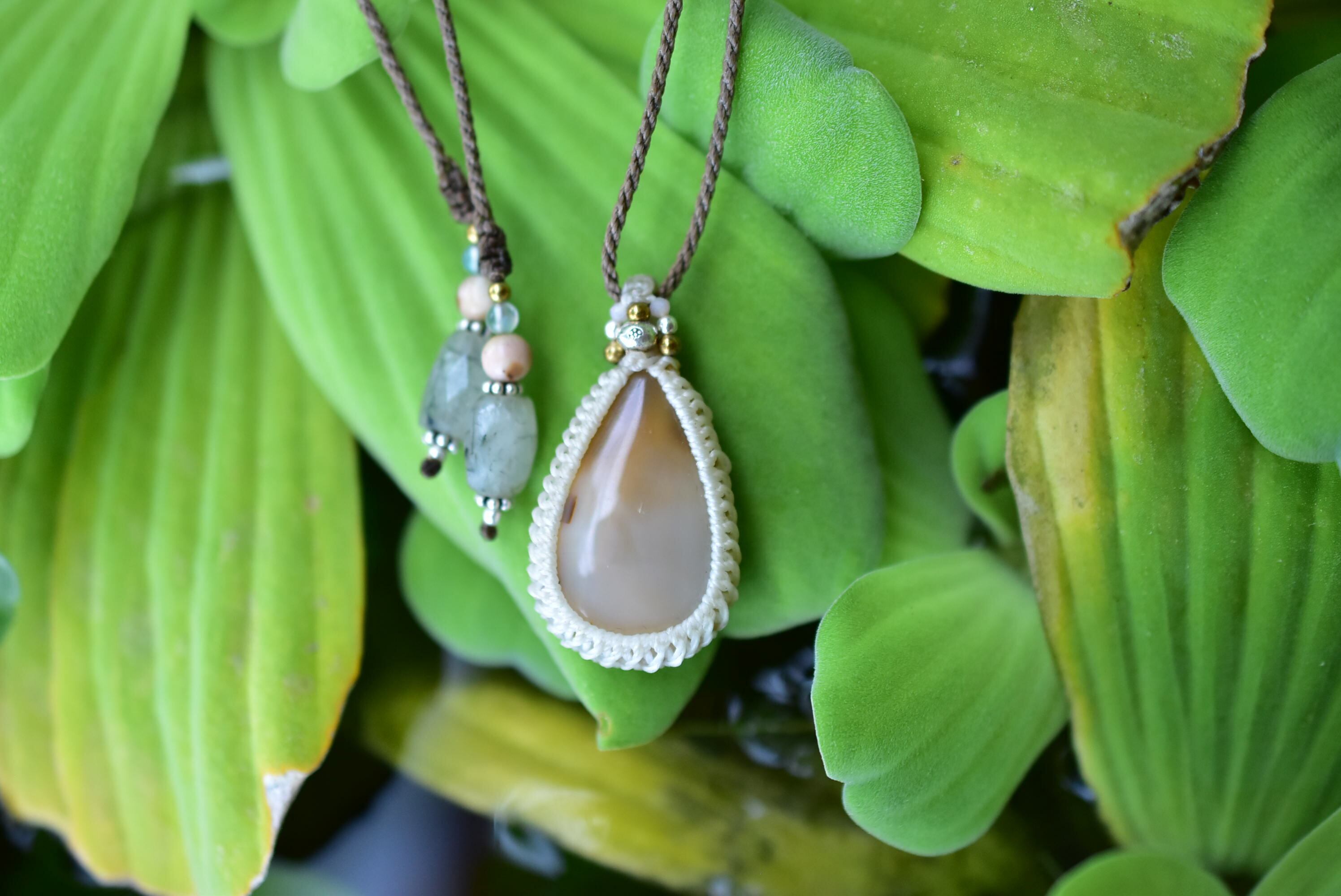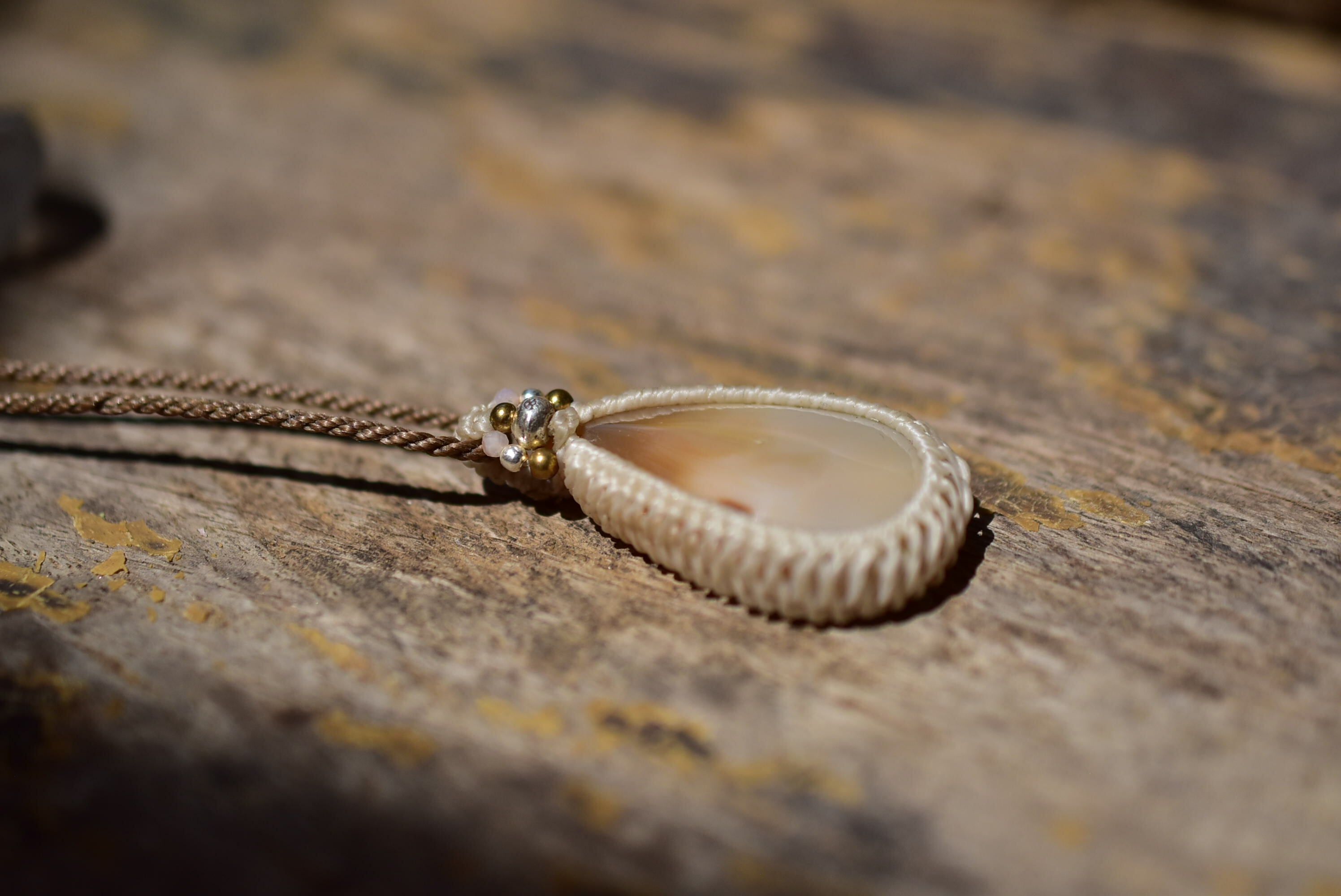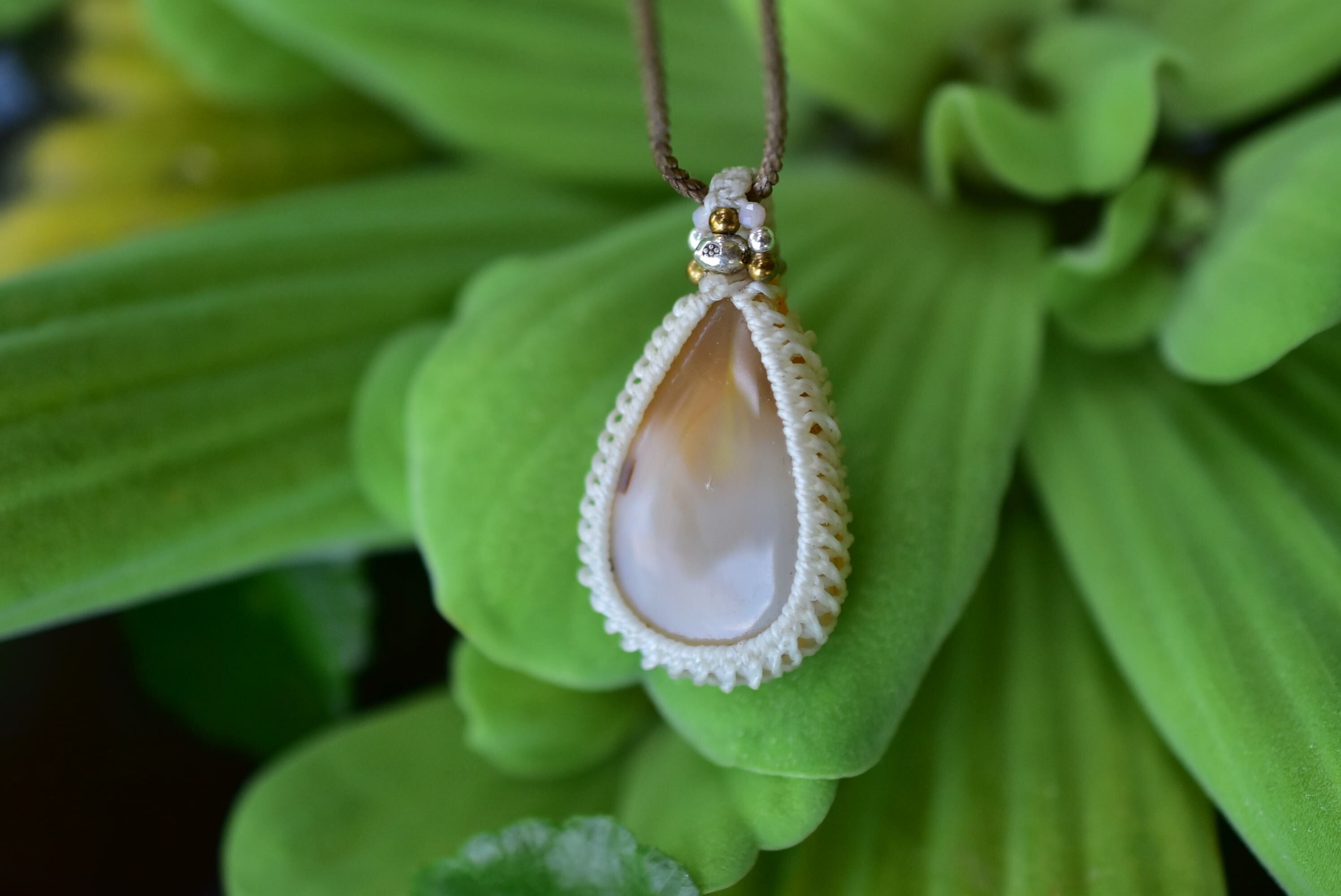 ◆このたびはホワイト、ブラウンの2色の蝋引き糸を使用しマクラメ編み装飾を施しました。