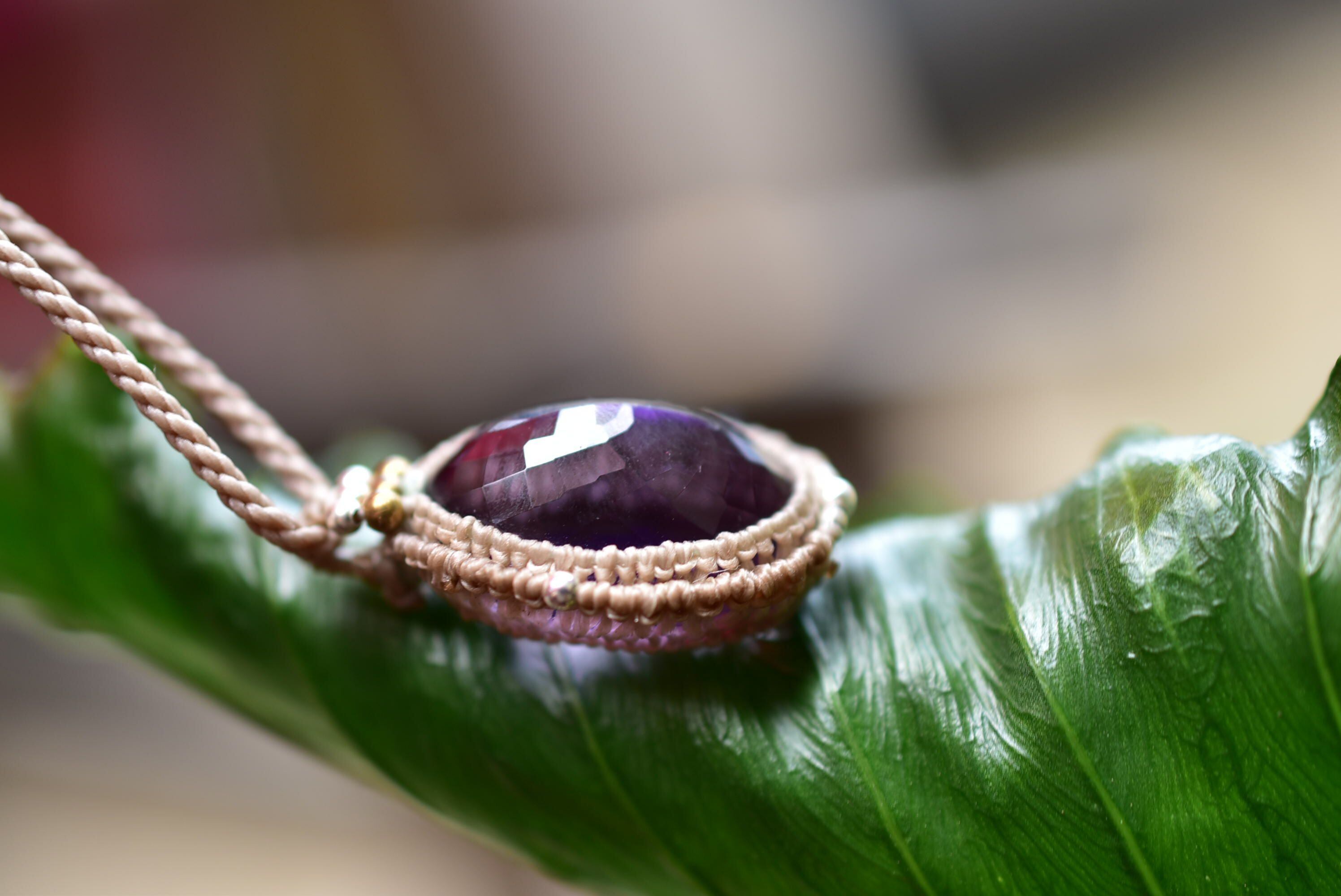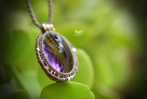 ◆このたびはカフェオレ色の蝋引き糸を使用しマクラメ編み装飾を施しました。