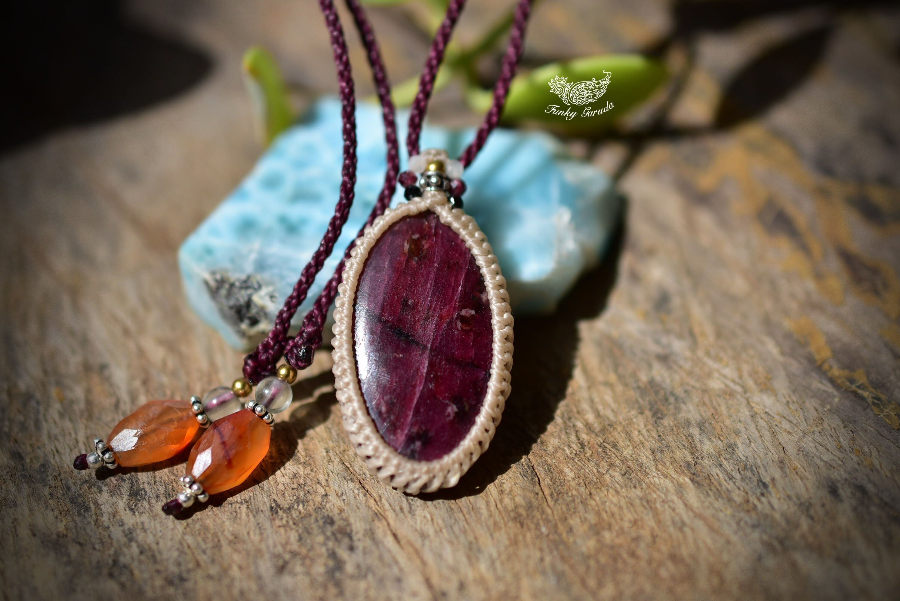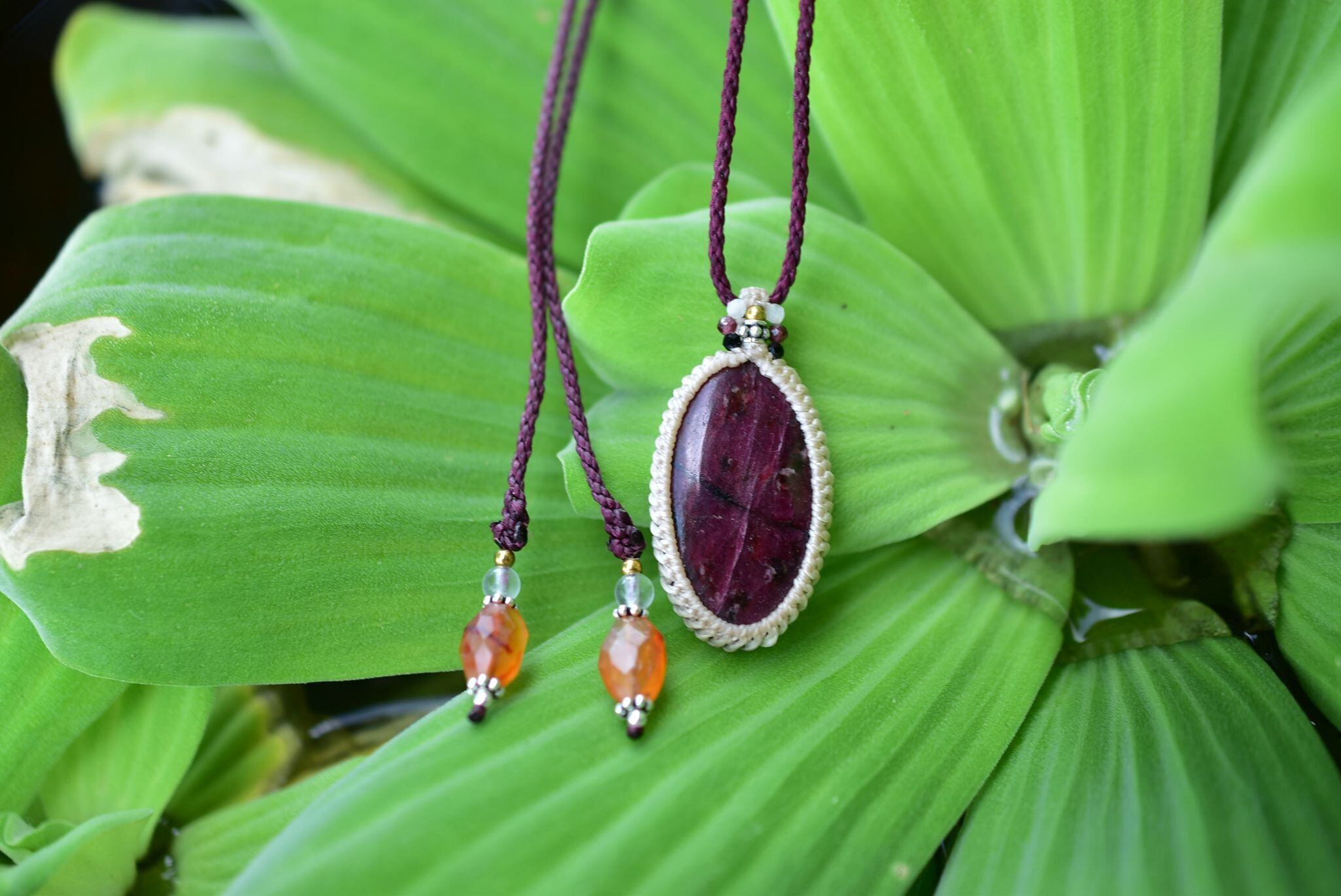 ◆このたびはキャラメル、ボルドー色の蝋引き糸を使用しマクラメ編み装飾を施しました。
