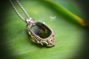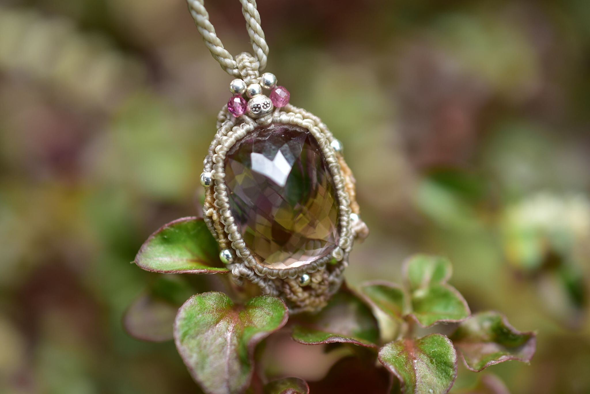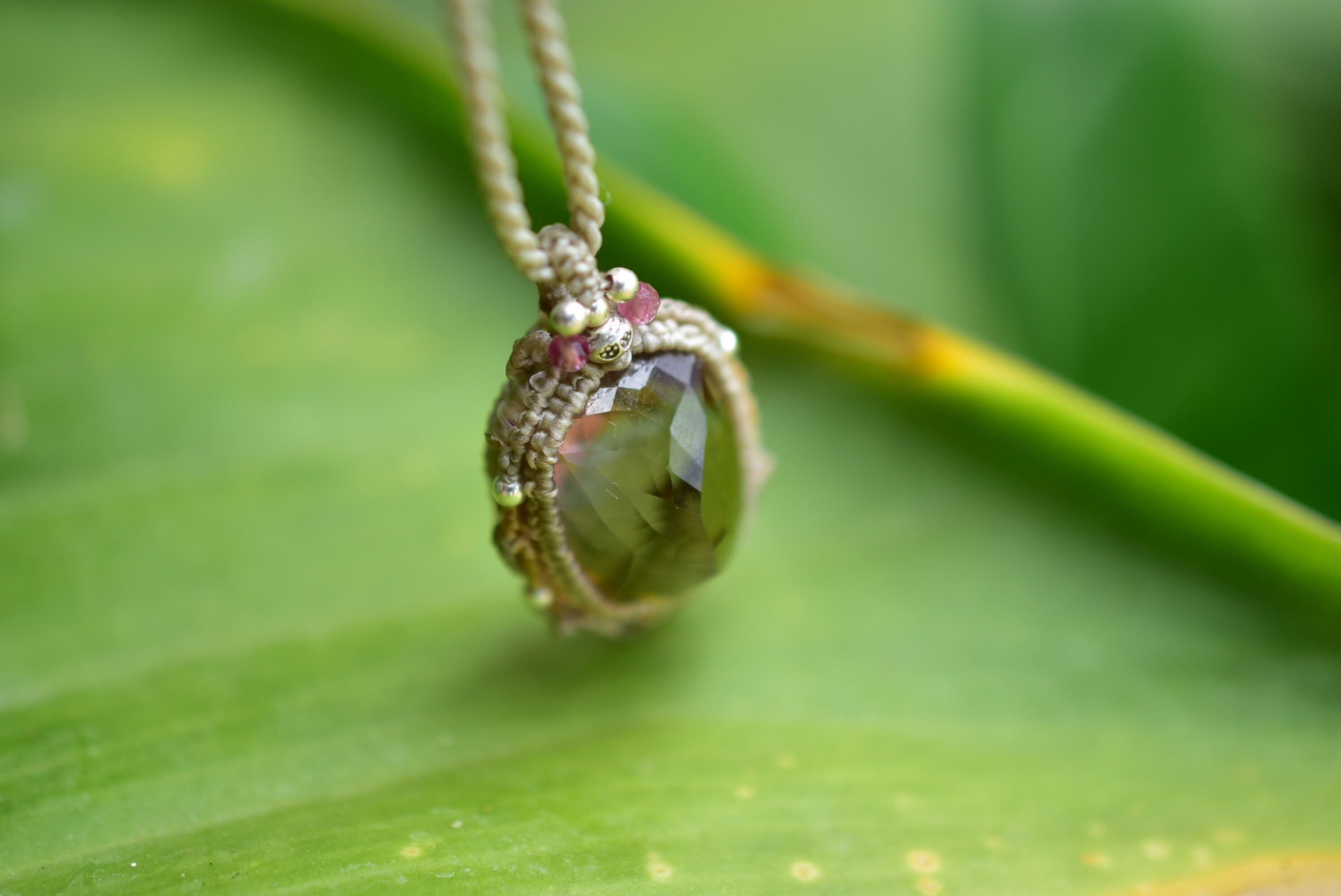 石の周りをマクラメ編み装飾を施し、