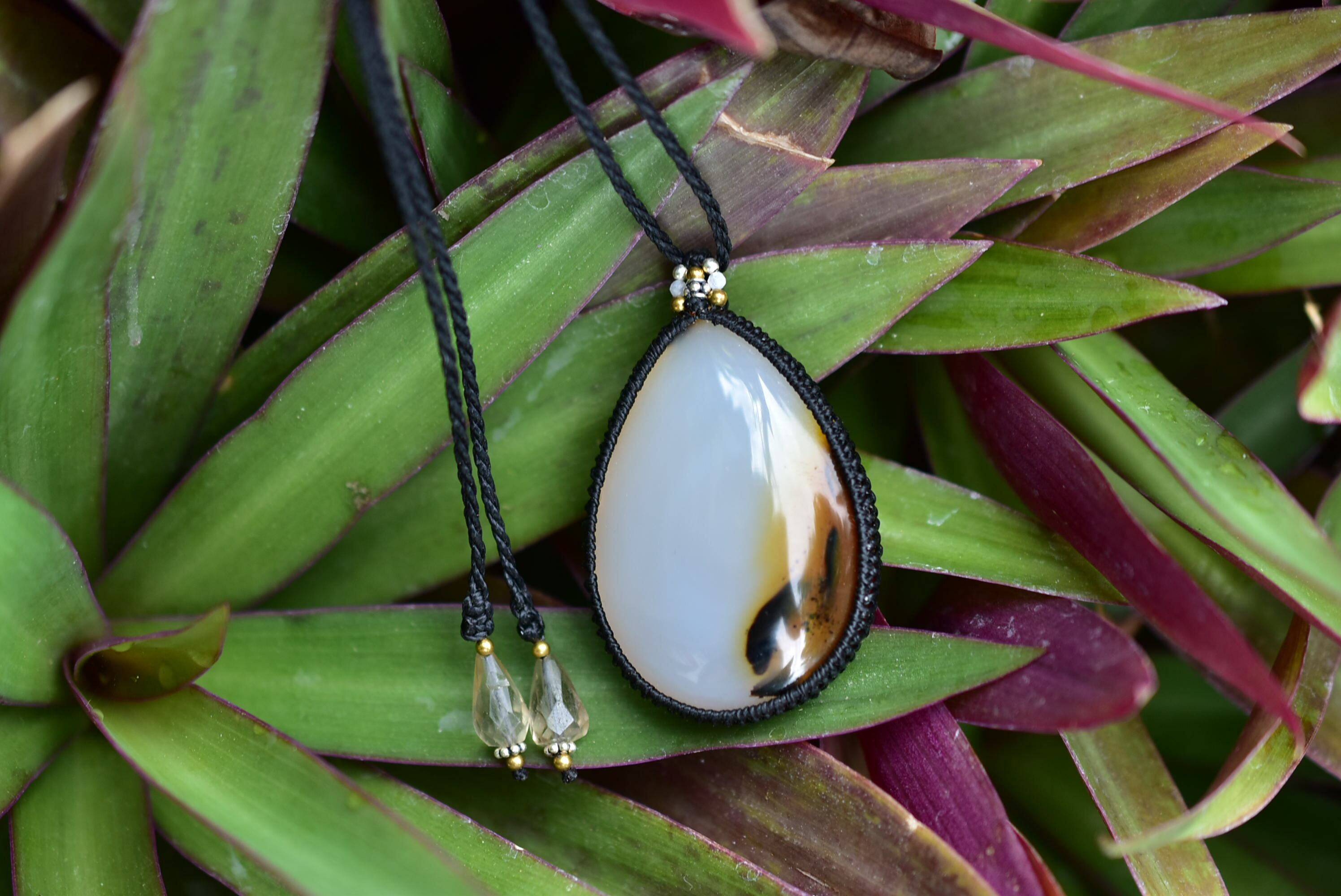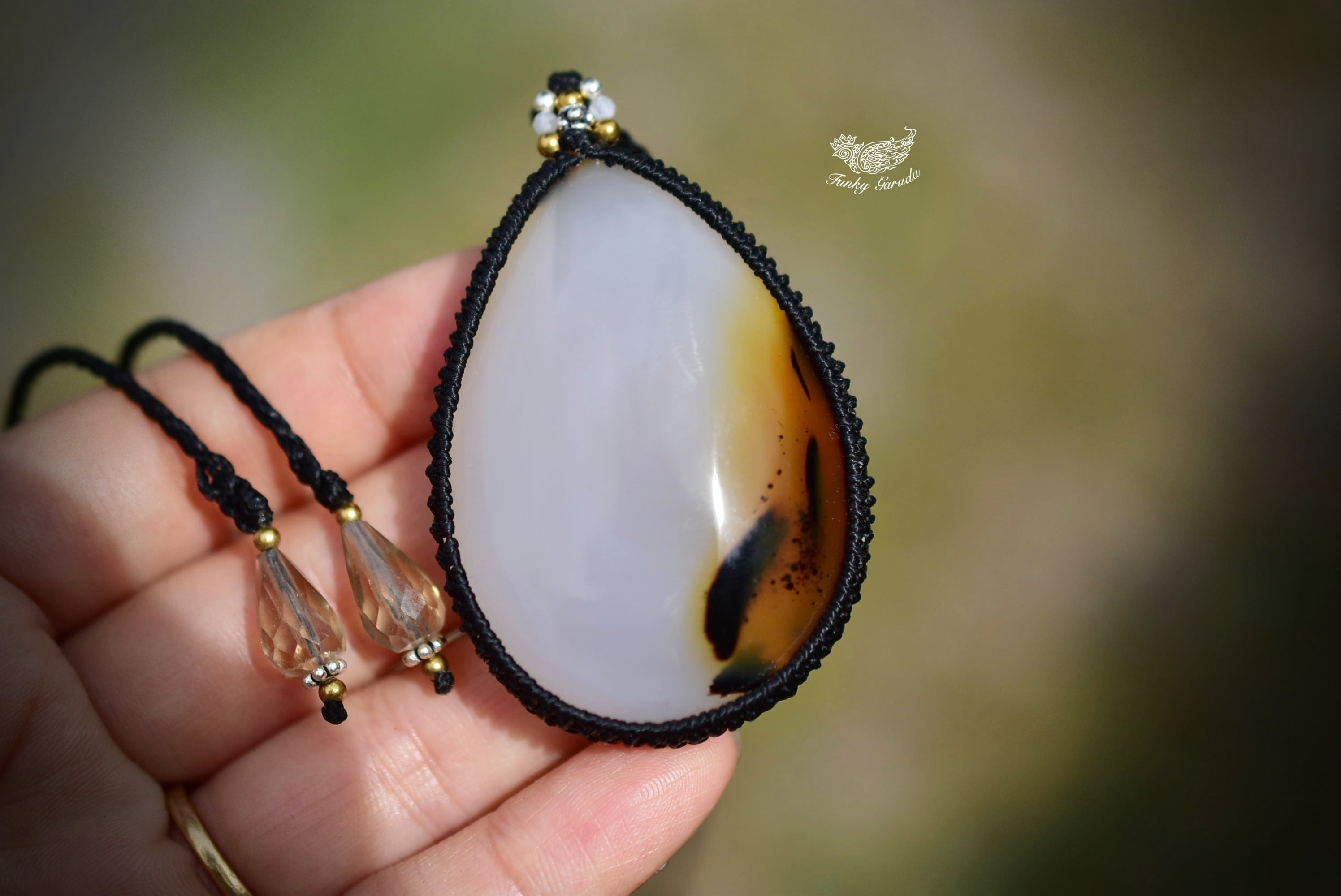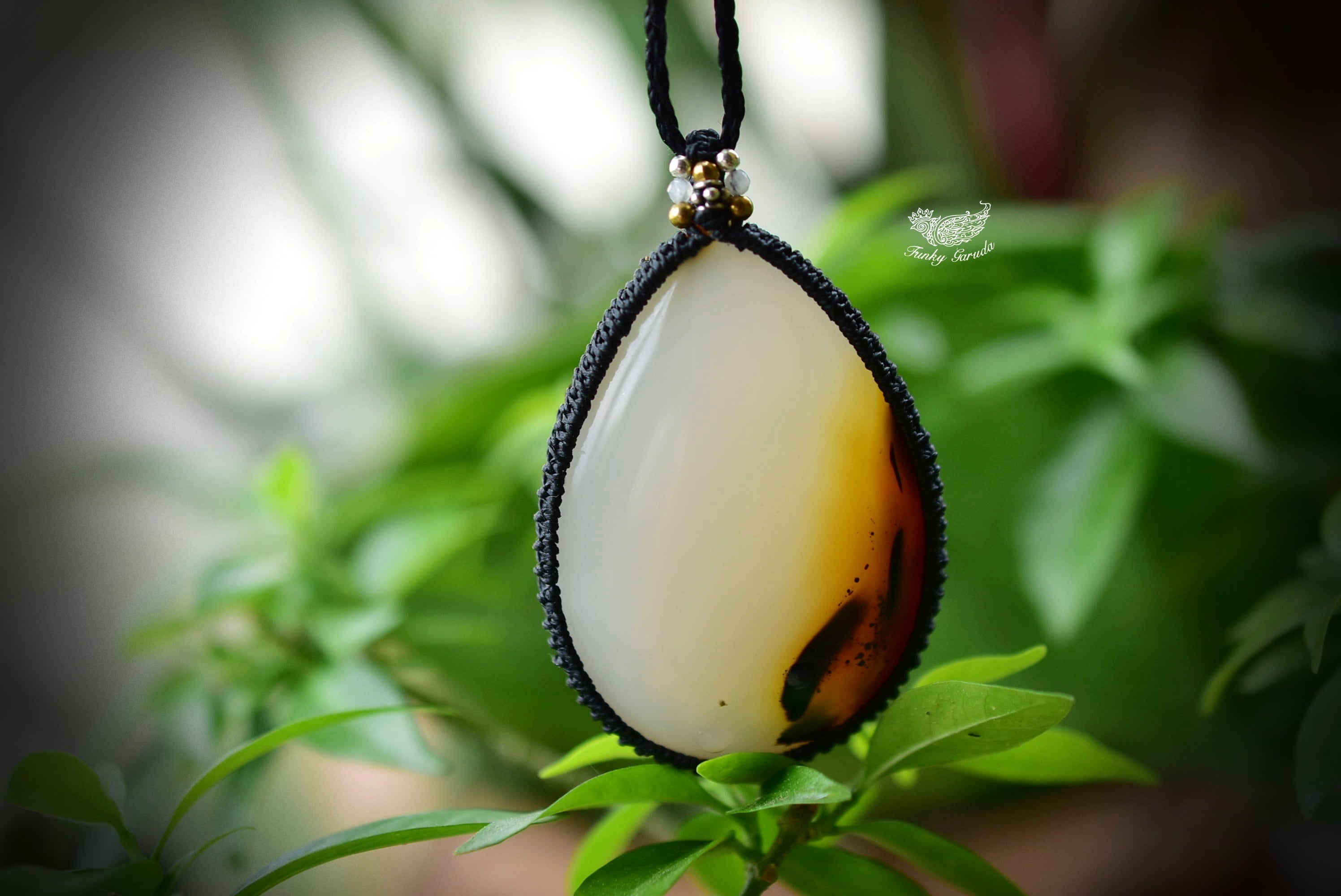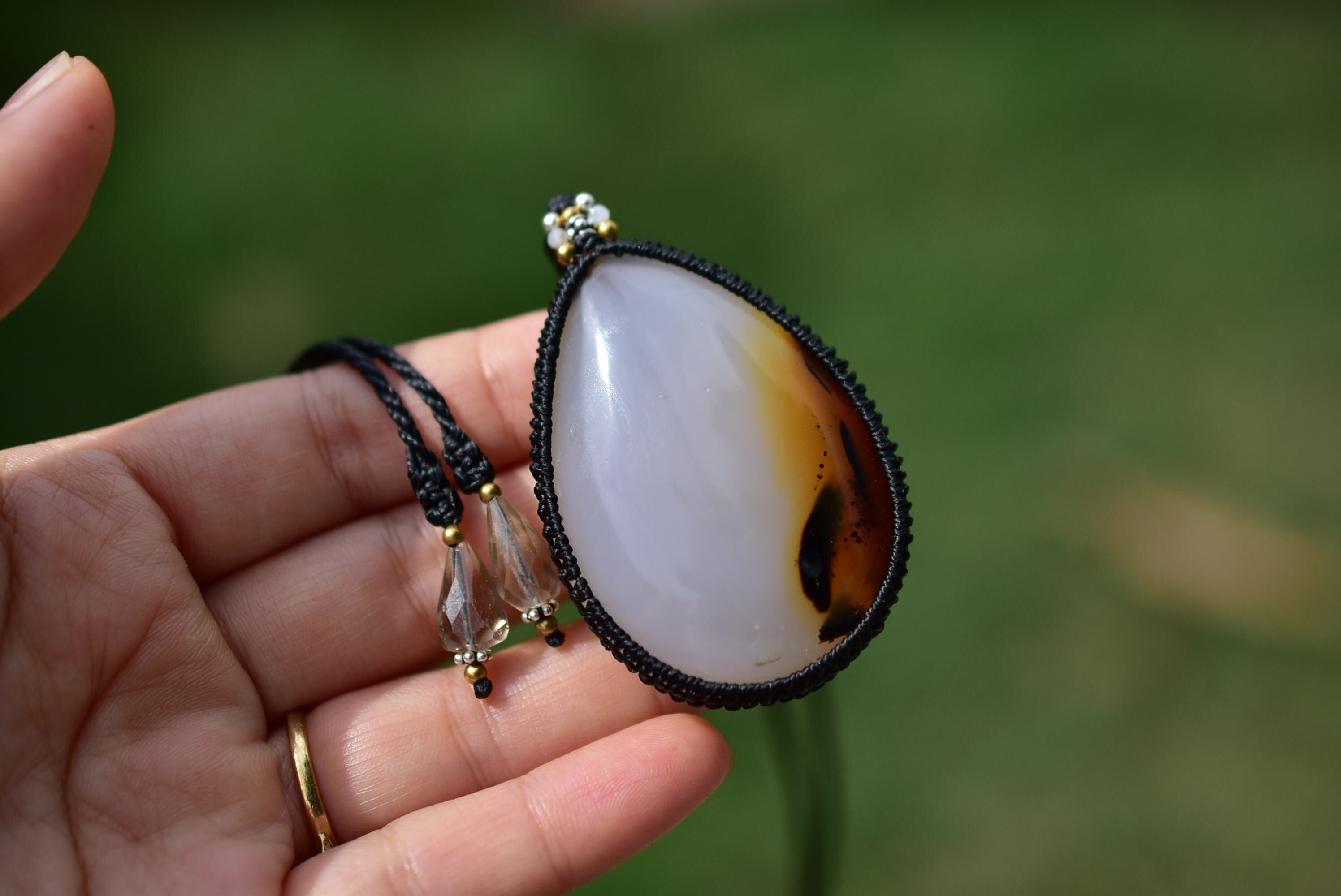 ◆このたびはブラック色の蝋引き糸を使用しマクラメ編み装飾を施しました。