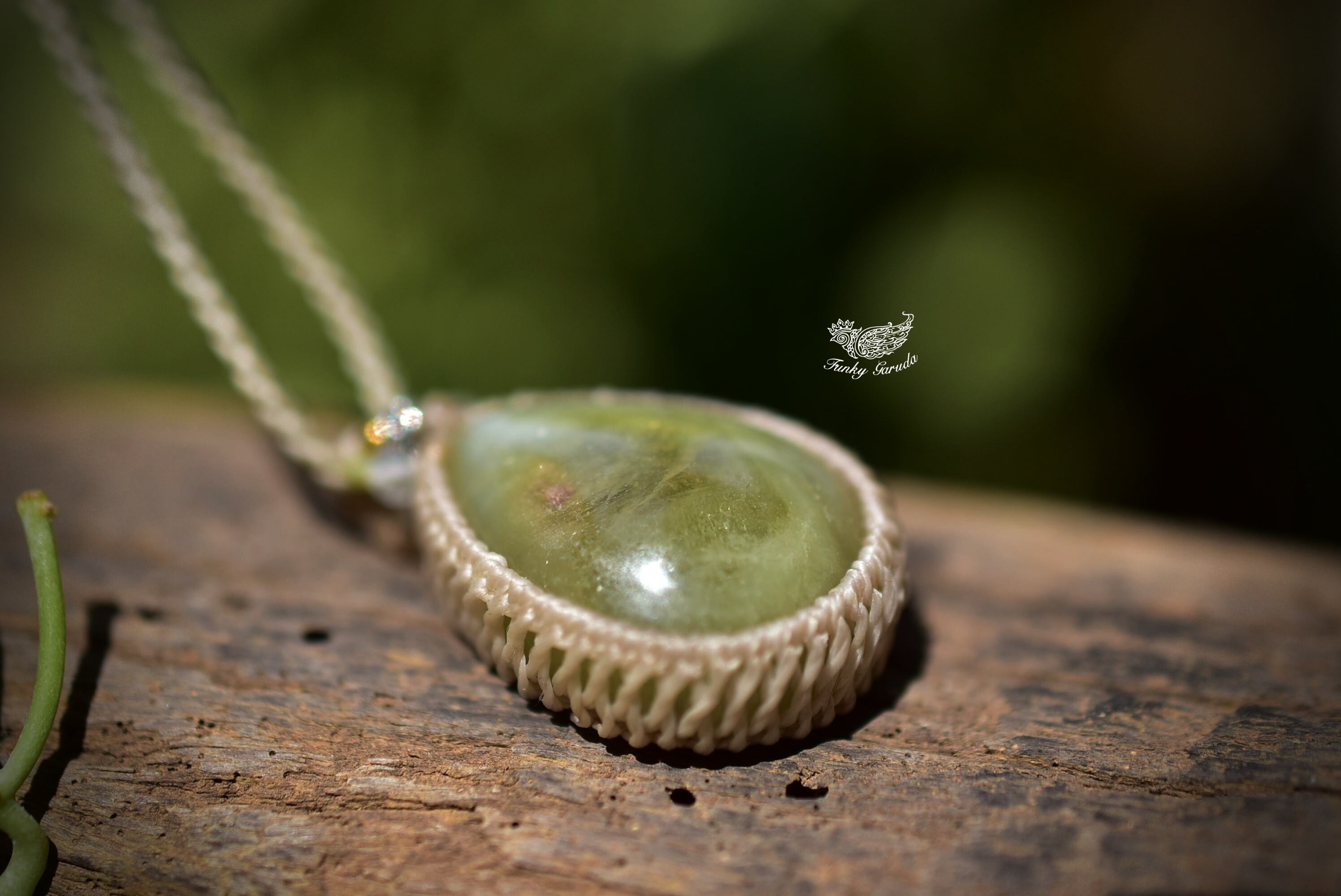 ◆このたびは生成り色の蝋引き糸を使用しマクラメ編み装飾を施しました。