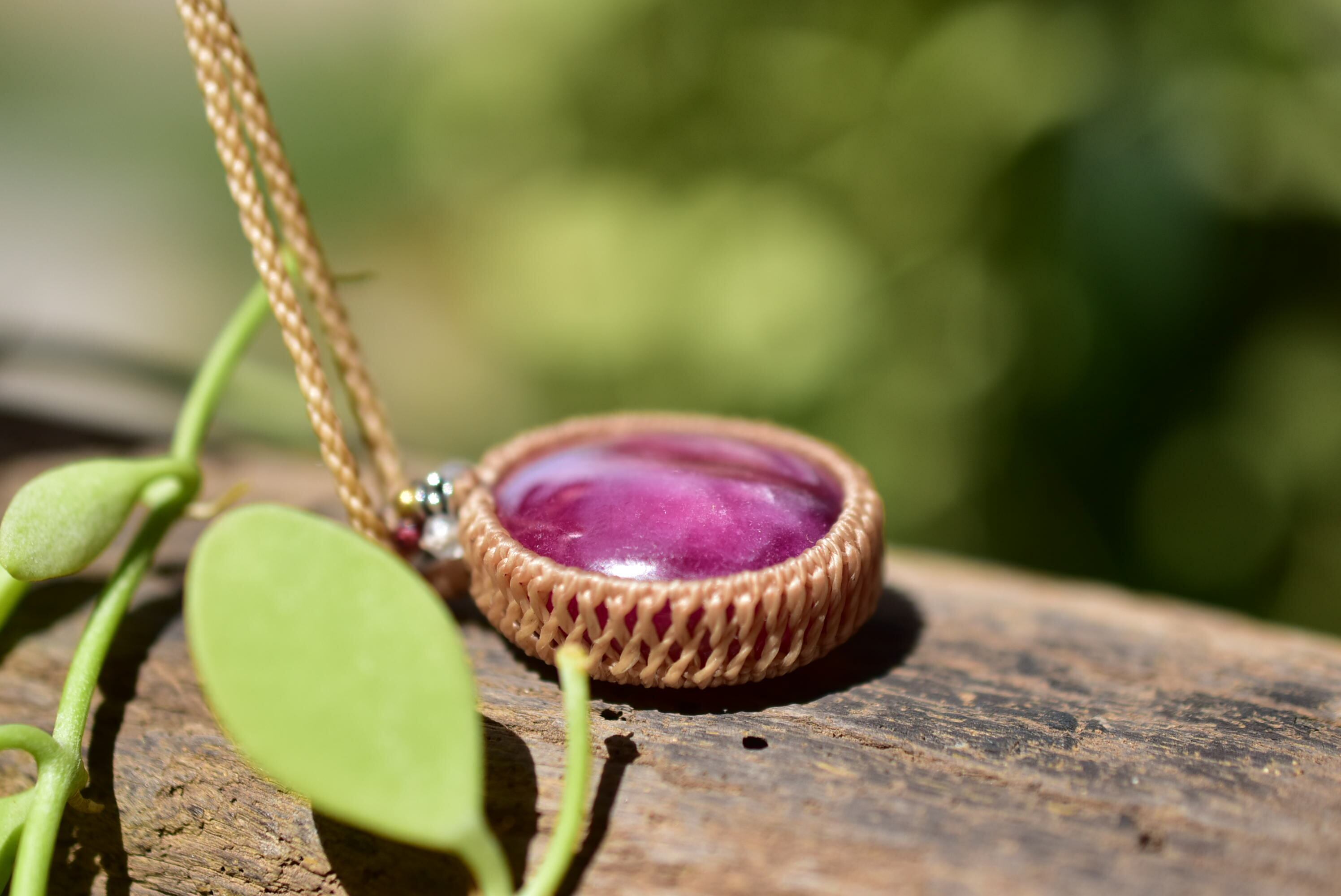 ロウビキ糸にて巻き込み、マクラメペンダントに仕上げました。