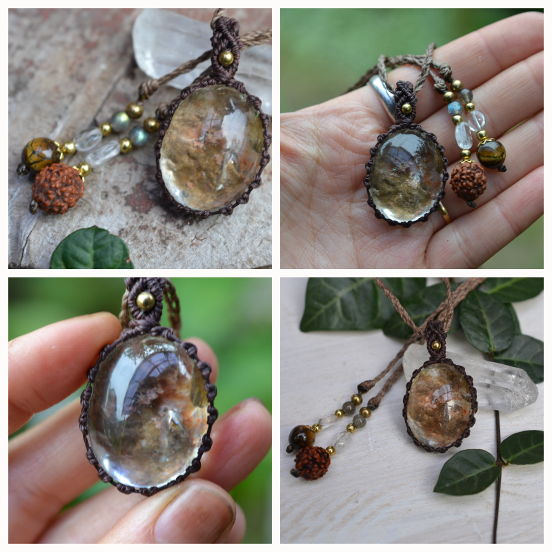 シンプルに編み上げています。キラリと光るインクルージョンもしっかりと携わっており、生きた地球の大地を水晶の中にとじこめたような印象をもらえるガーデンクォーツです。この石にラブラドライトビーズや菩提樹の実、真鍮素材をあしらうことでアンティーク感漂うペンダントに仕上がりました。