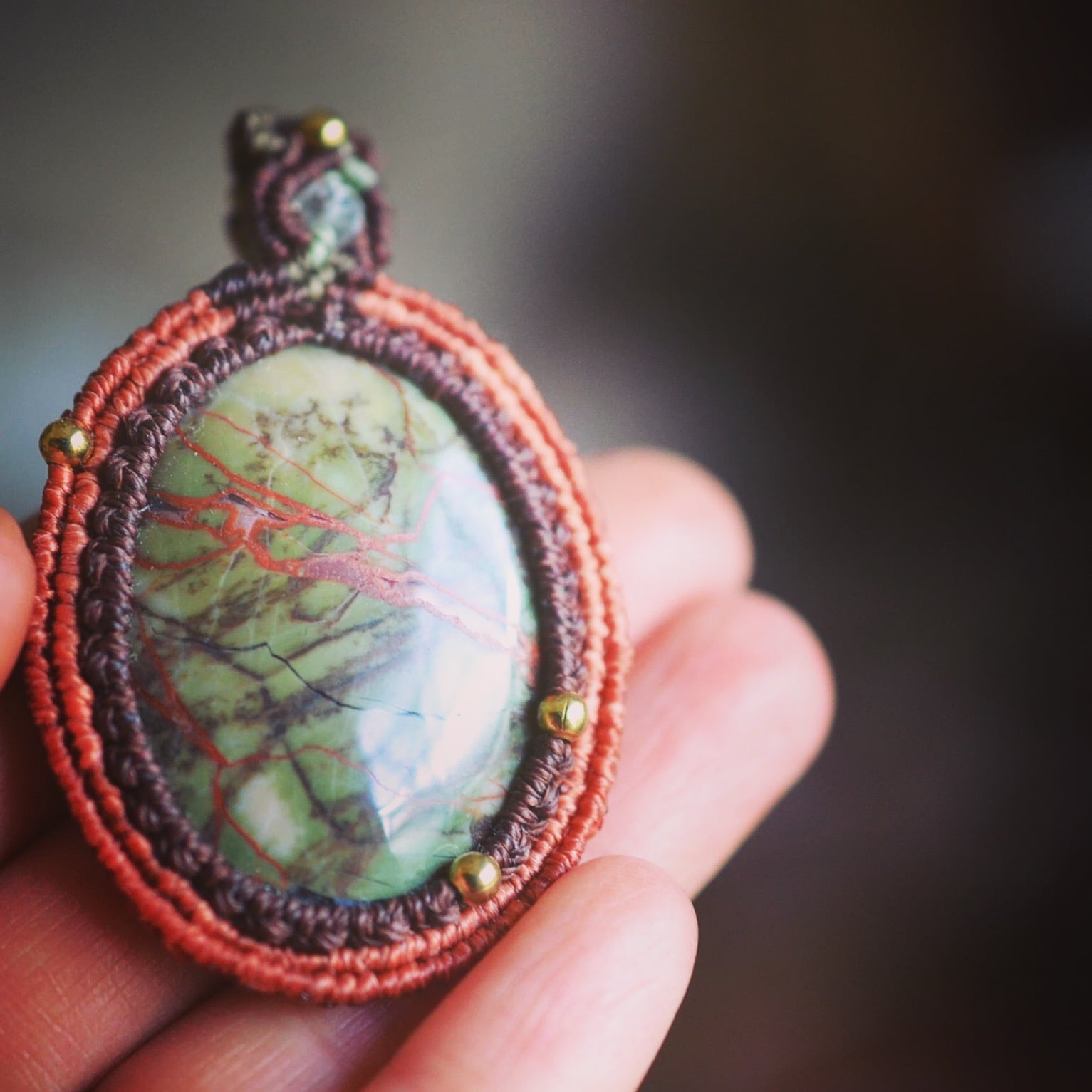 このたび、中国からきた神秘の石レインフォレストジャスパーをマクラメ編みペンダントに仕上げました。