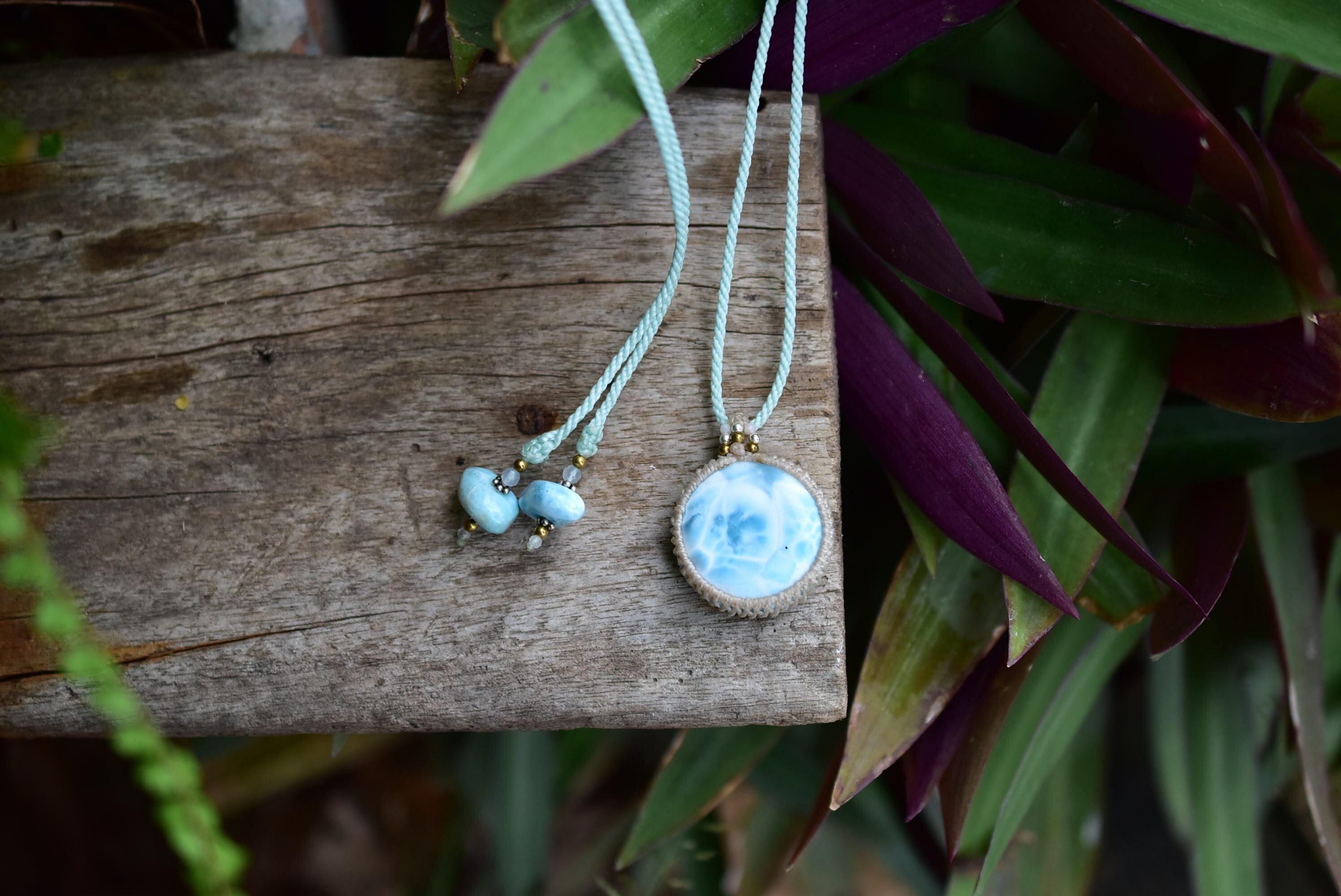 ◆このたびはミント、ナチュラルホワイト色の蝋引き糸を使用しマクラメ編み装飾を施しました。