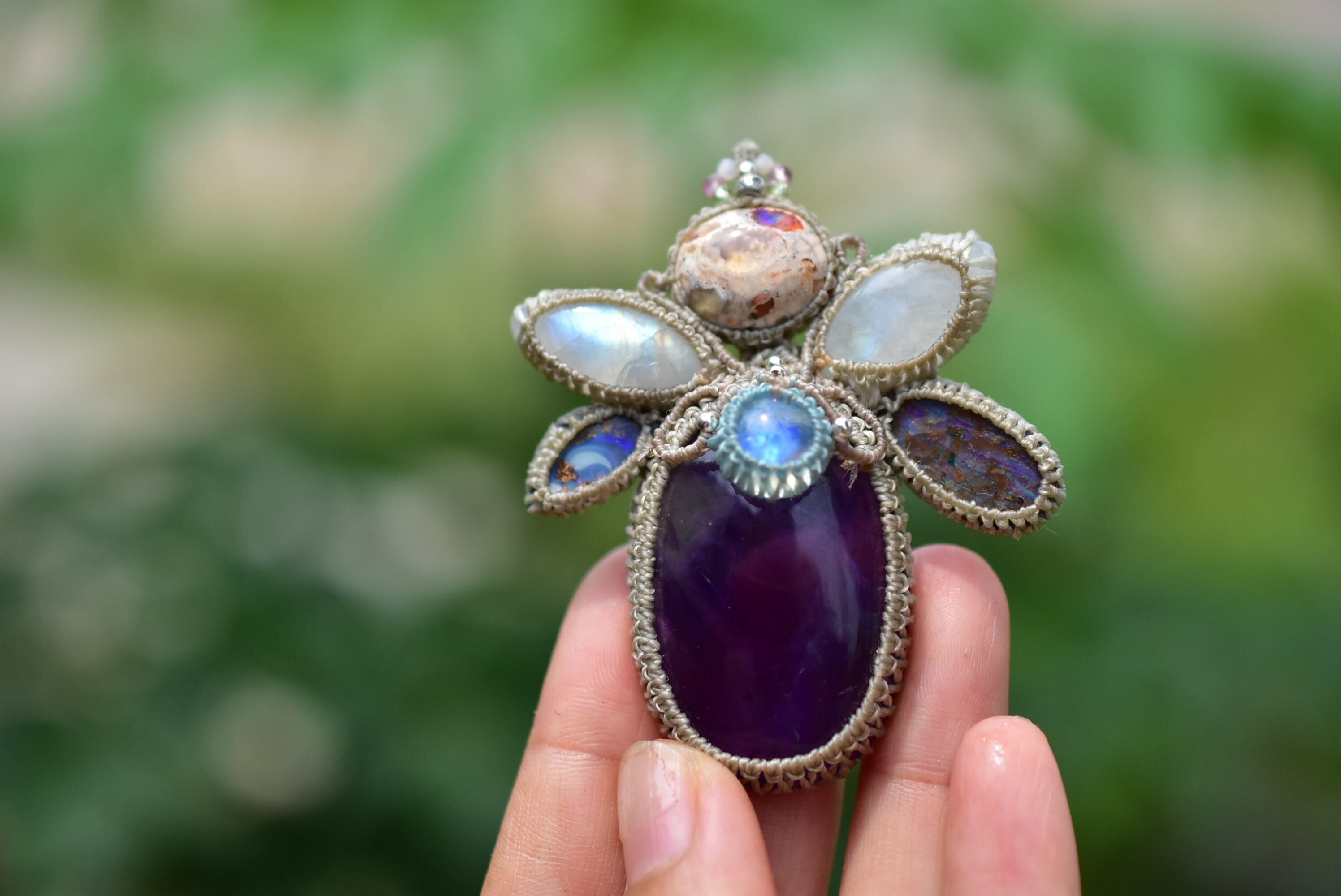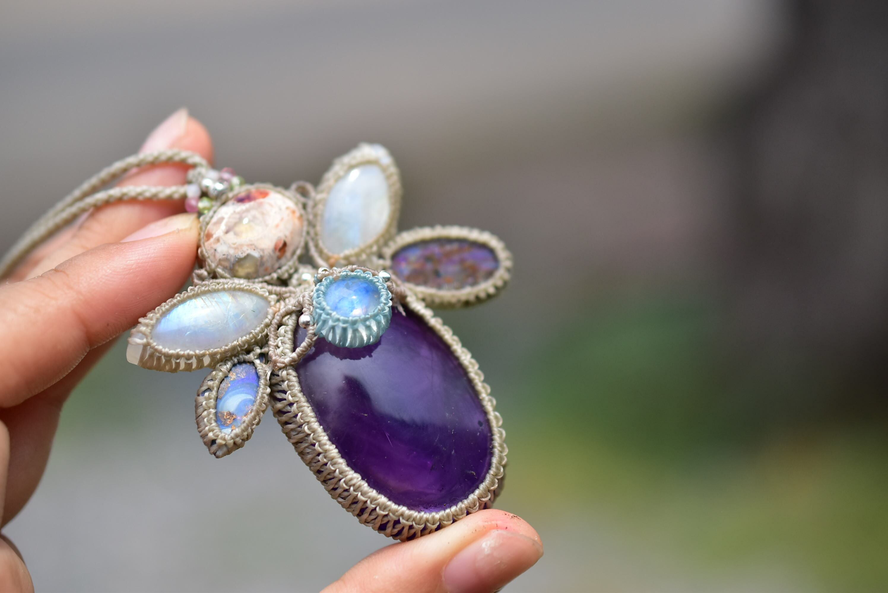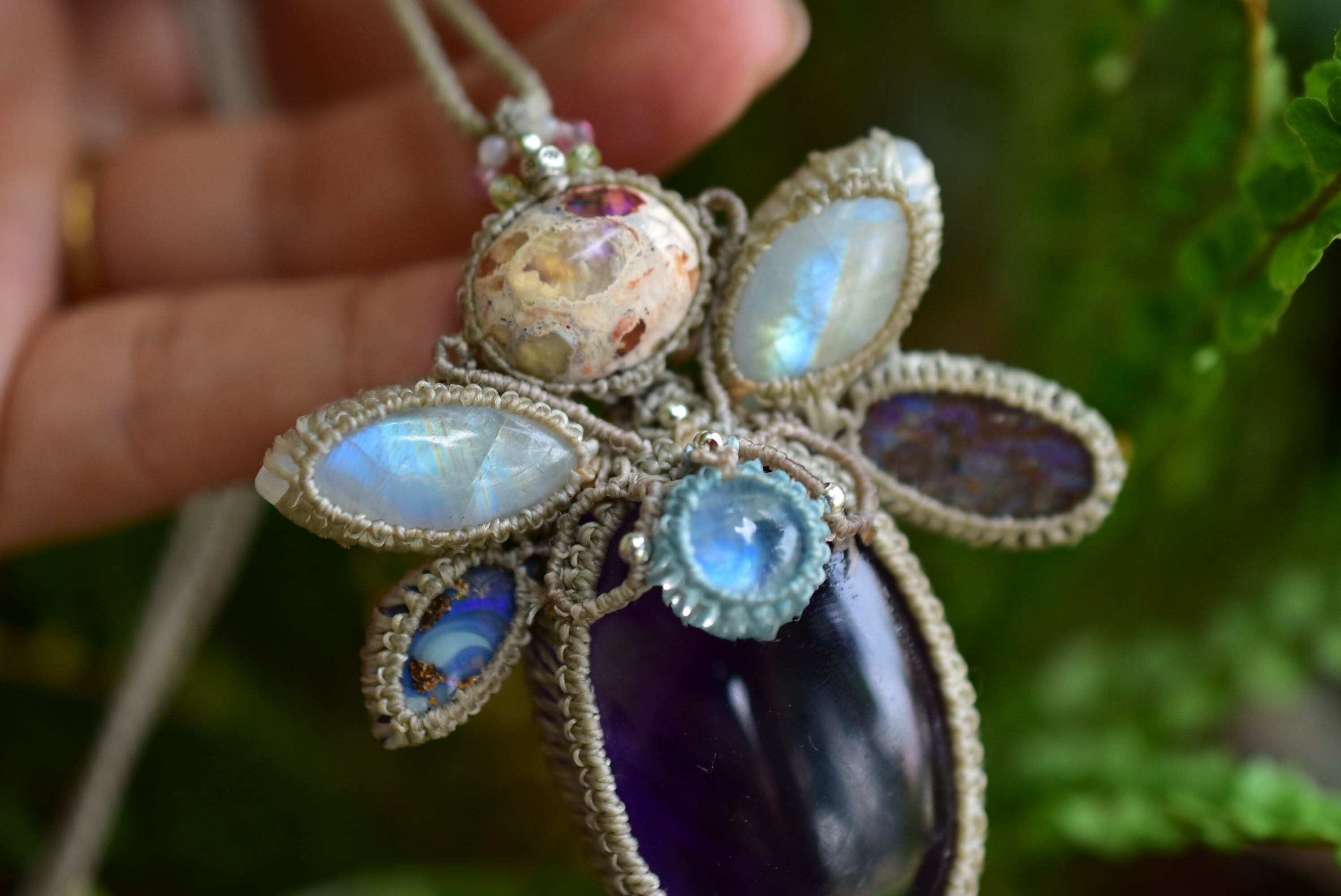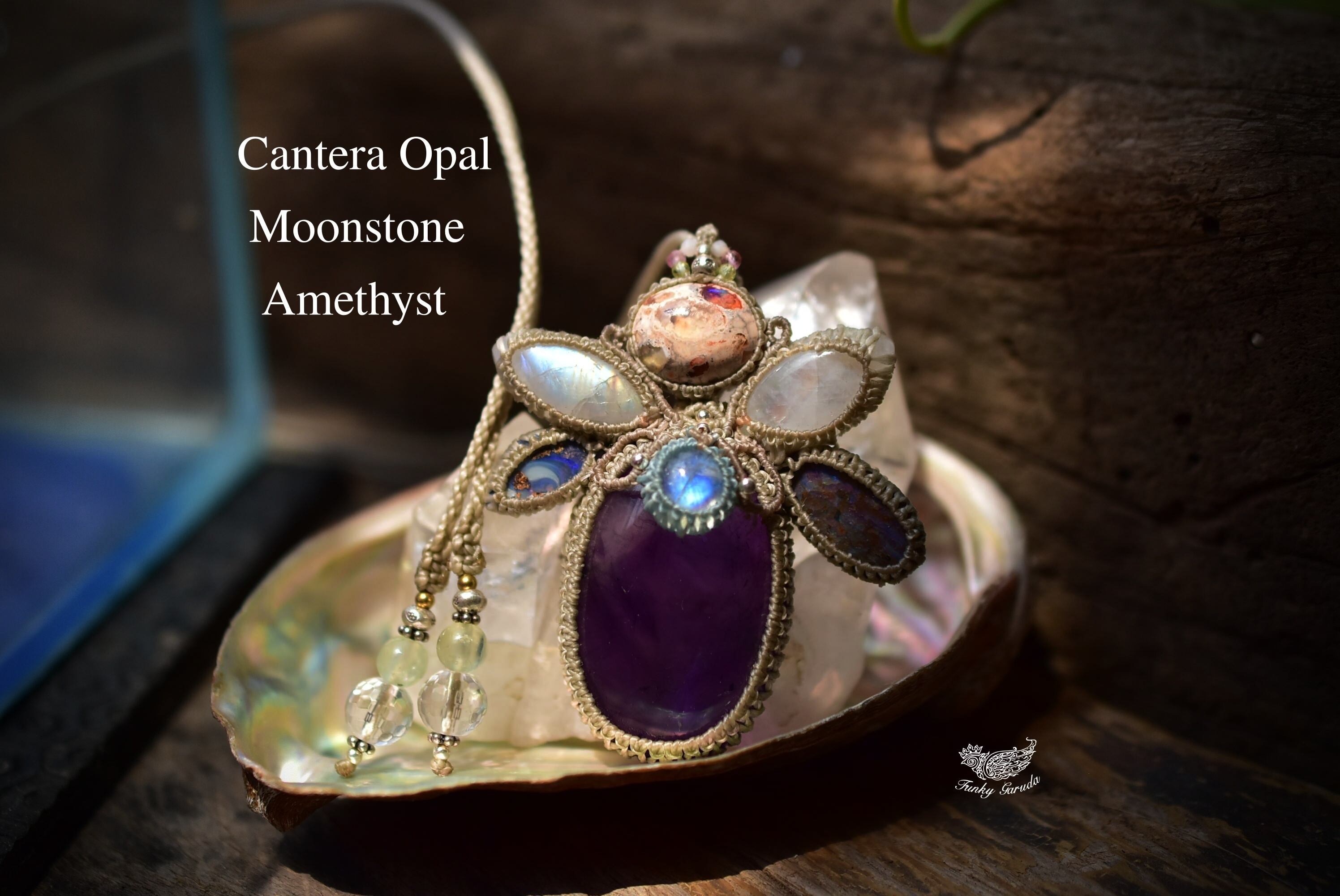 羽ばたくプリズムと月の影★アメジスト ムーンストーン ダブルオパール マクラメペンダント300