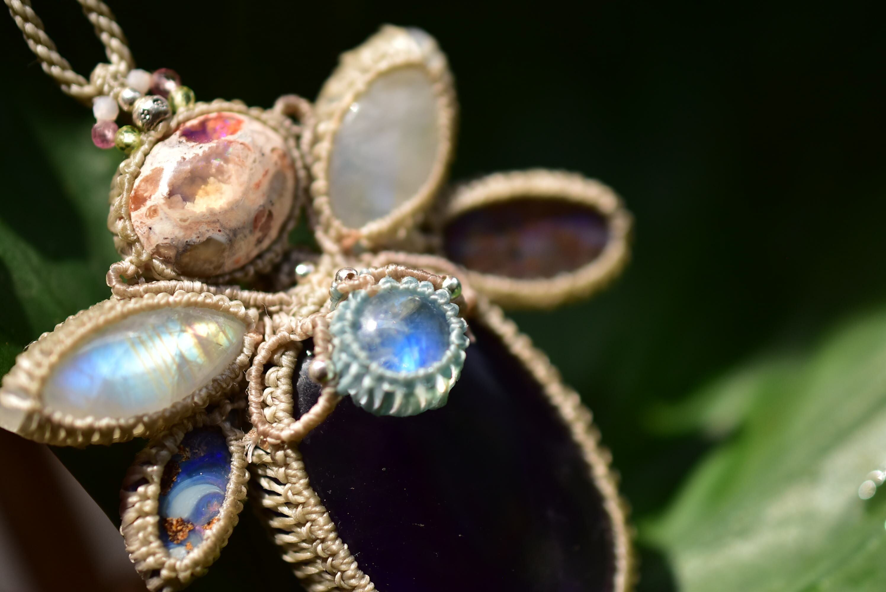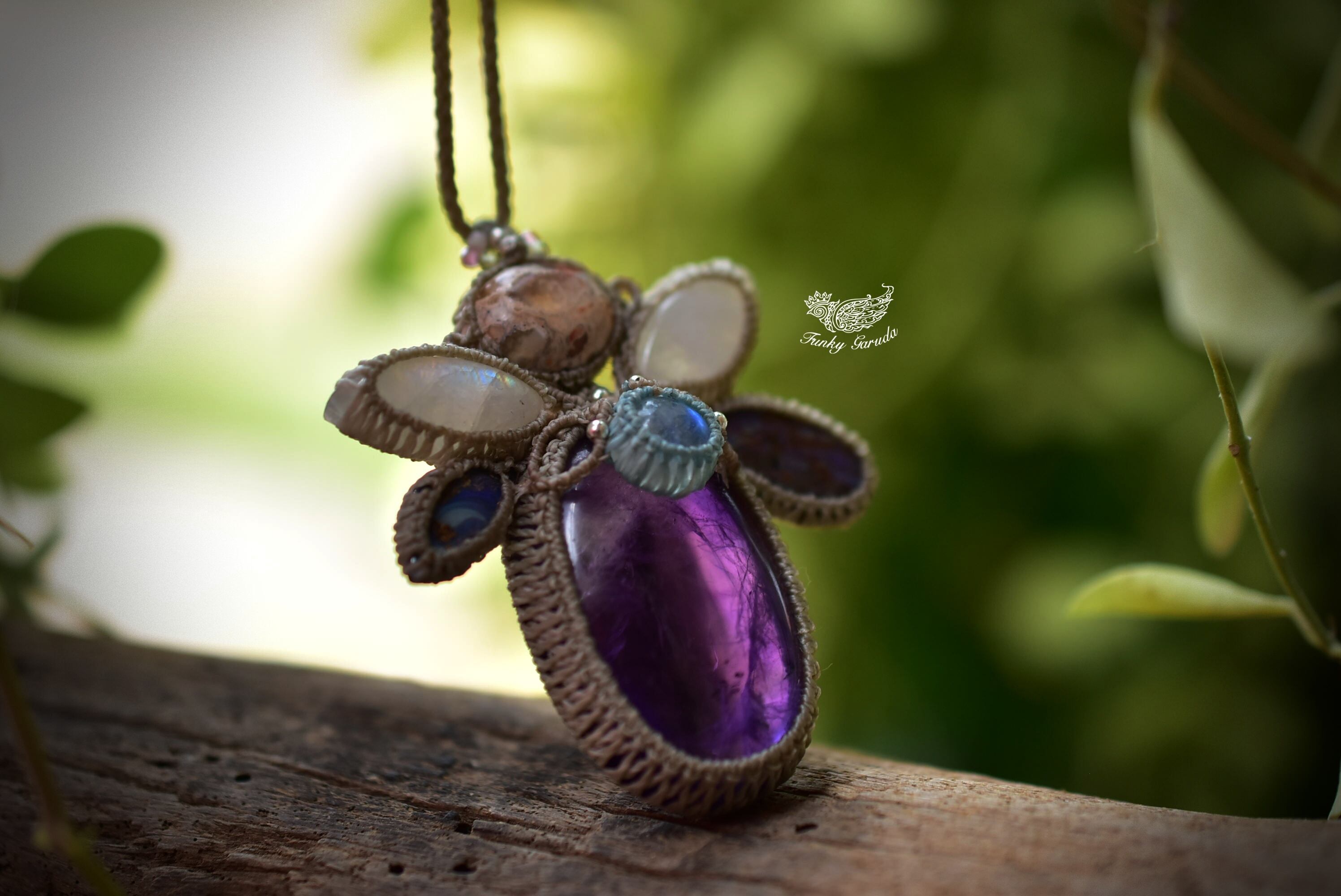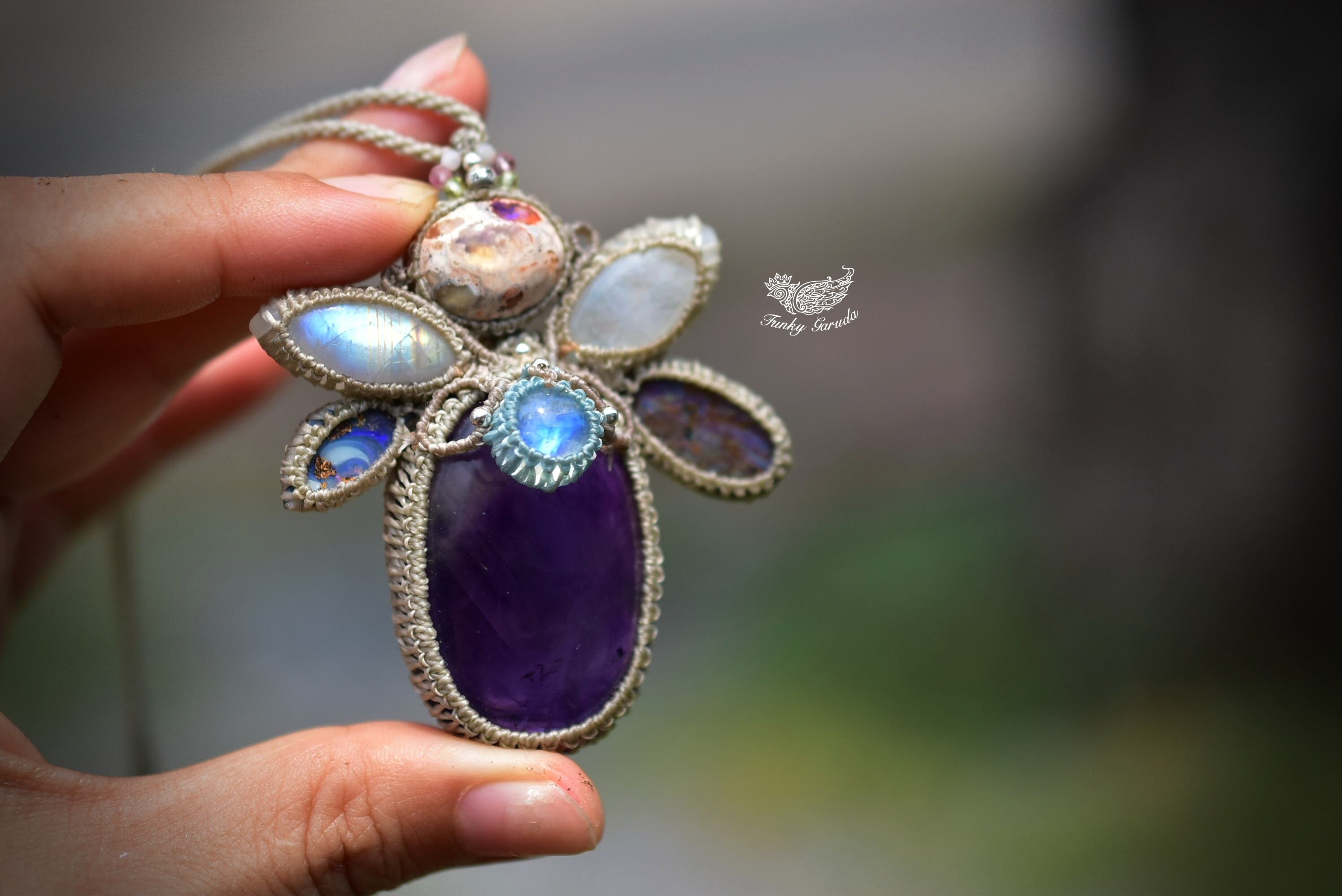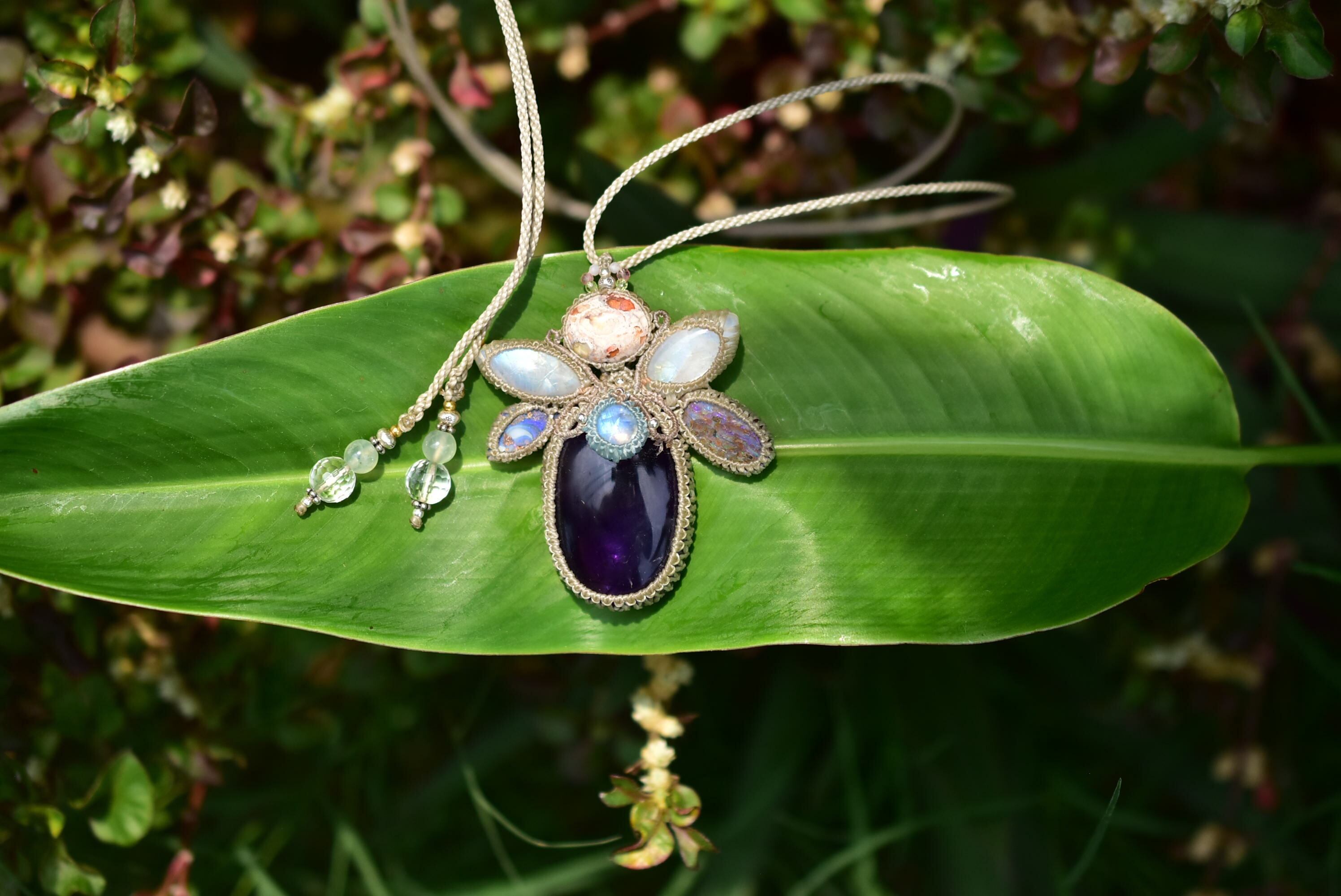 羽ばたくプリズムと月の影★アメジスト ムーンストーン ダブルオパール マクラメペンダント300