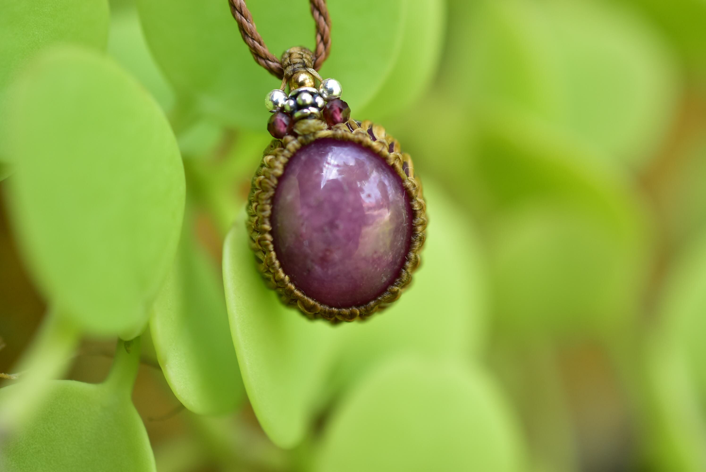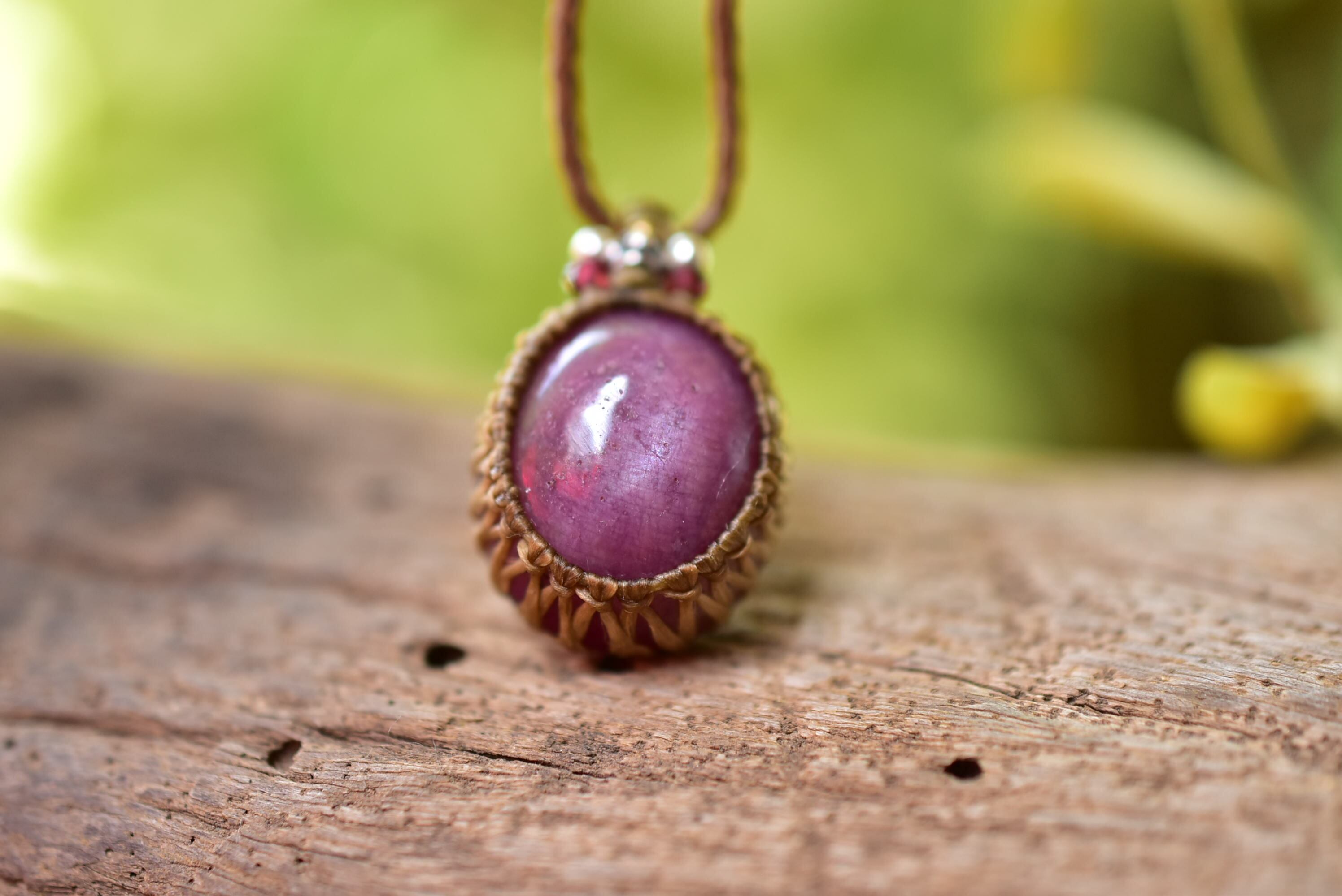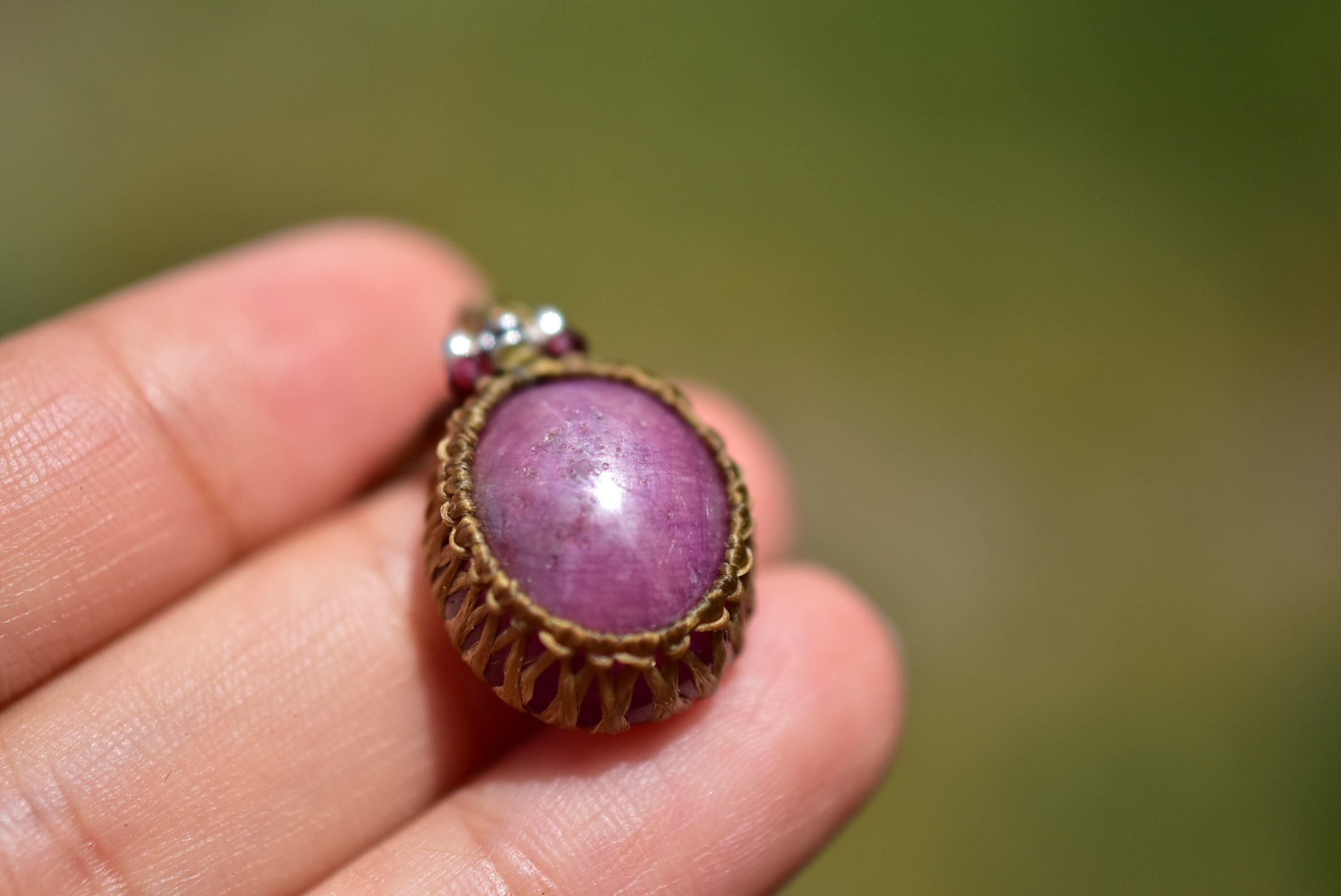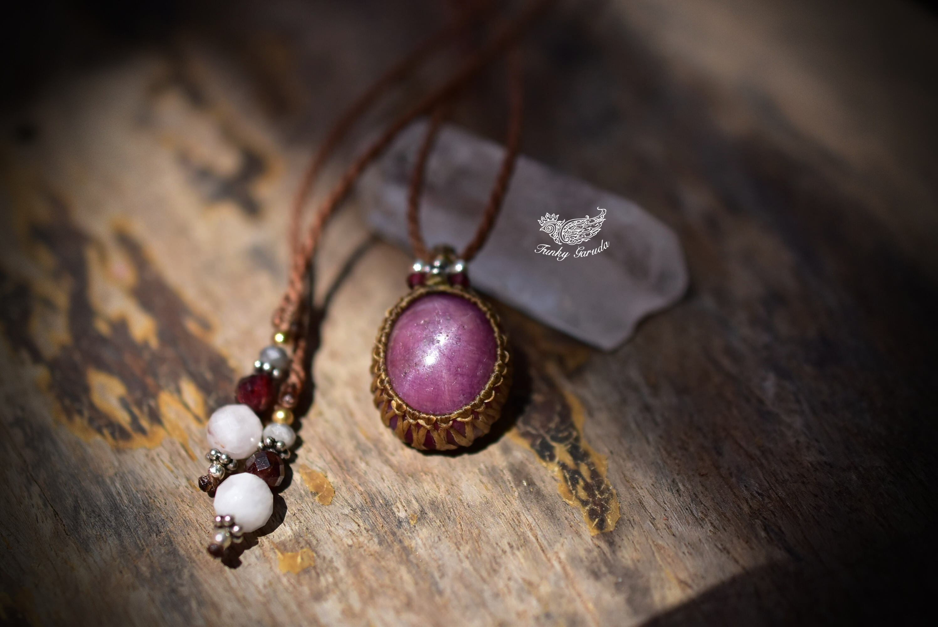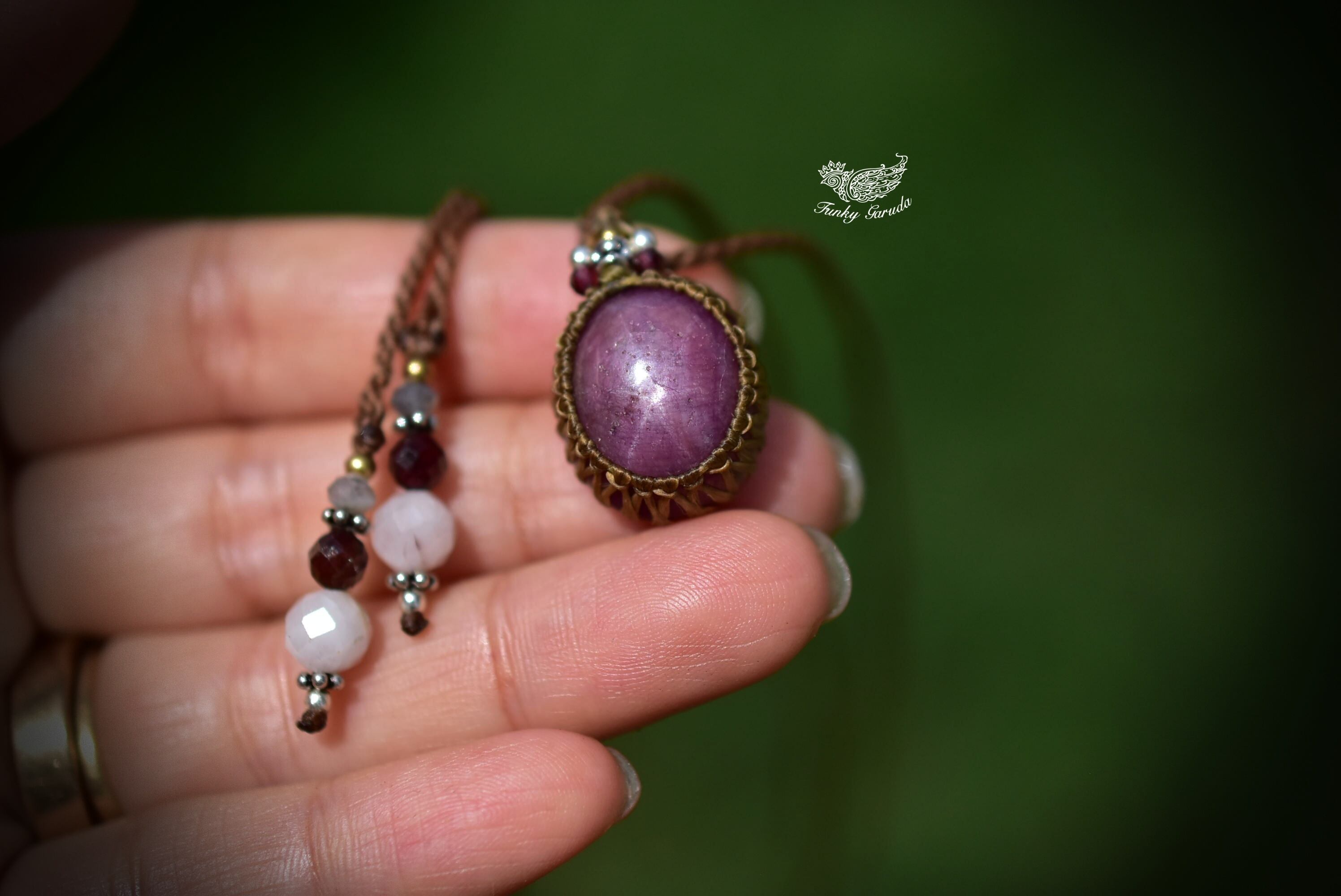 小粒タイプのスタールビーをそのまま小さくマクラメペンダントに仕上げています。