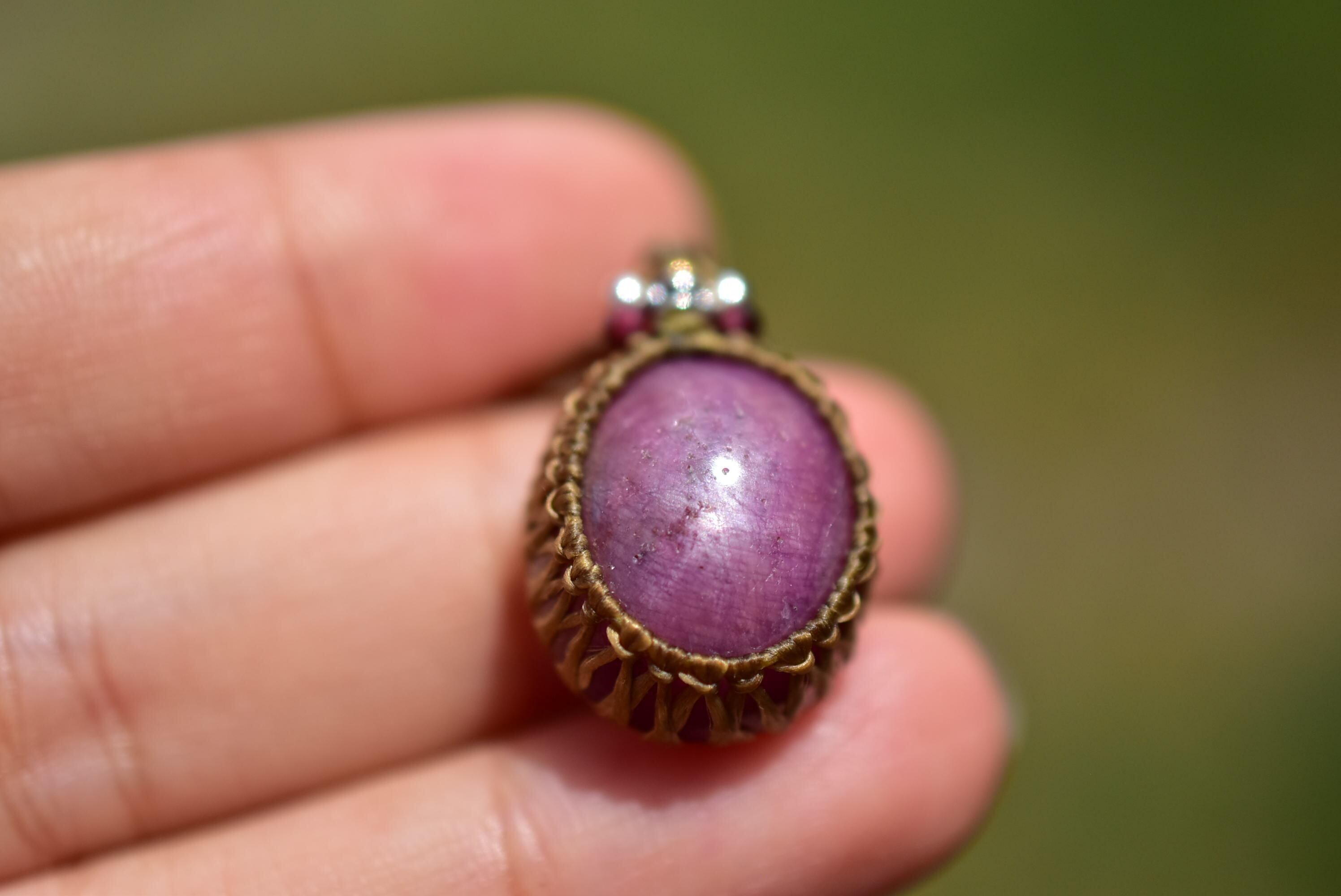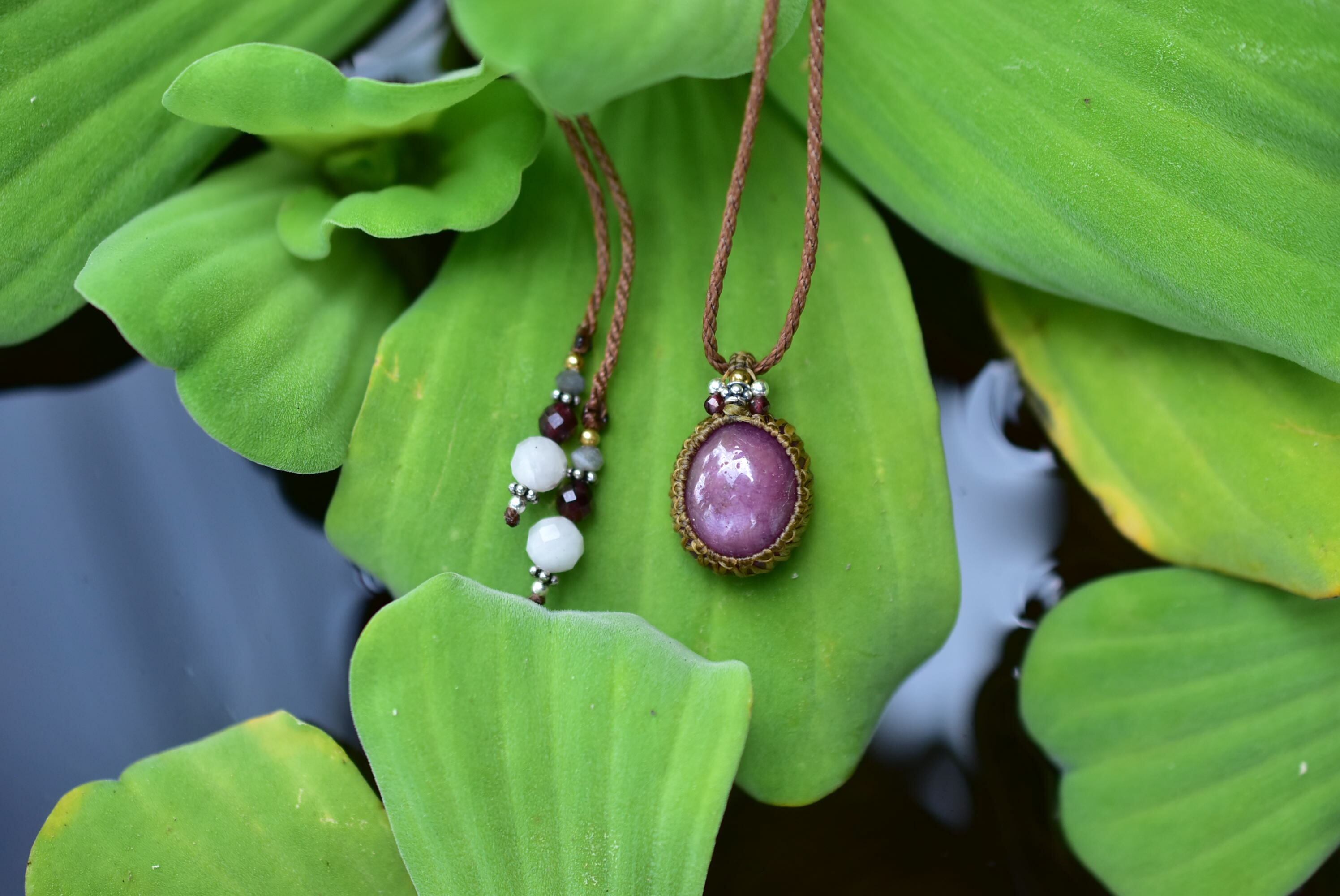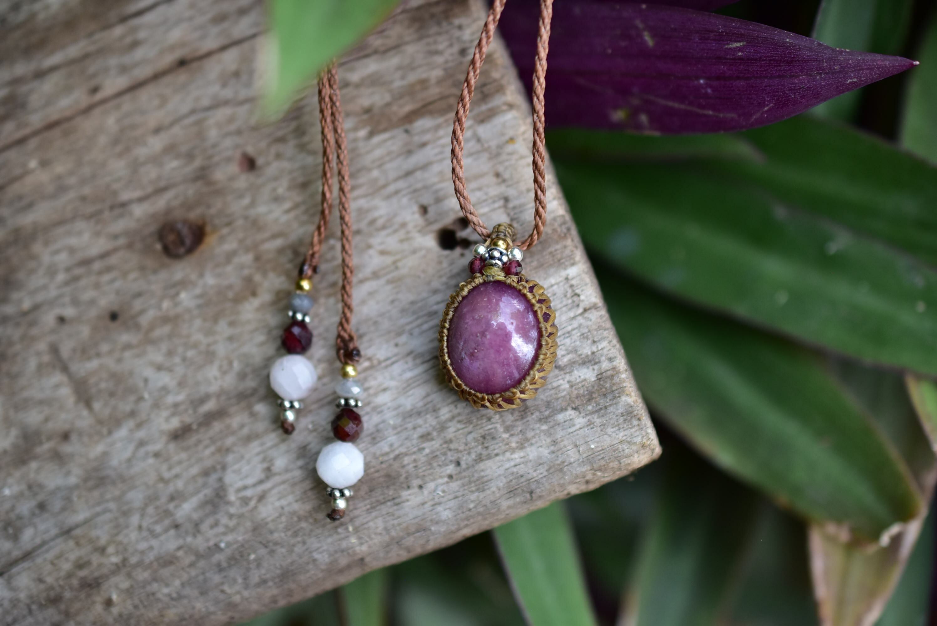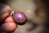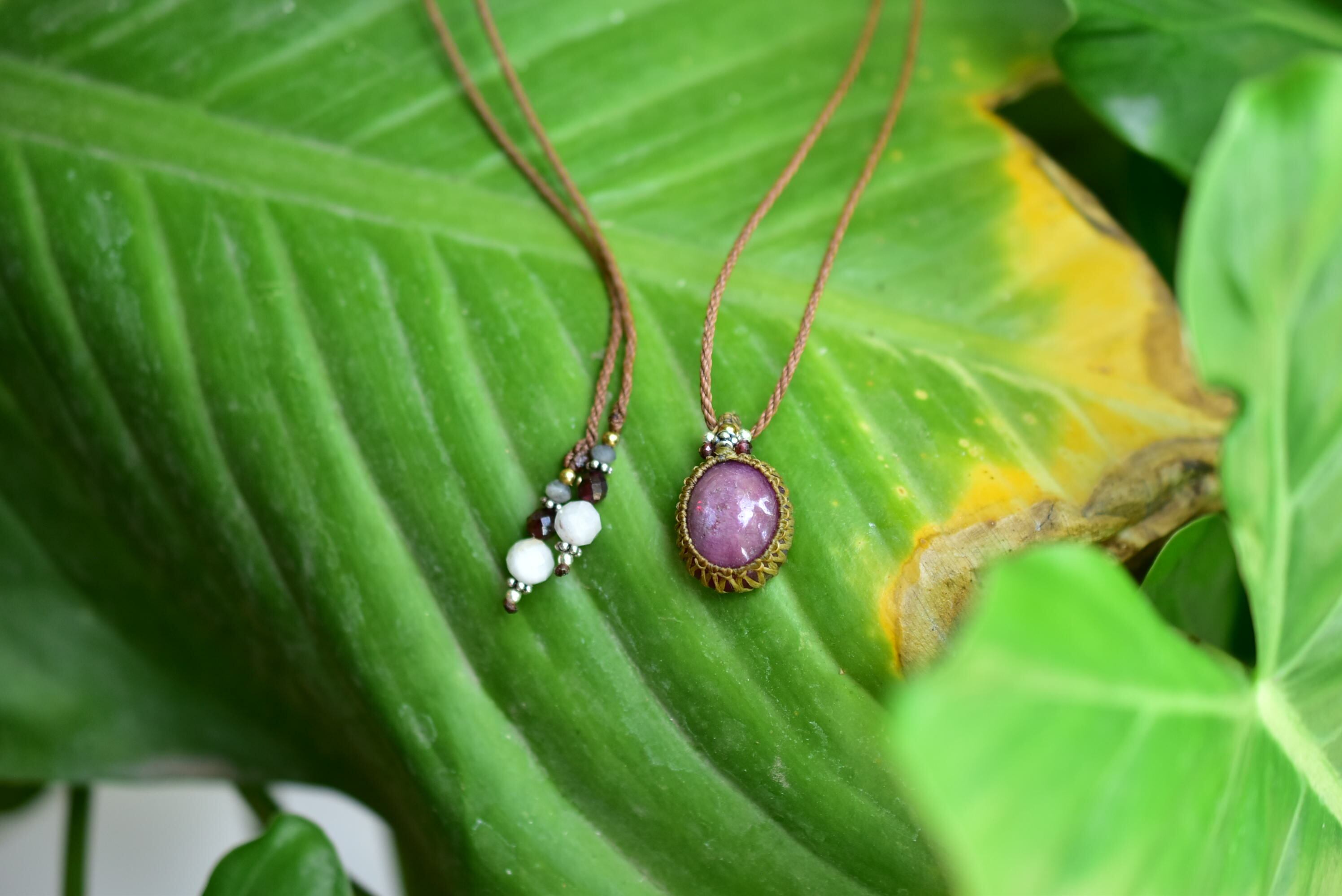 小粒タイプのスタールビーをそのまま小さくマクラメペンダントに仕上げています。