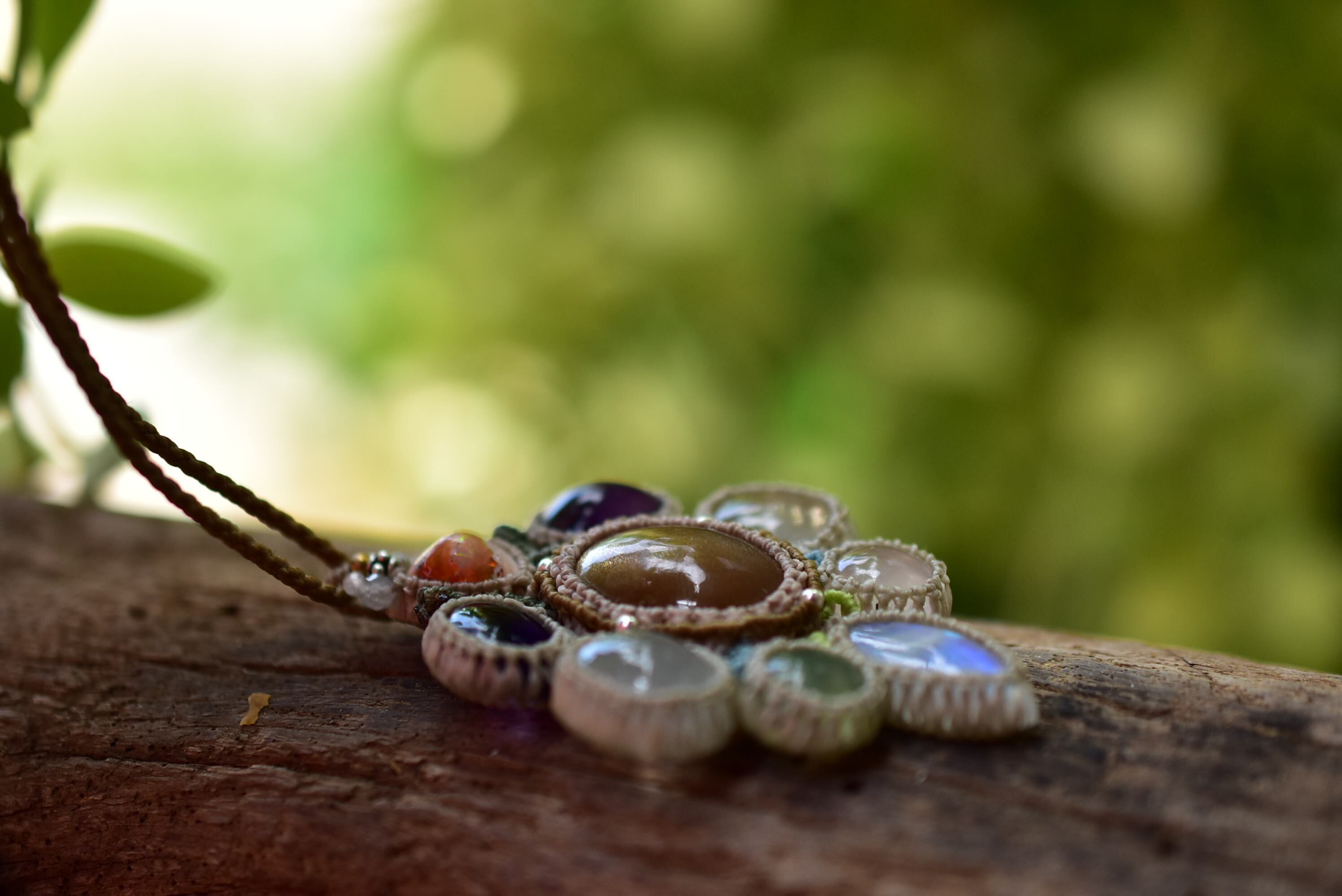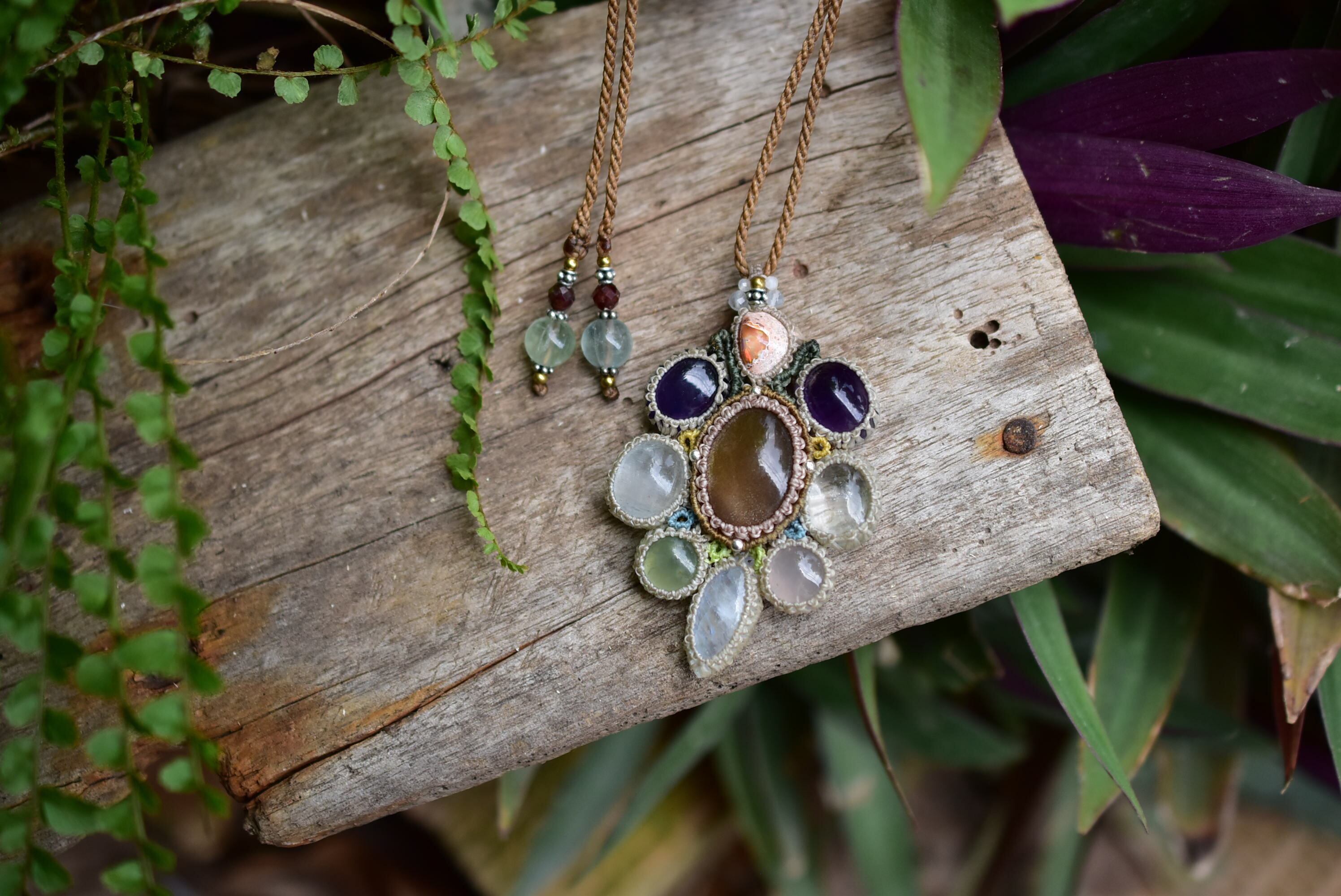 ◆このたびはゴールドブラウン、ヘンプ、グリーン、イエローグリーン、ブルー色の蝋引き糸を使用しマクラメ編み装飾を施しました。