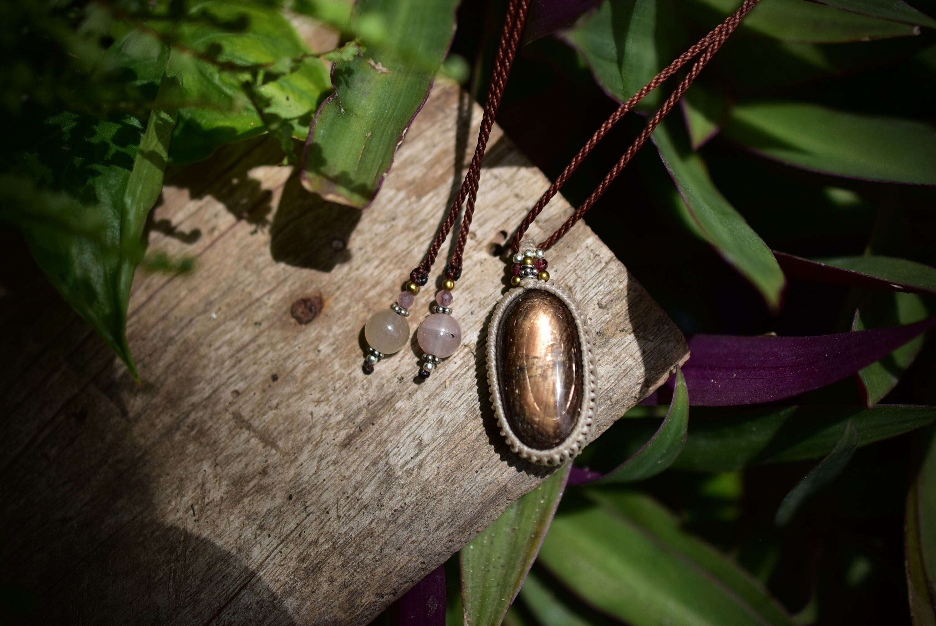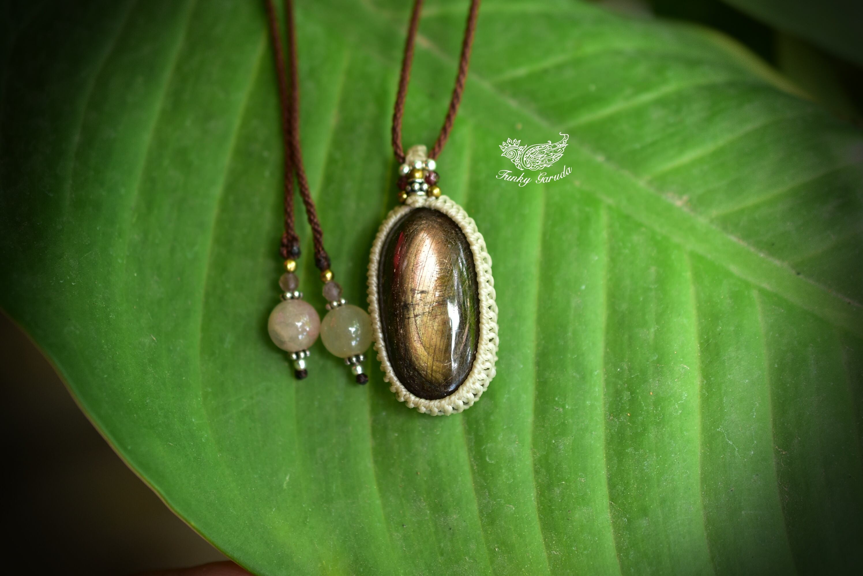 ◆このたびはナチュラルホワイト・ブラウン色の蝋引き糸を使用しマクラメ編み装飾を施しました。