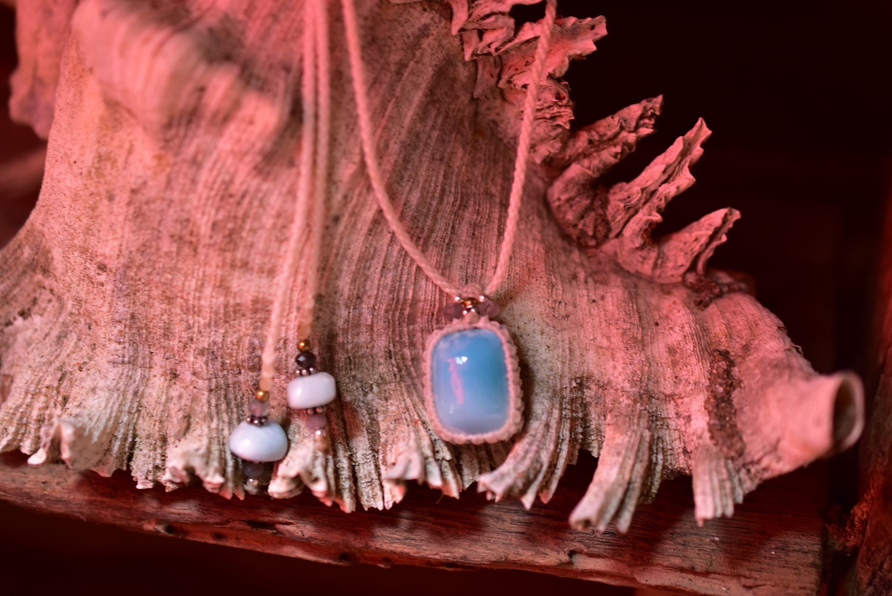 ◆このたびはホワイト色の蝋引き糸を使用しマクラメ編み装飾を施しました。