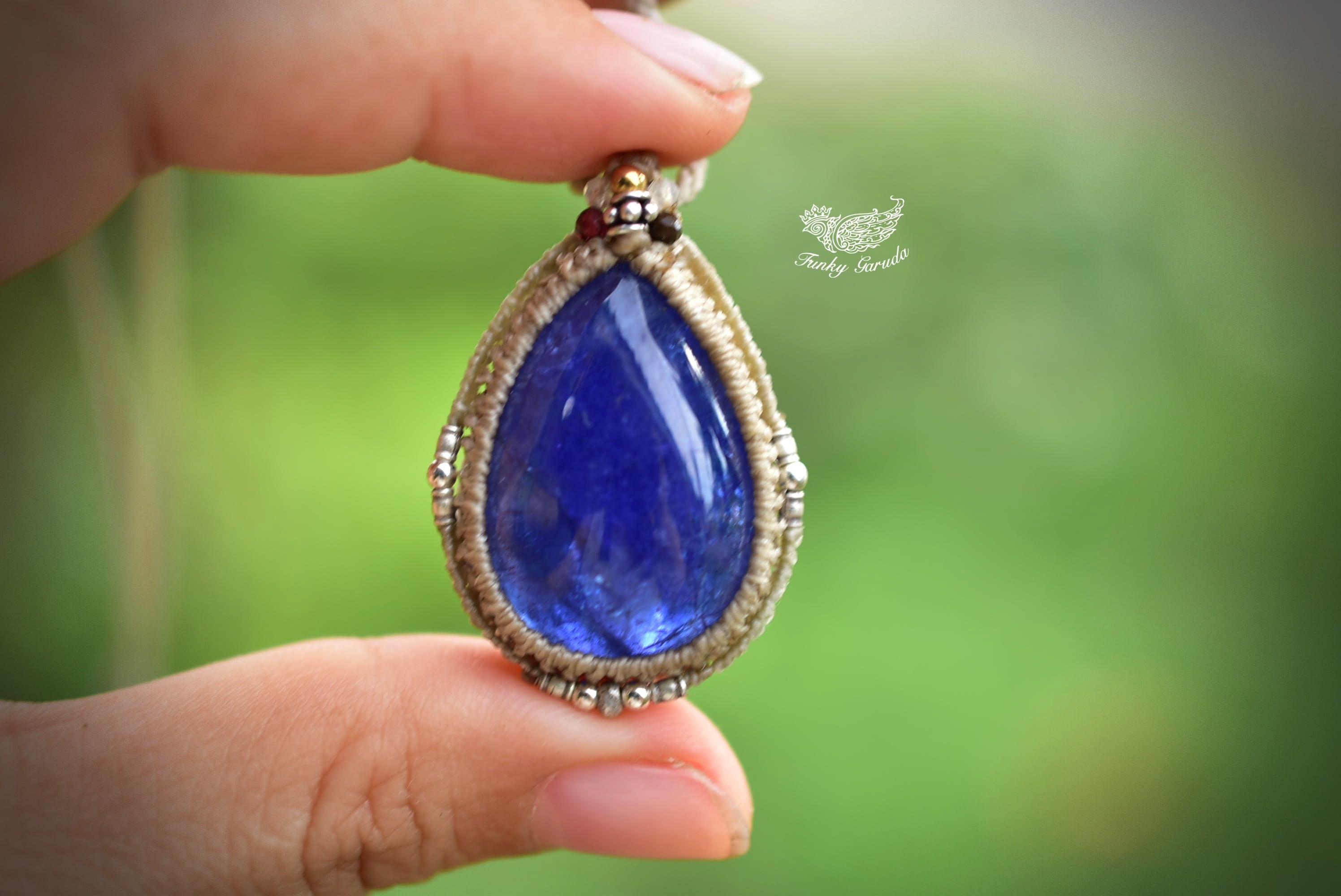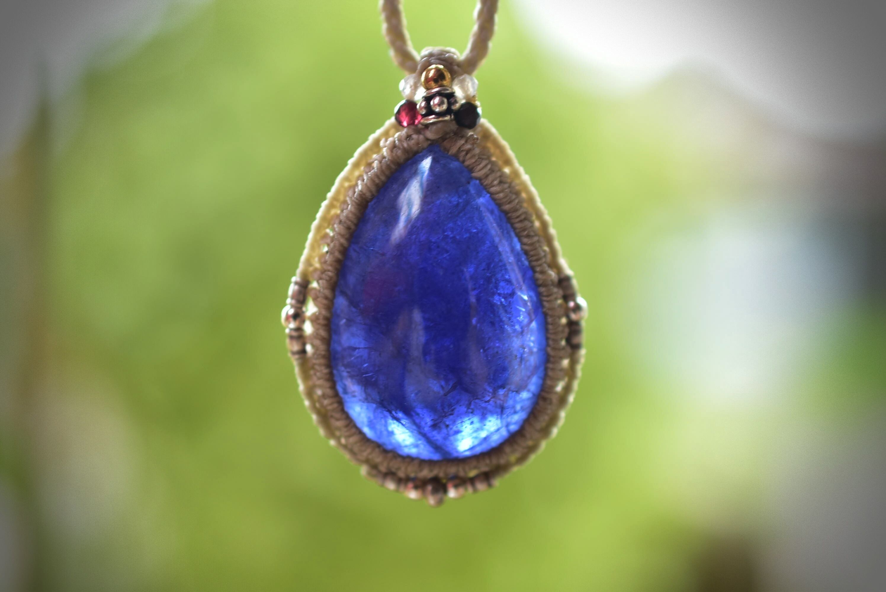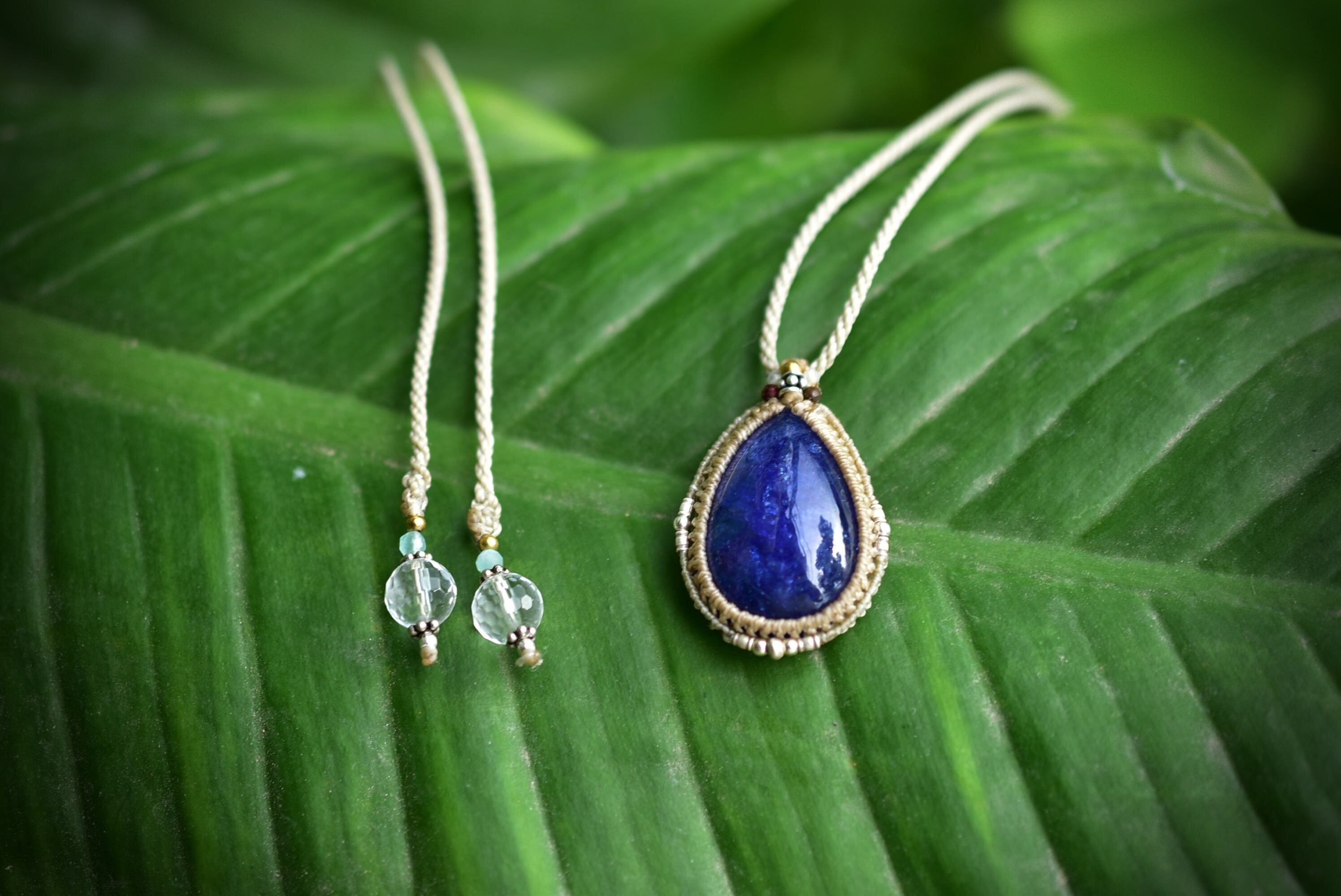 ◆このたびはヘンプ、カフェオレ色の蝋引き糸を使用しマクラメ編み装飾を施しました。