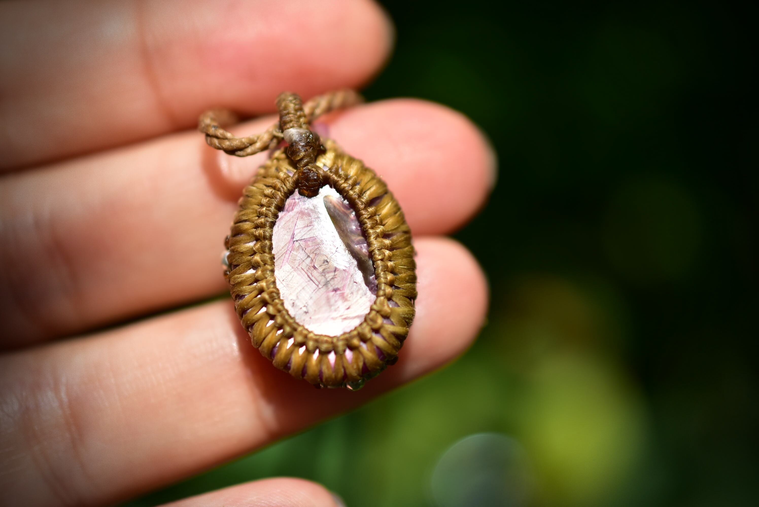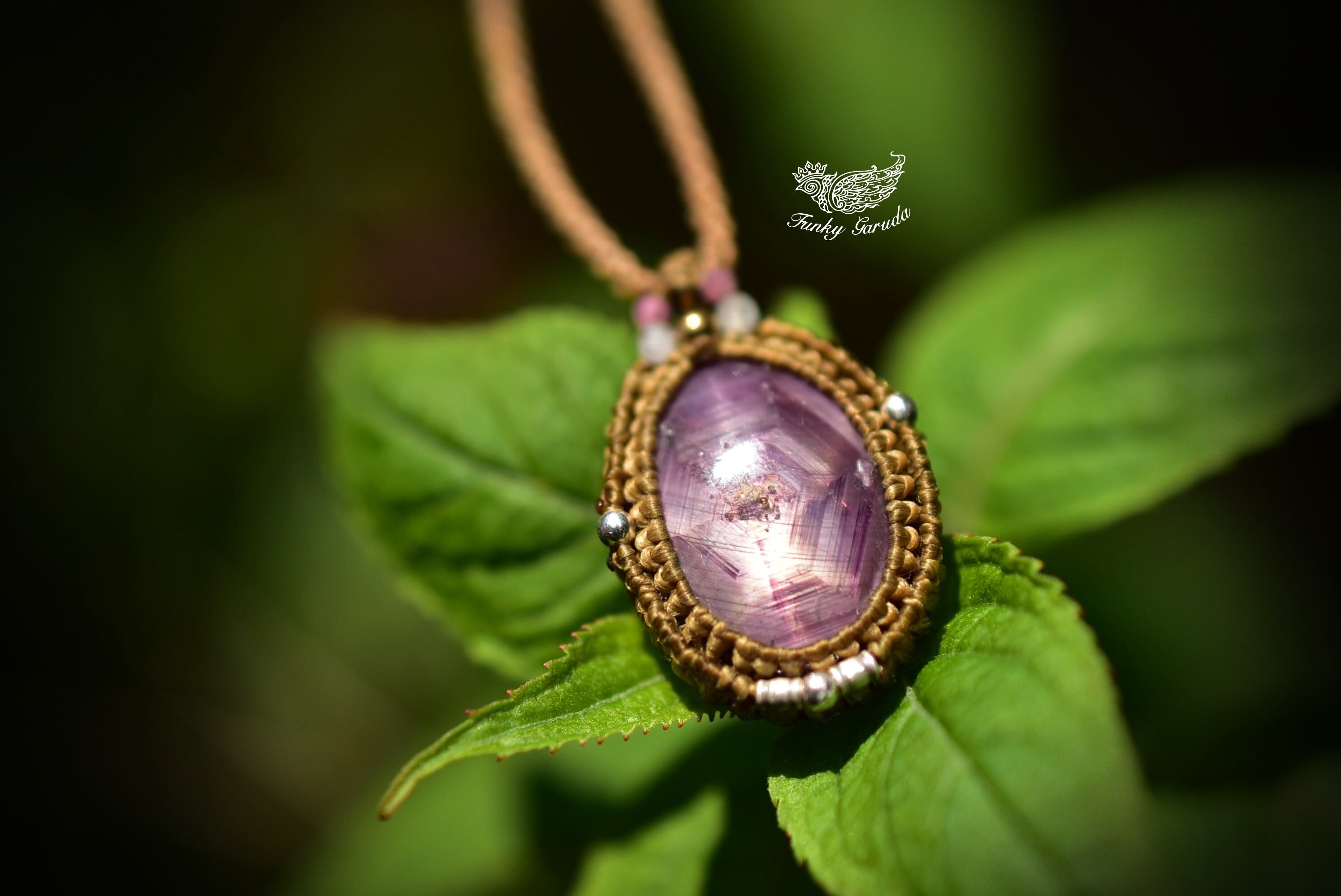 ◆このたびはゴールドブラウン色の蝋引き糸を使用しマクラメ編み装飾を施しました。