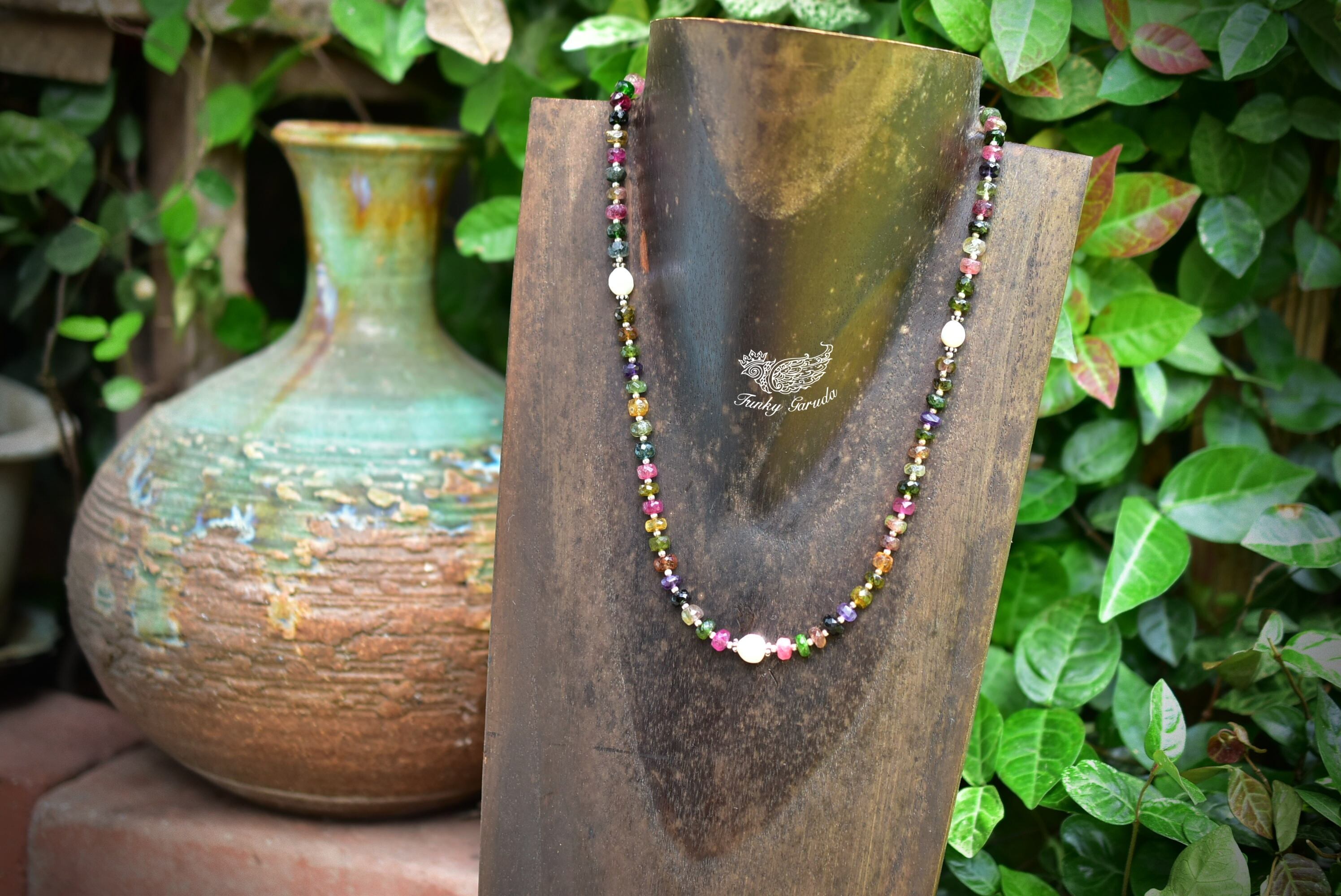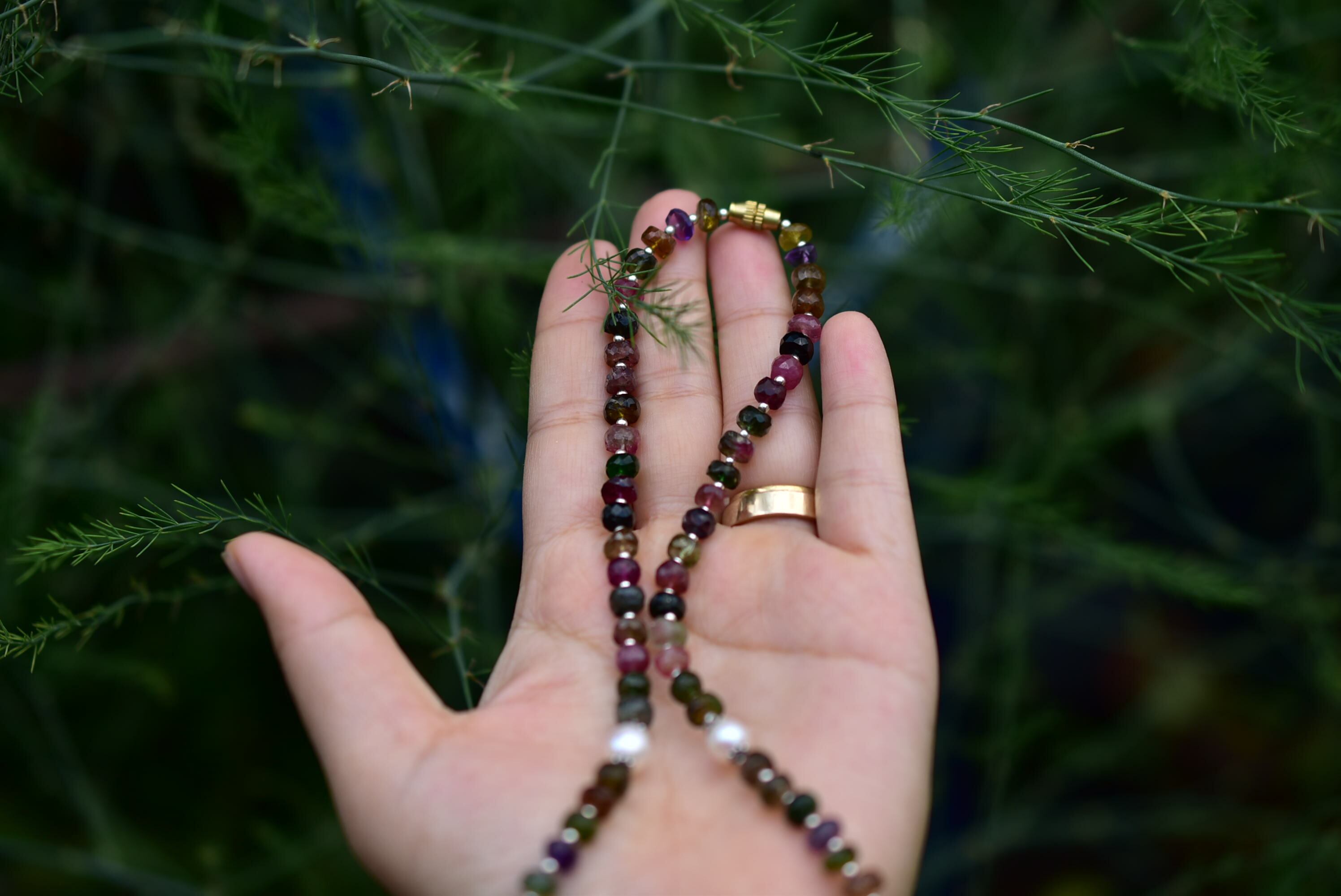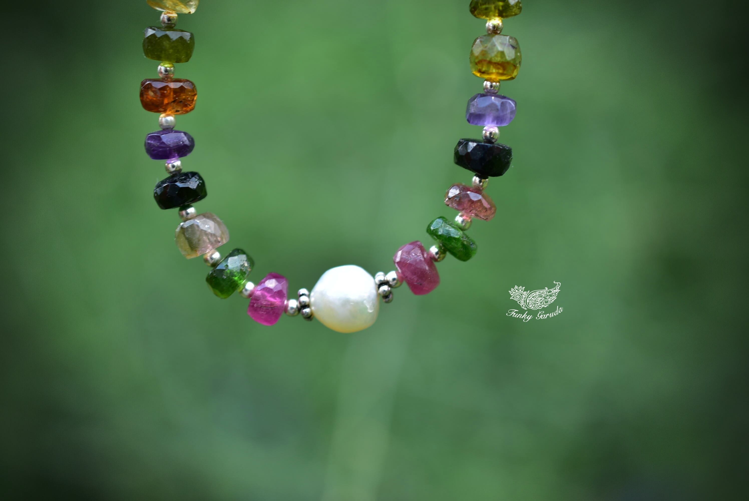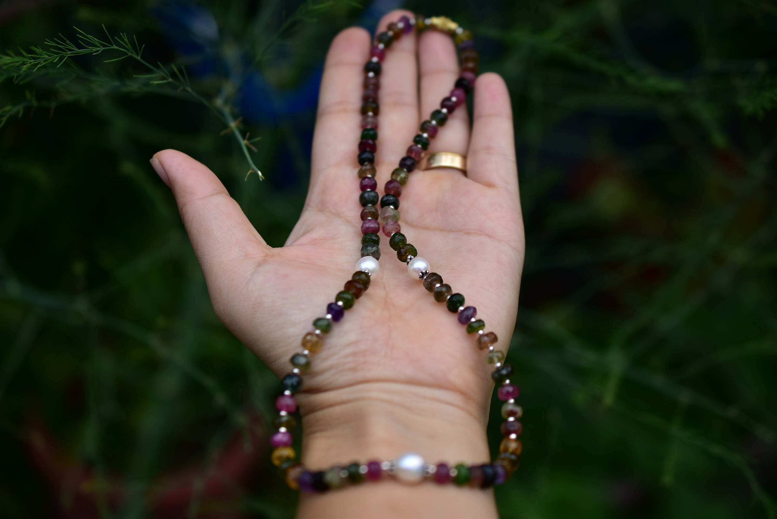 ひと粒ひと粒パールとトルマリンビーズを見立てて