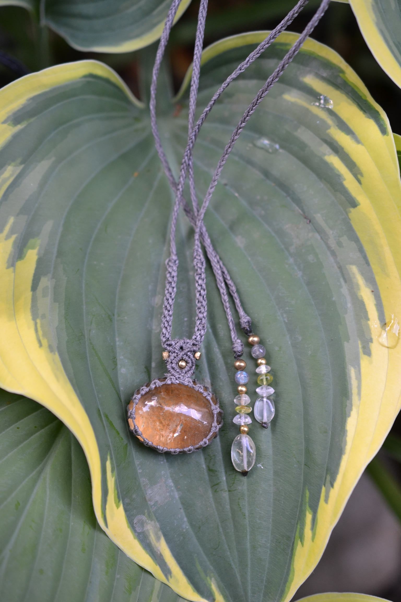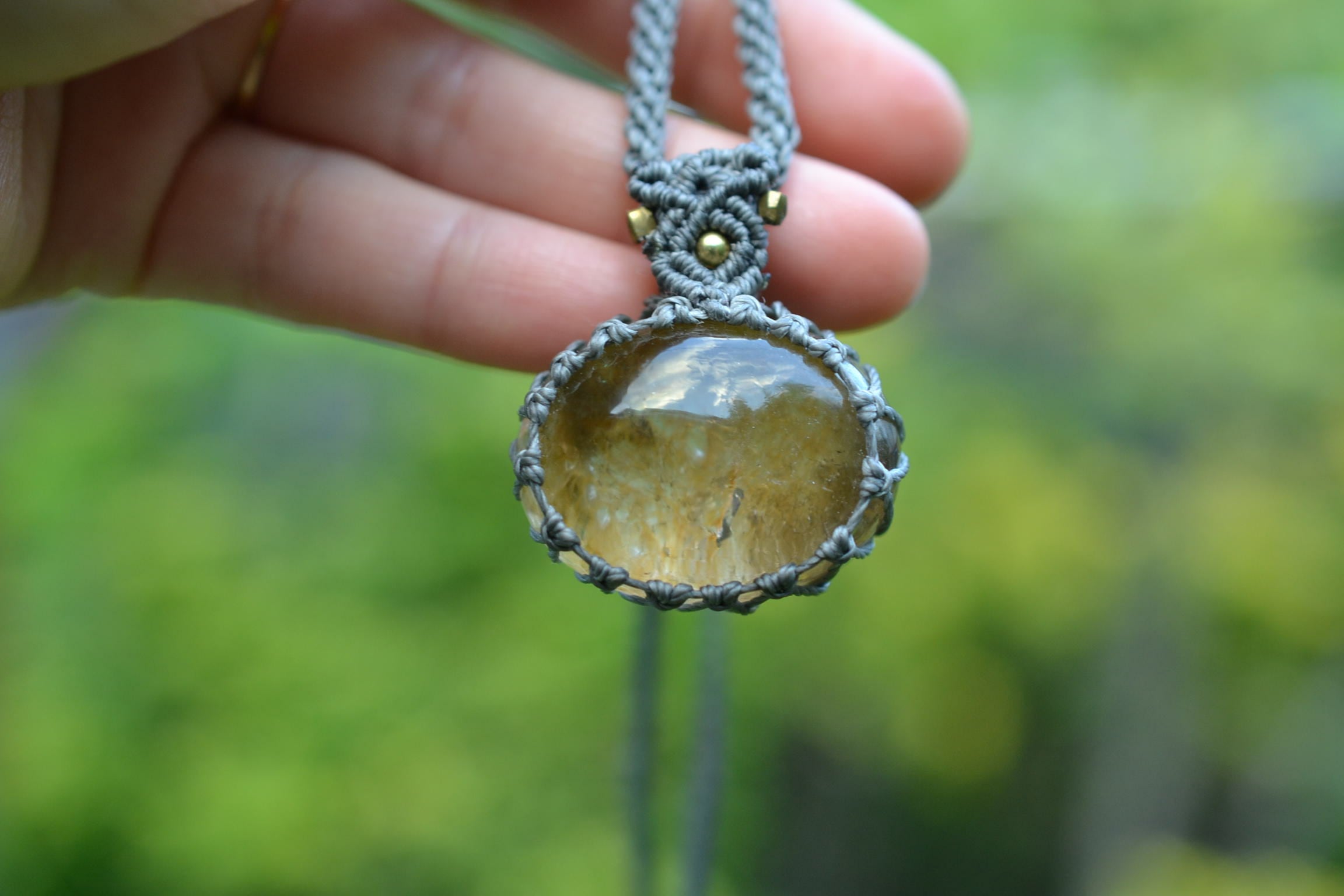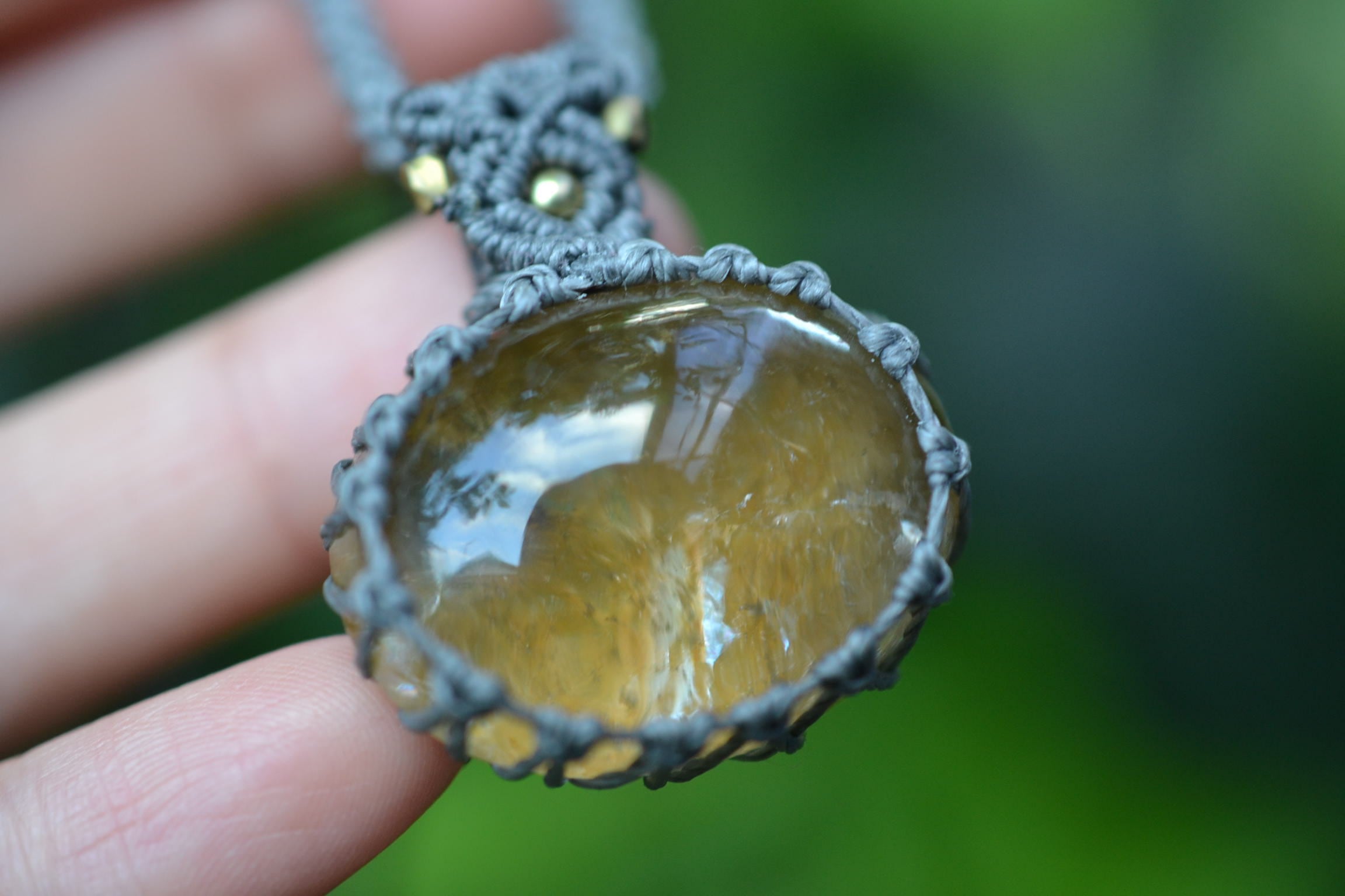 キラキラとしたインクルージョンもしっかり見てとることもできます。ボリュームあるこの石が引き立つようにマクラメ編み装飾を施しました。