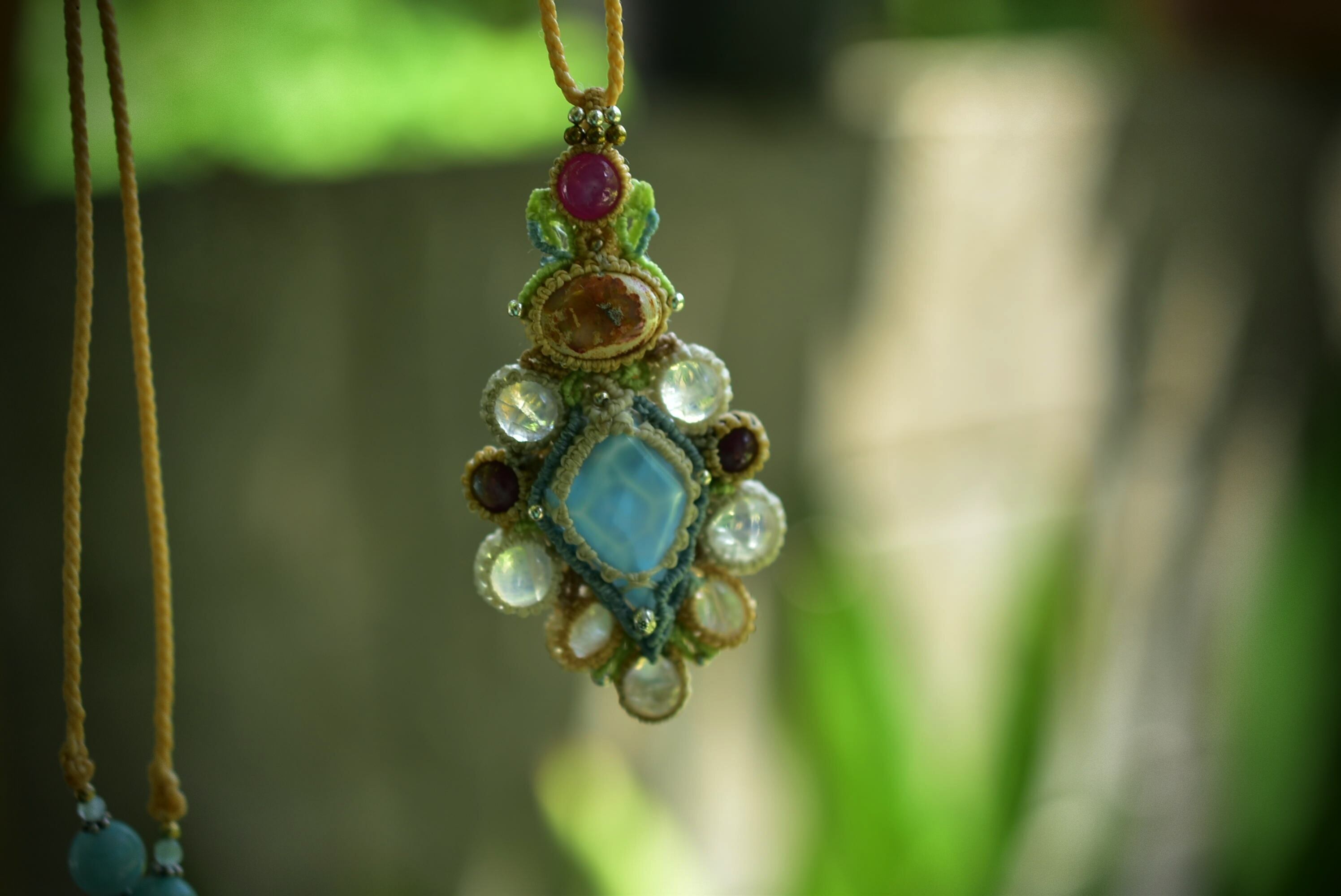 ◆このたびはキャラメル、ブルー、ホワイト、イエローグリーン色の蝋引き糸を使用しマクラメ編み装飾を施しました。