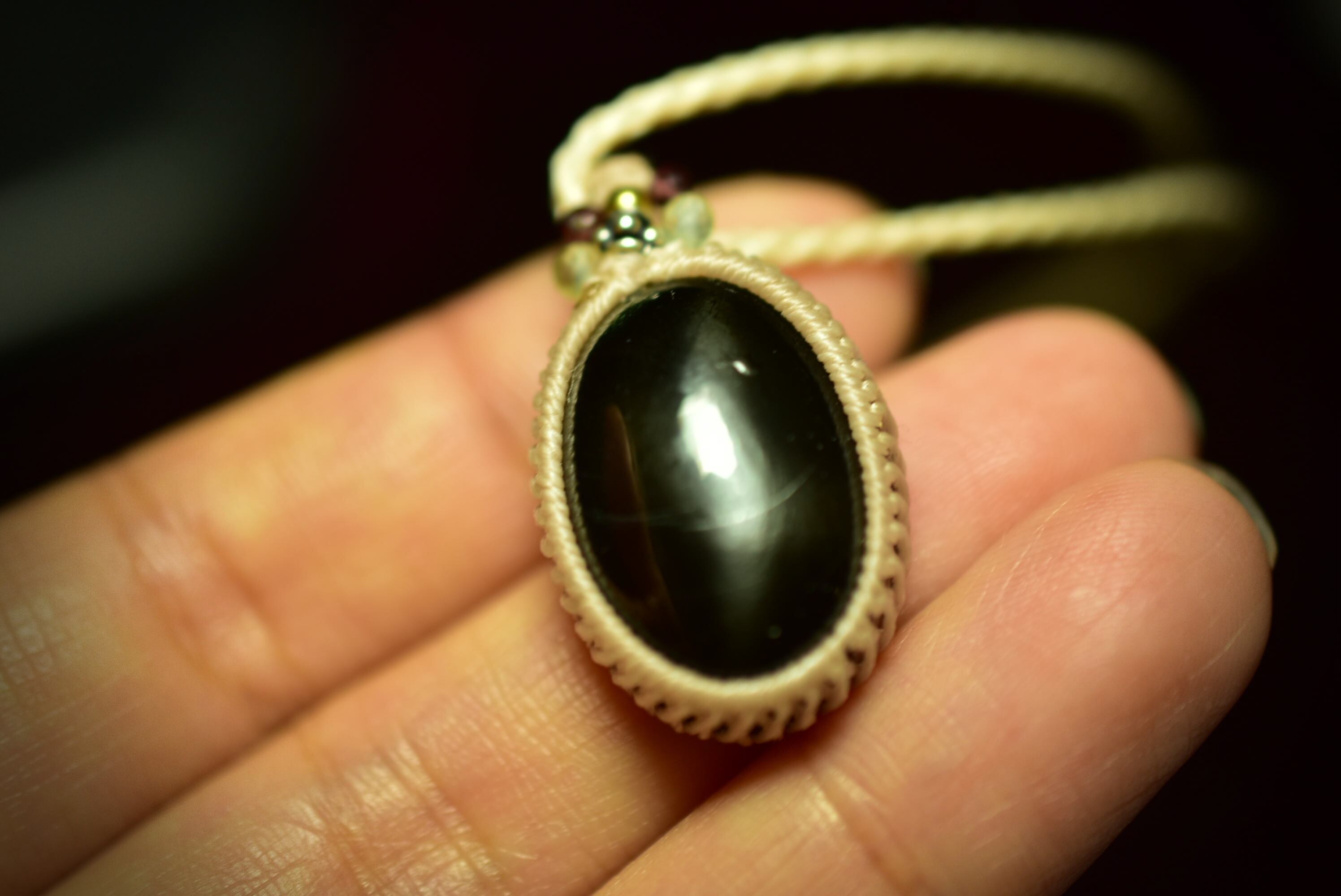 ◆このたびはカフェオレ色の蝋引き糸を使用しマクラメ編み装飾を施しました。